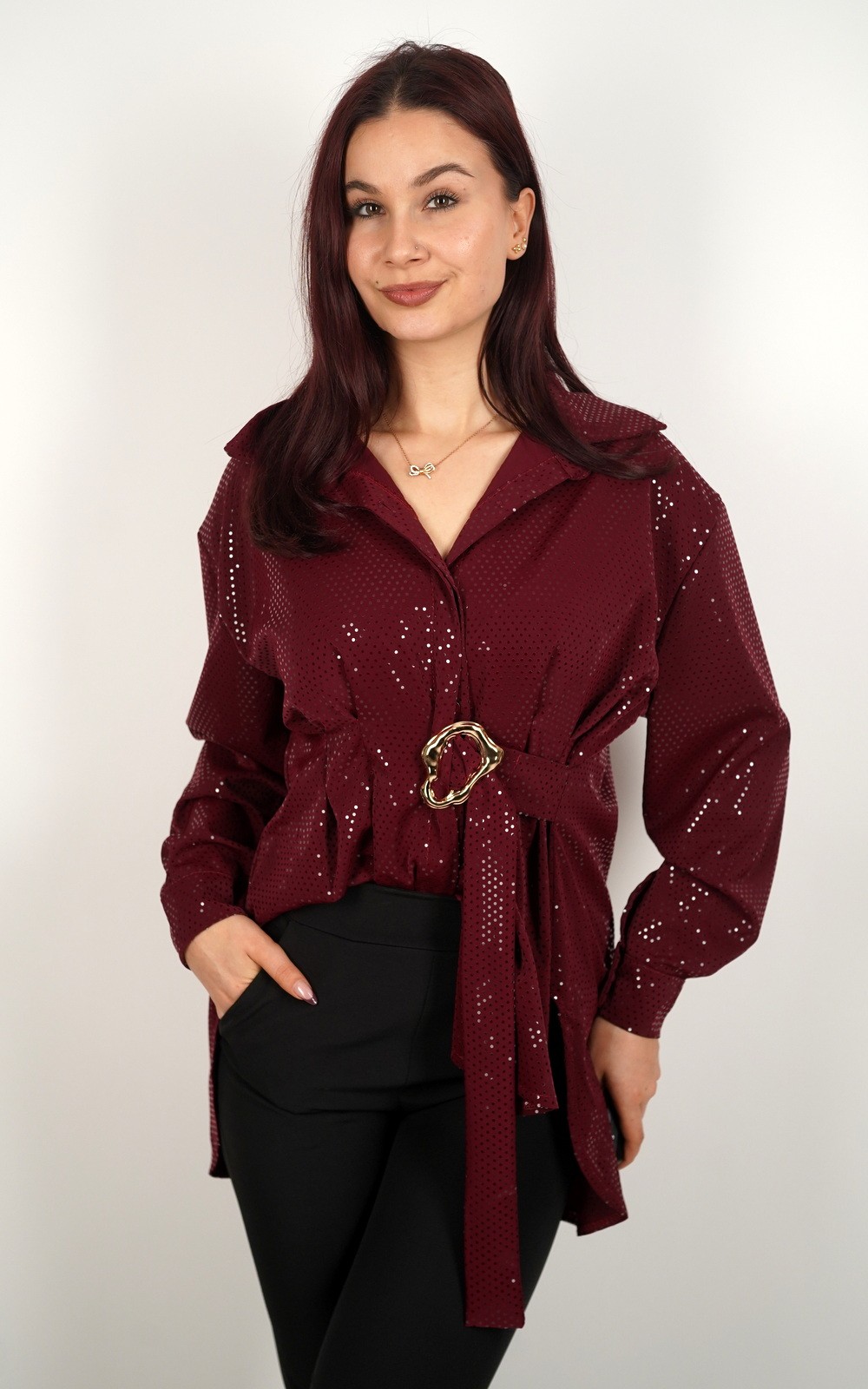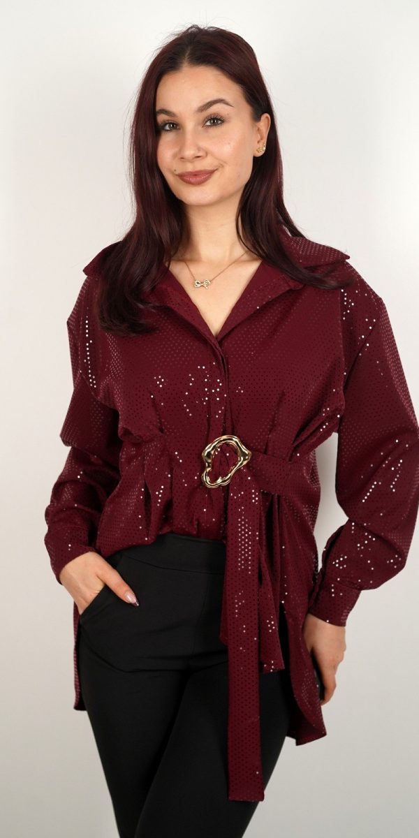 28.00 €Elegantna košulja s vezanjem u struku, ukrašena profinjenim sjajem i dekorativnom zlatnom kopčom. Savršena za…