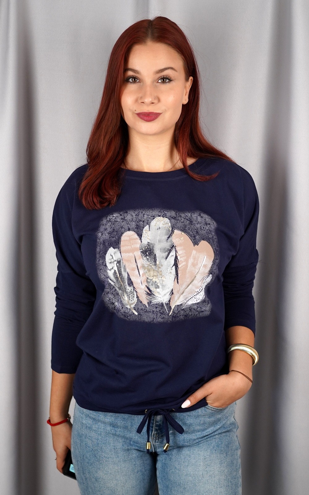 kolekcijaŽenska pamučna majica dugih rukava s printom perja i vezicom u struku – S0453
