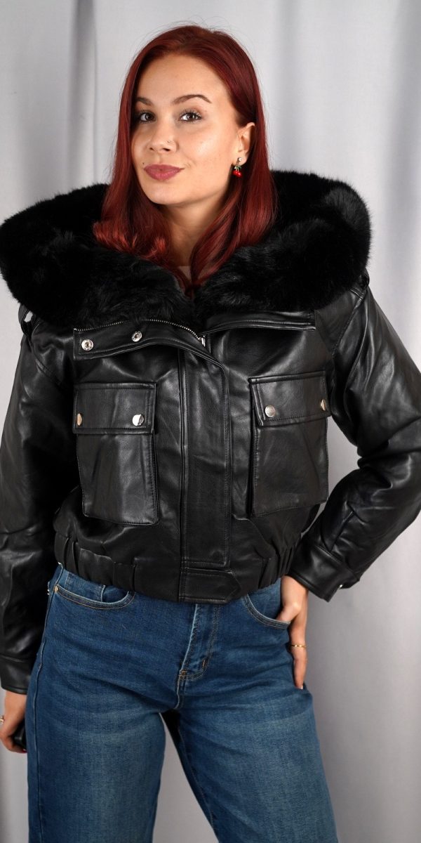 kolekcijaŽenska jakna eko koža s kapuljačom i bogatim krznom – u veličinama – V6372