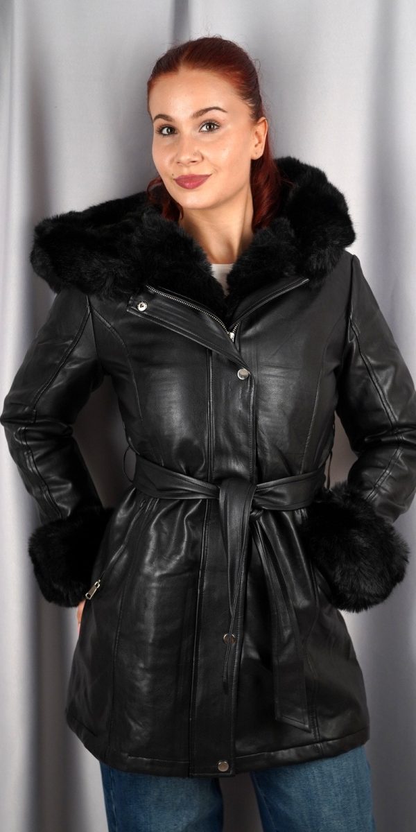 kolekcijaŽenska jakna eko koža s kapuljačom, krznom i vezicom u struku – u veličinama – 6373