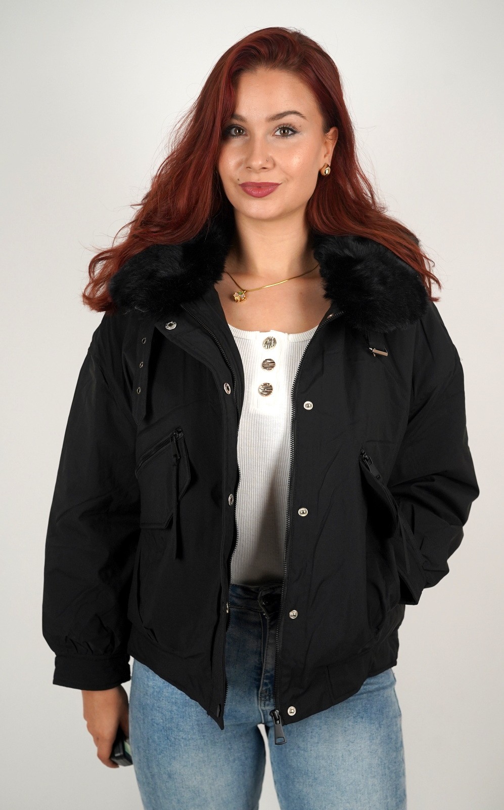 kolekcijaŽenska oversized bomber jakna s krznenim ovratnikom i dekorativnim džepovima – DX8669C