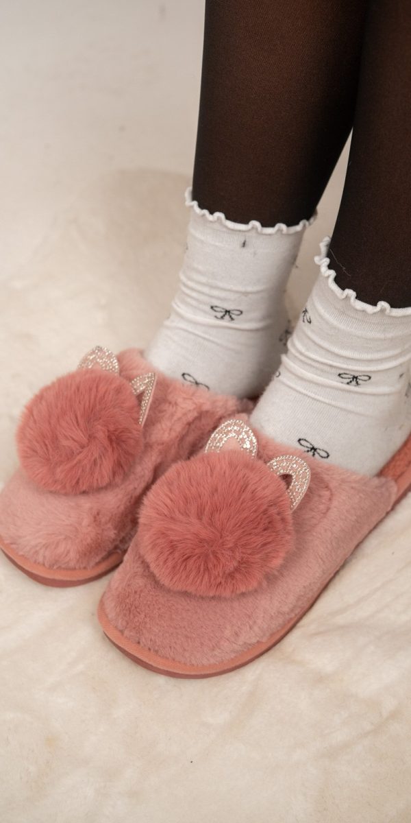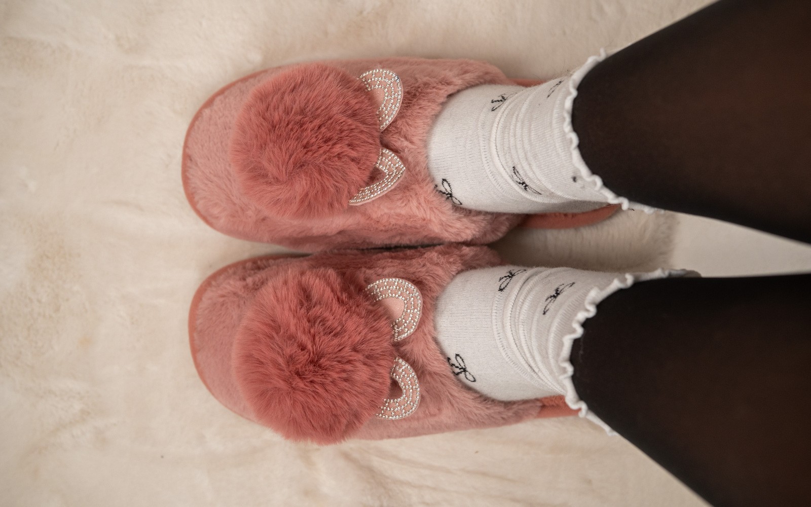 kolekcijaŽenske mekane papuče s puf detaljem i sjajnim dekorom