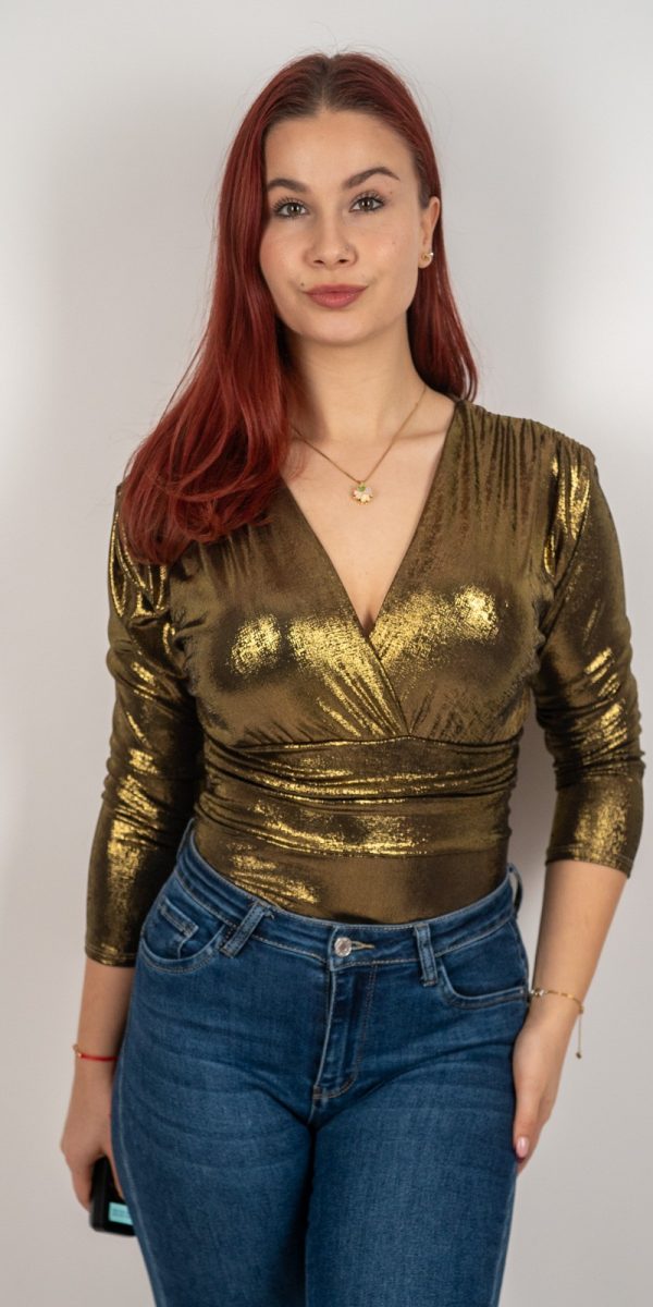 Ženski metalik bodi s preklopnim V-izrezom i efektom sjaja – 18570