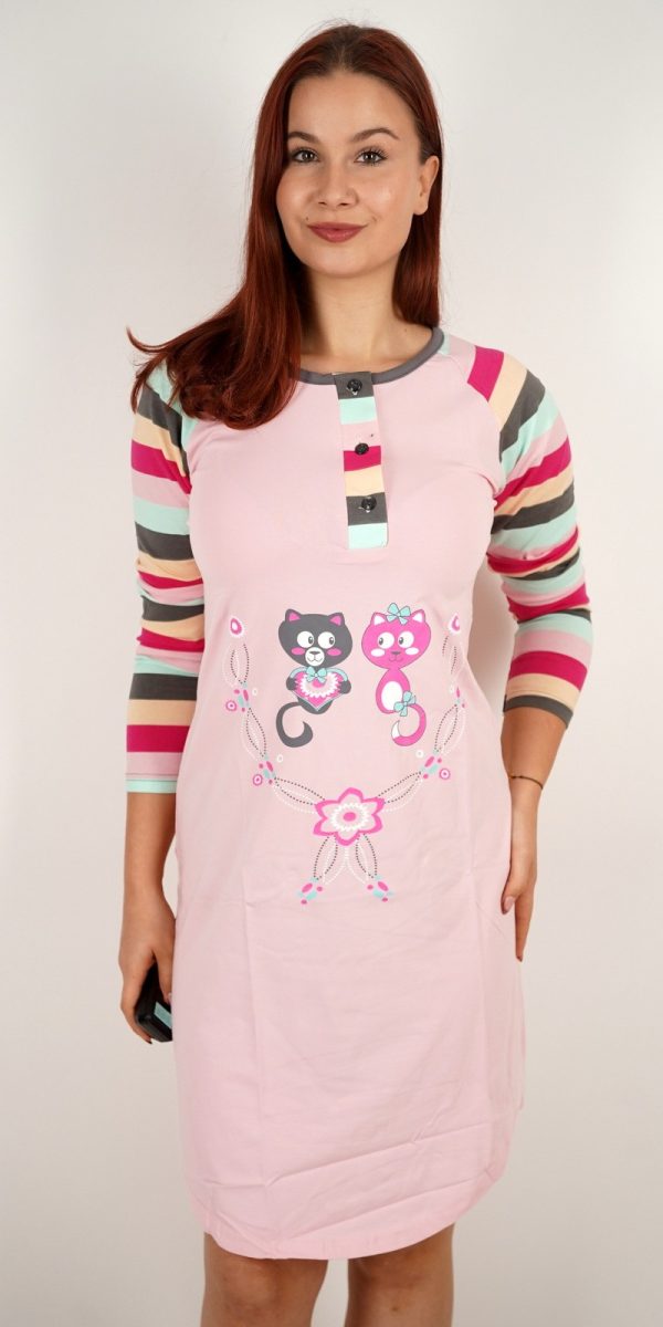 Ženska spavaćica s motivom mačkica i prugastim rukavima – u veličinama – 4203