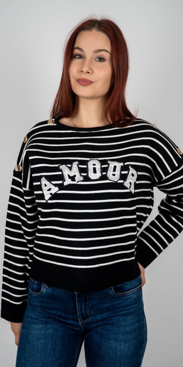 kolekcijaŽenska pletena prugasta majica s gumbićima na ramenima i natpisom – 18-07