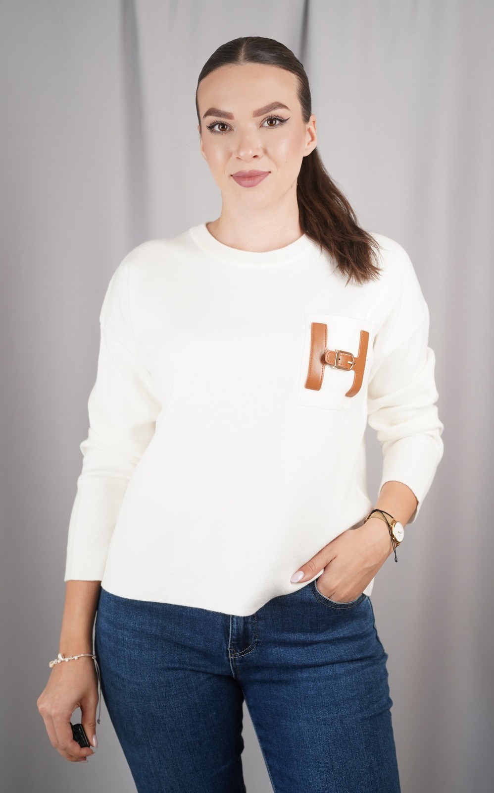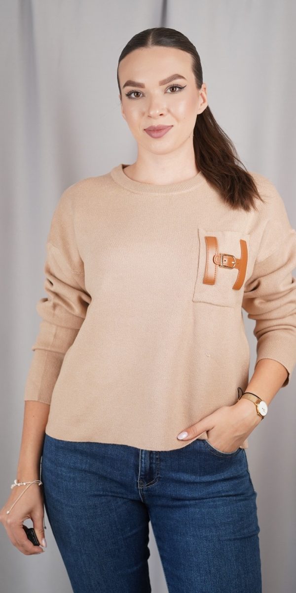 kolekcijaŽenski pleteni pulover s dekorativnim remenom na džepu – CH85748#