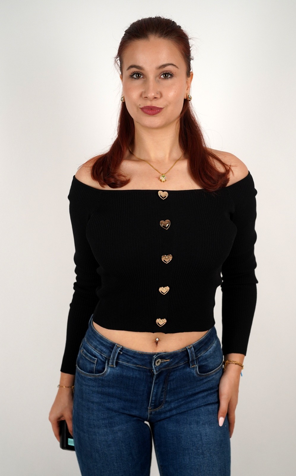 kolekcijaŽenska majica otvorenih ramena s ukrasnim gumbima u obliku srca – PE133