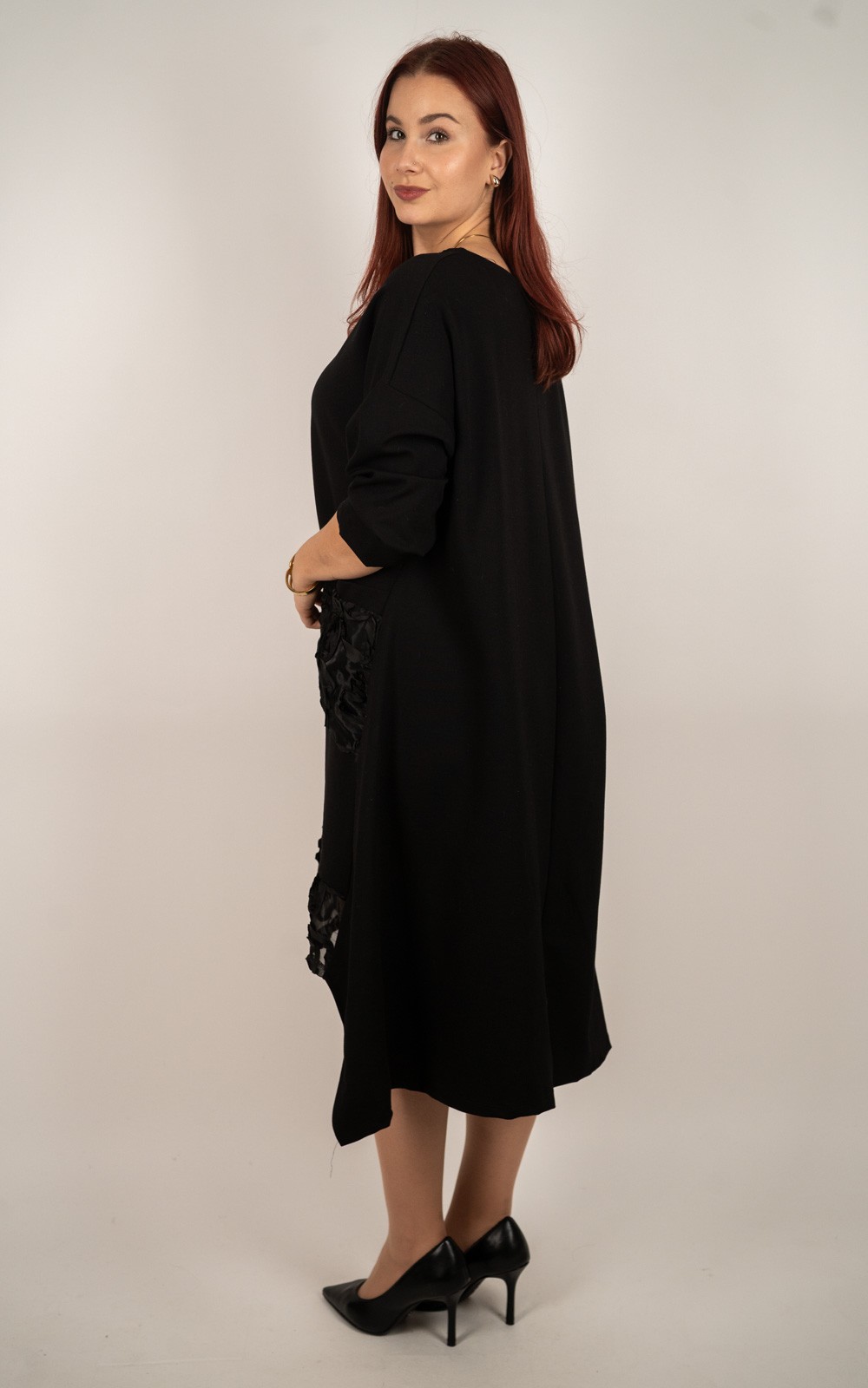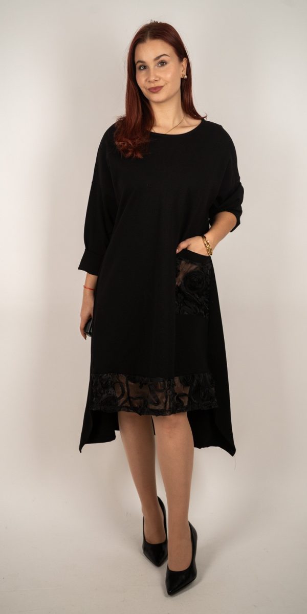 kolekcijaŽenska elegantna crna haljina s čipkastim detaljima i asimetričnim rubom – 51239