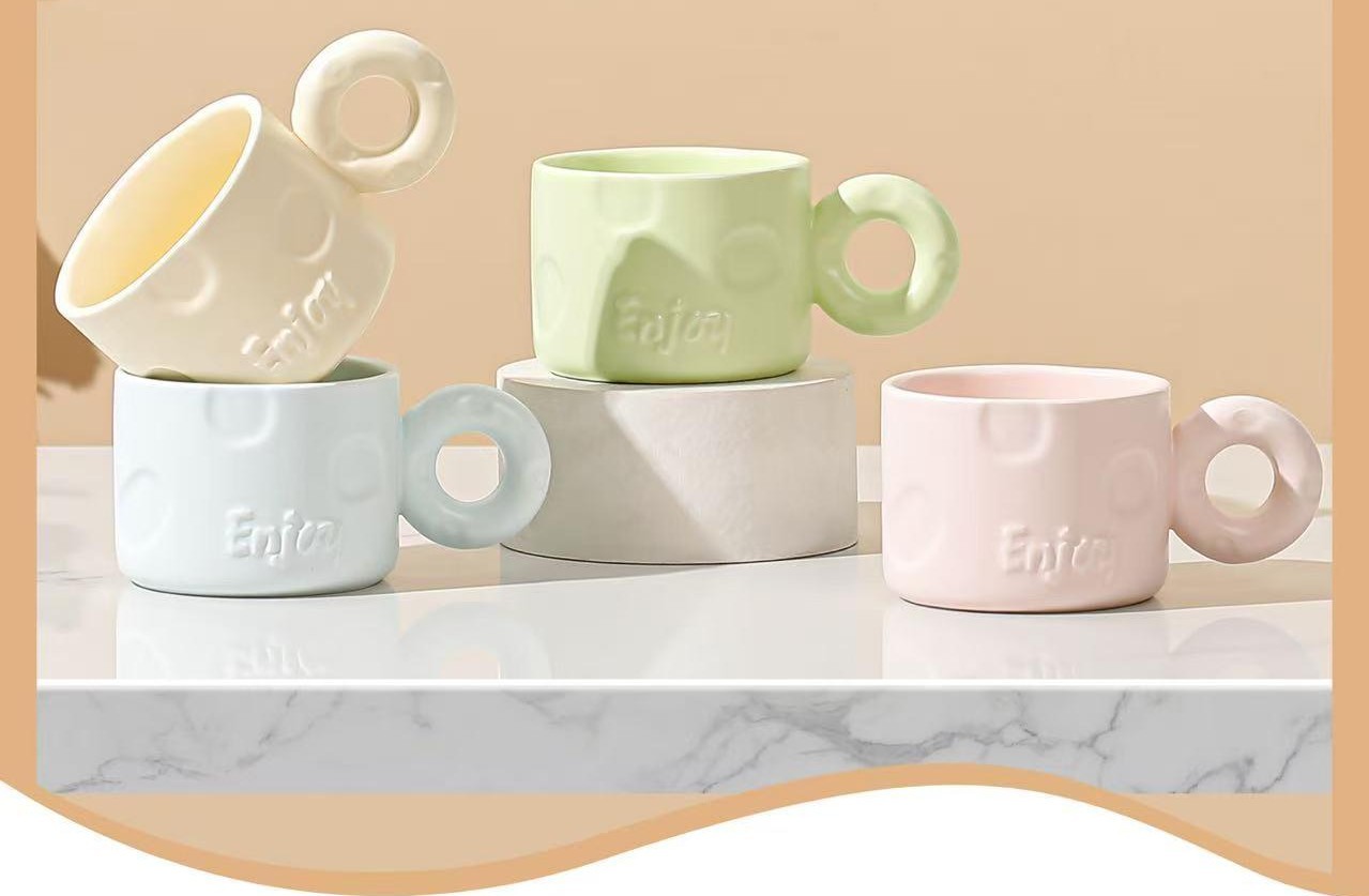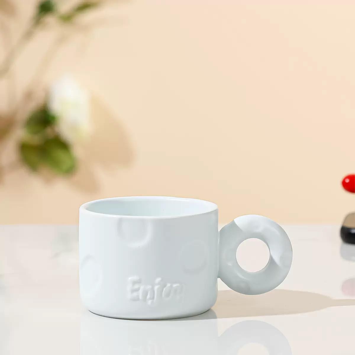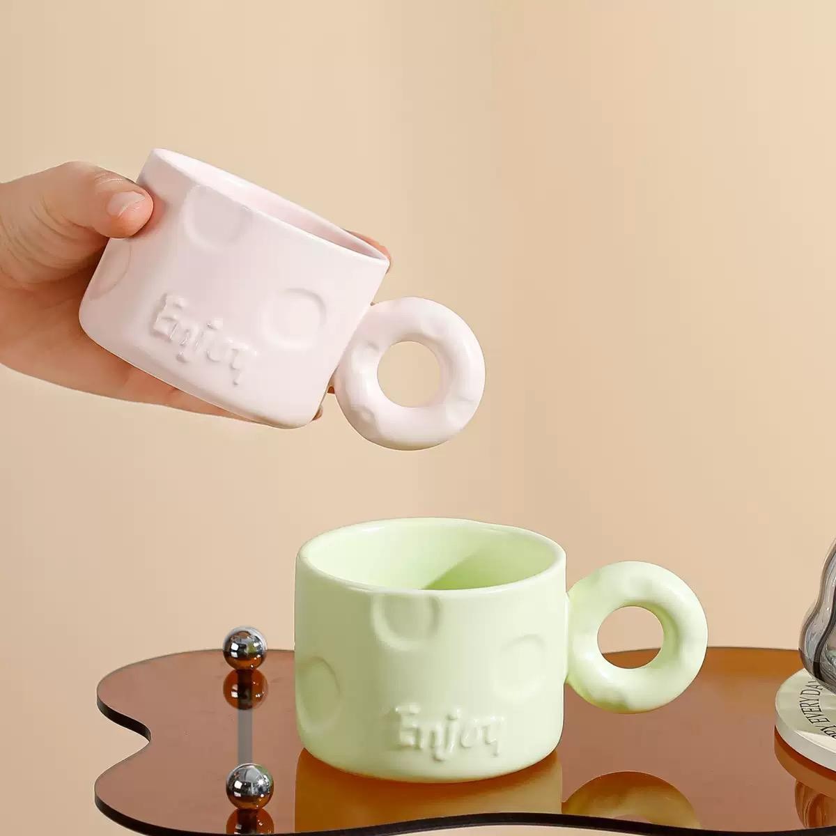 bozic15 očekuje te snižena cijena od 5.10 € za ovaj artikl u košarici.Keramičke šalice kapaciteta 250 ml s upečatljivom okruglom ručkom donose dašak modernog minimalizma u svakodnevnu upotrebu. Njihov jednostavan, ali inovativan dizajn naglašava eleganciju i funkcionalnost, dok reljefni natpis “Enjoy” i diskretni kružni uzorci dodaju posebnu estetsku vrijednost.
