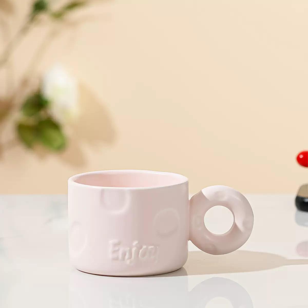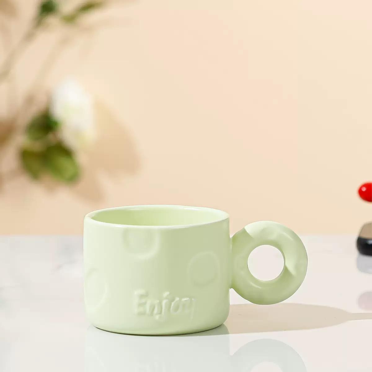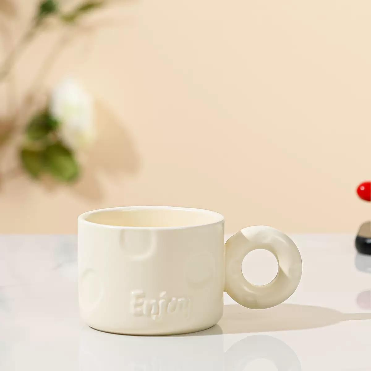 bozic15 očekuje te snižena cijena od 5.10 € za ovaj artikl u košarici.Keramičke šalice kapaciteta 250 ml s upečatljivom okruglom ručkom donose dašak modernog minimalizma u svakodnevnu upotrebu. Njihov jednostavan, ali inovativan dizajn naglašava eleganciju i funkcionalnost, dok reljefni natpis “Enjoy” i diskretni kružni uzorci dodaju posebnu estetsku vrijednost.