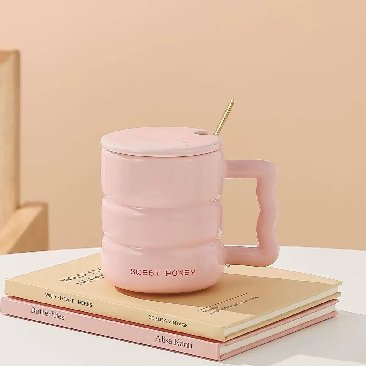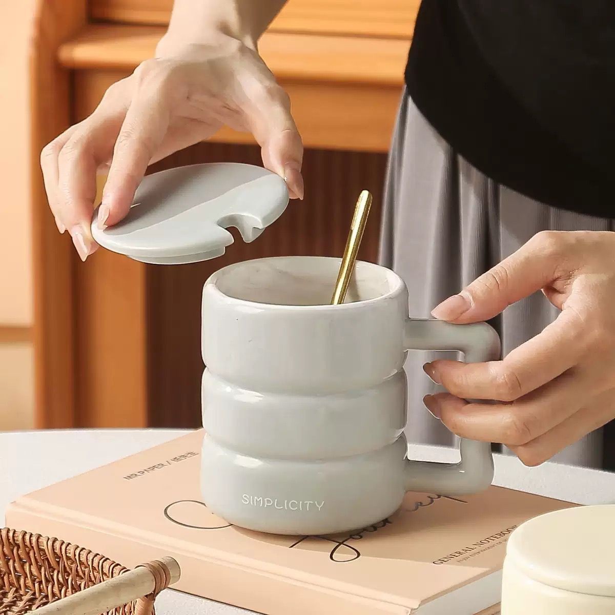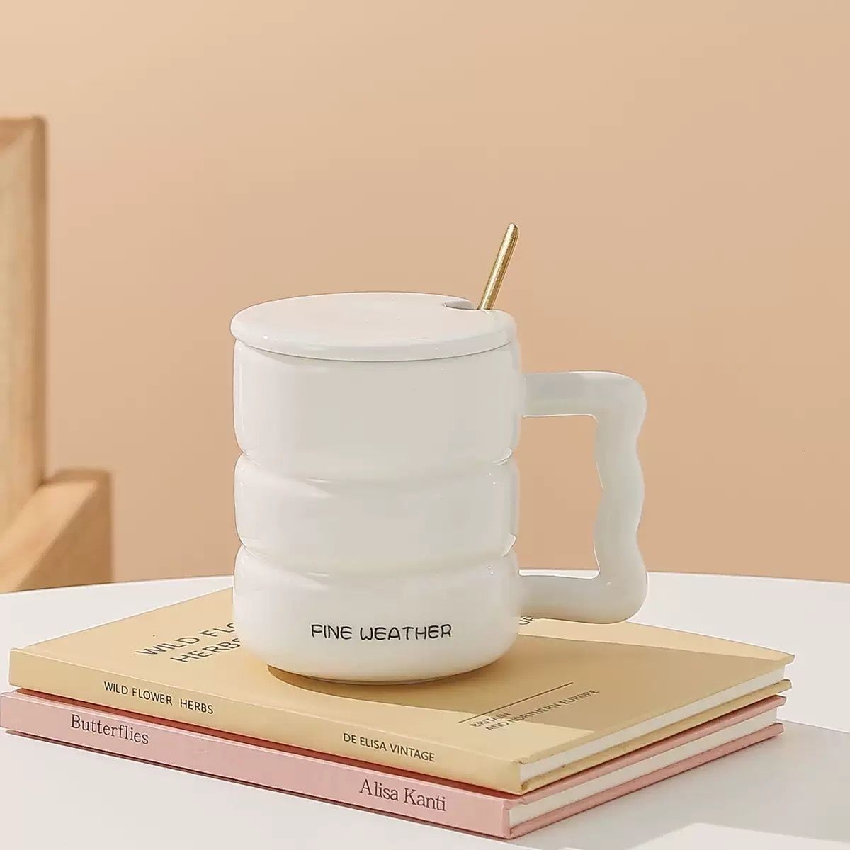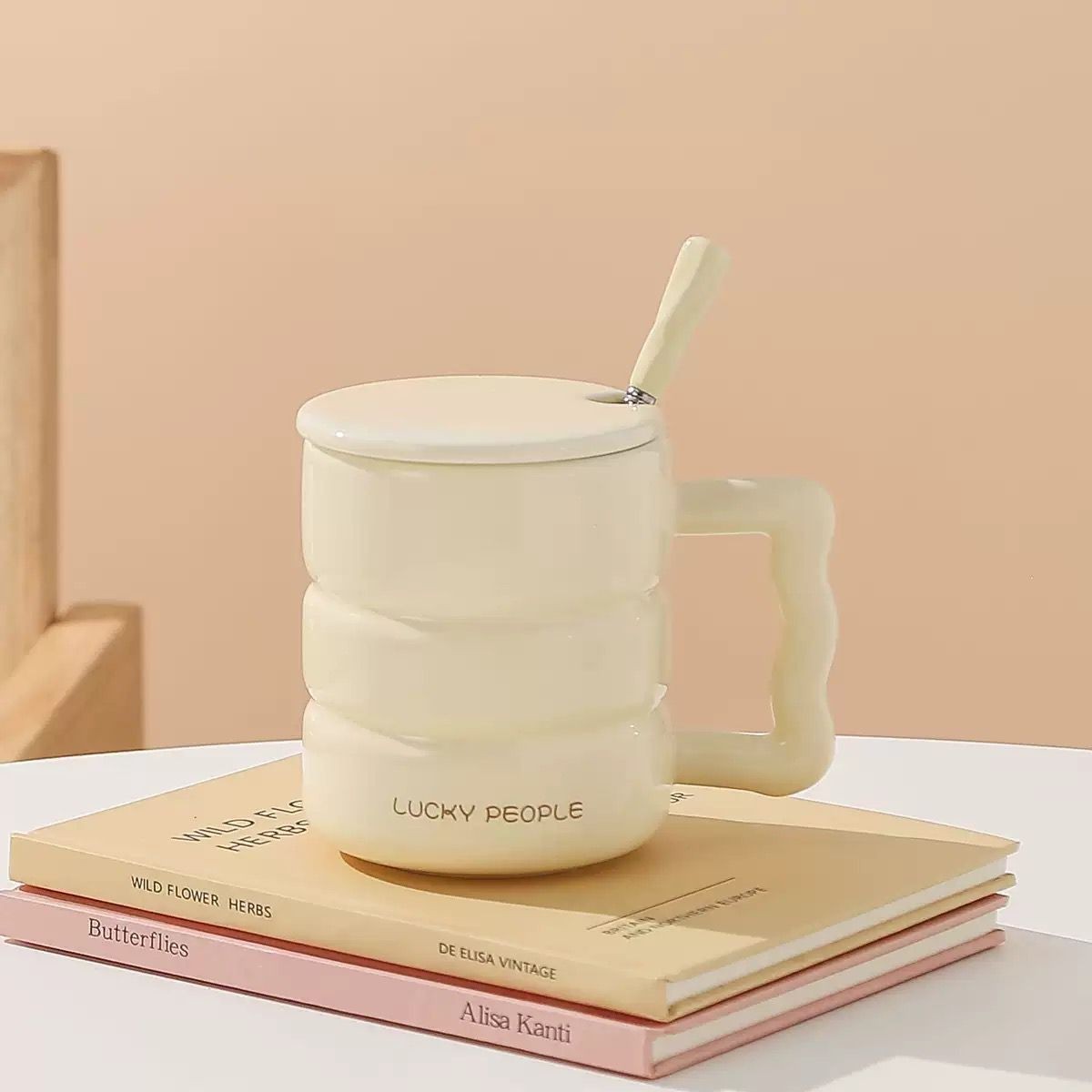 Keramička šalica s poklopcem i žličicom 400 ml – valoviti dizajn