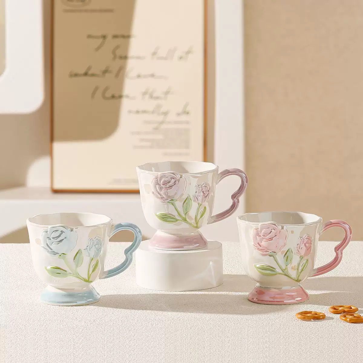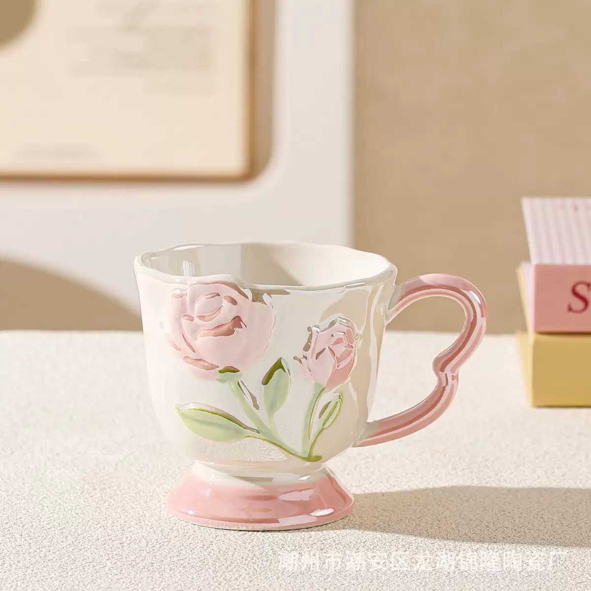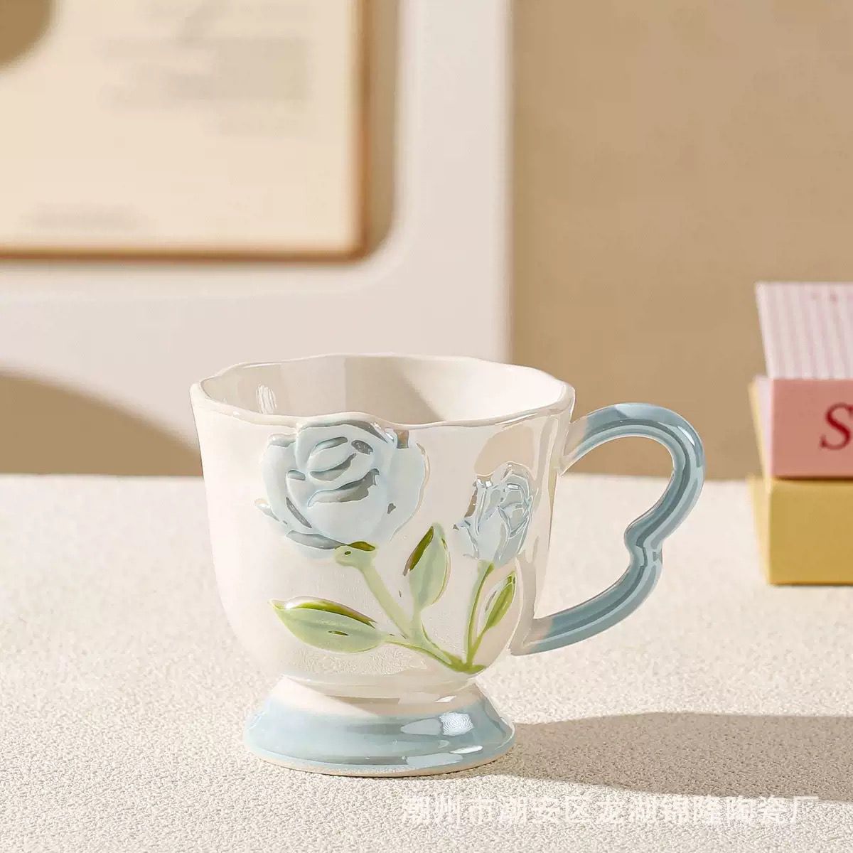Keramička šalica s reljefnim ružama i dekorativnom ručkom