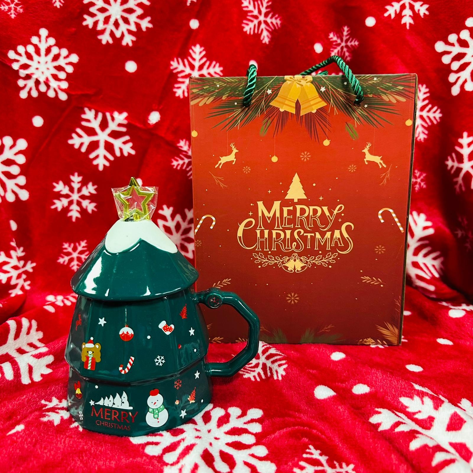 Keramička šalica u obliku božićnog drvca sa žlicom i poklopcem