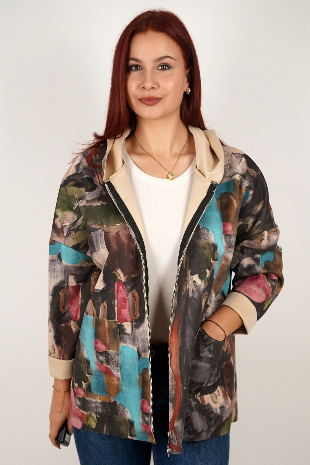 kolekcijaŽenska jakna brušena eko koža s apstraktnim uzorkom i kapuljačom – 5075