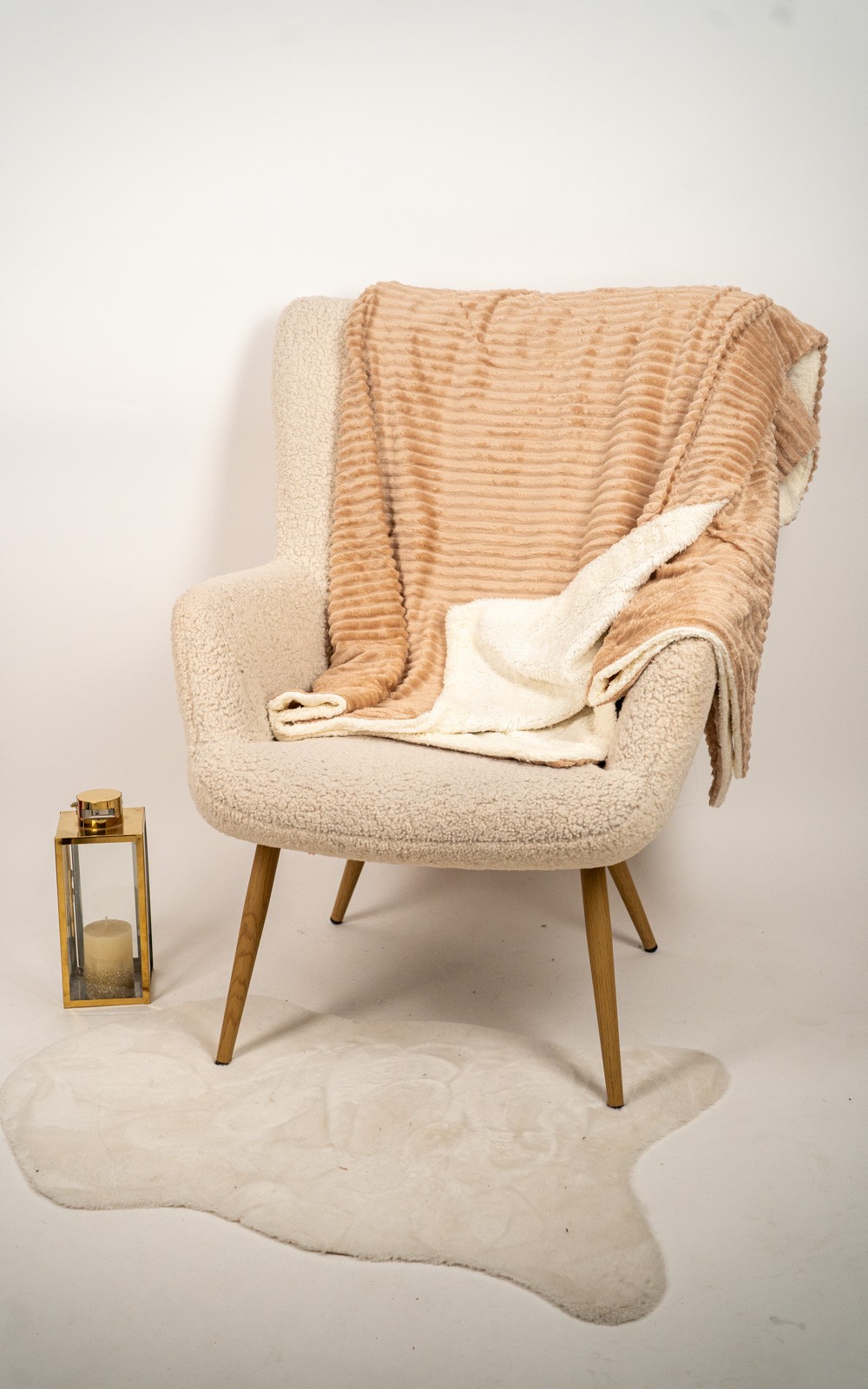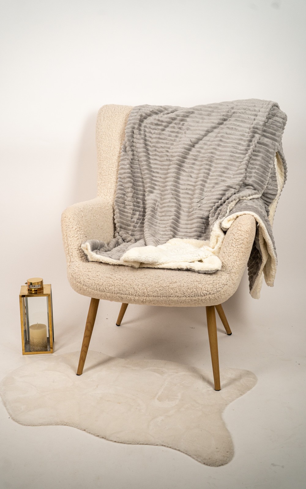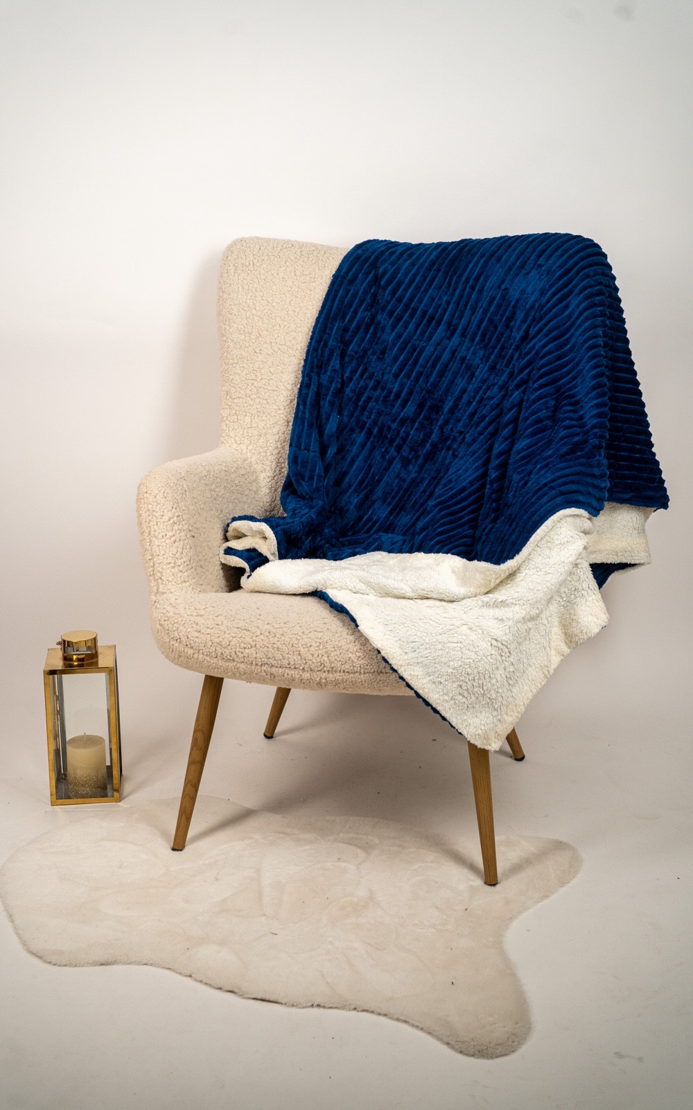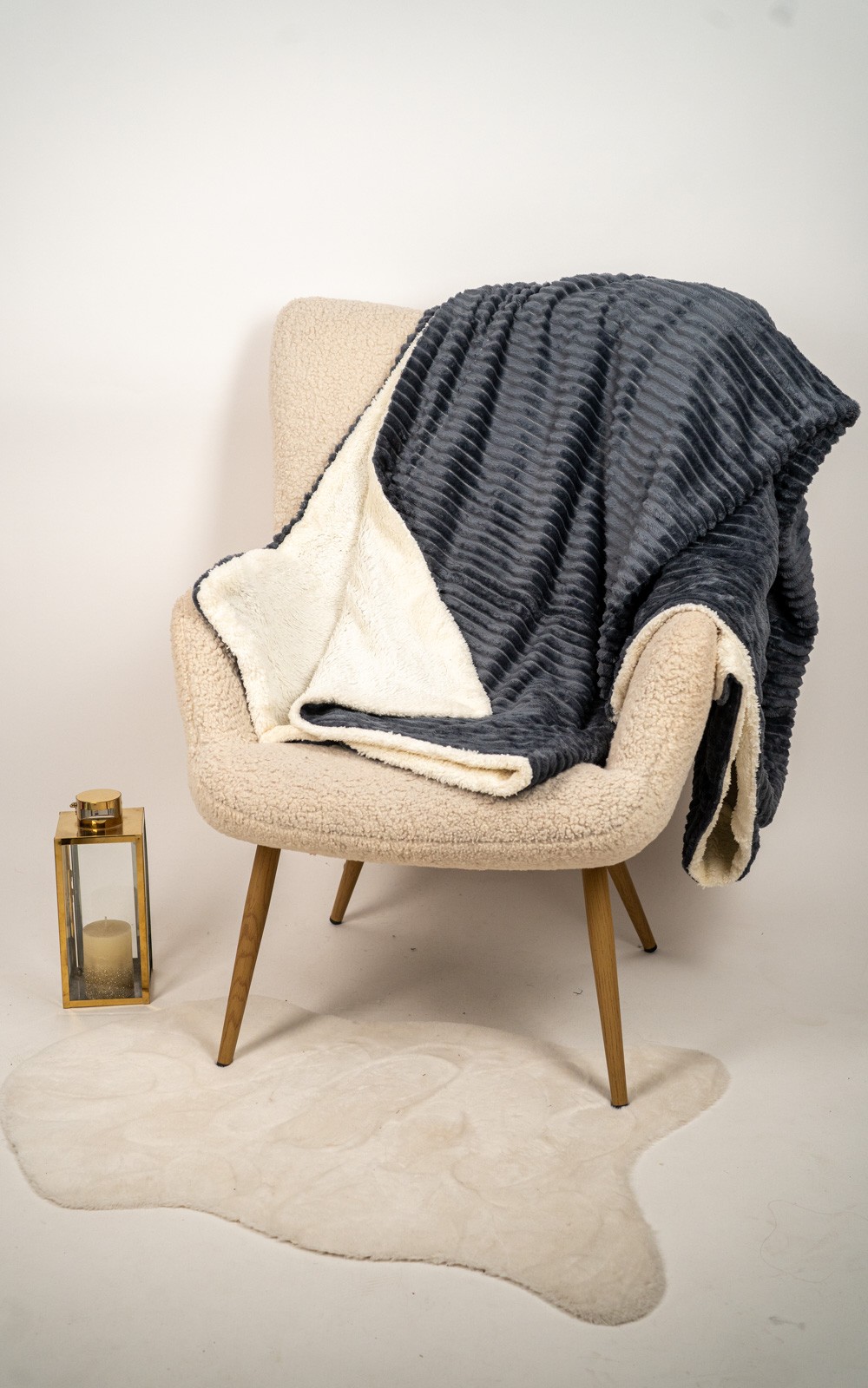 Doživite ultimativnu udobnost s našom luksuznom rebrastom dekom koja savršeno imitira izgled i osjećaj merino stila s jedne strane, dok vas s druge strane grije s plišanom Sherpa podstavom (poznatom i kao imitacija krzna ili vune).