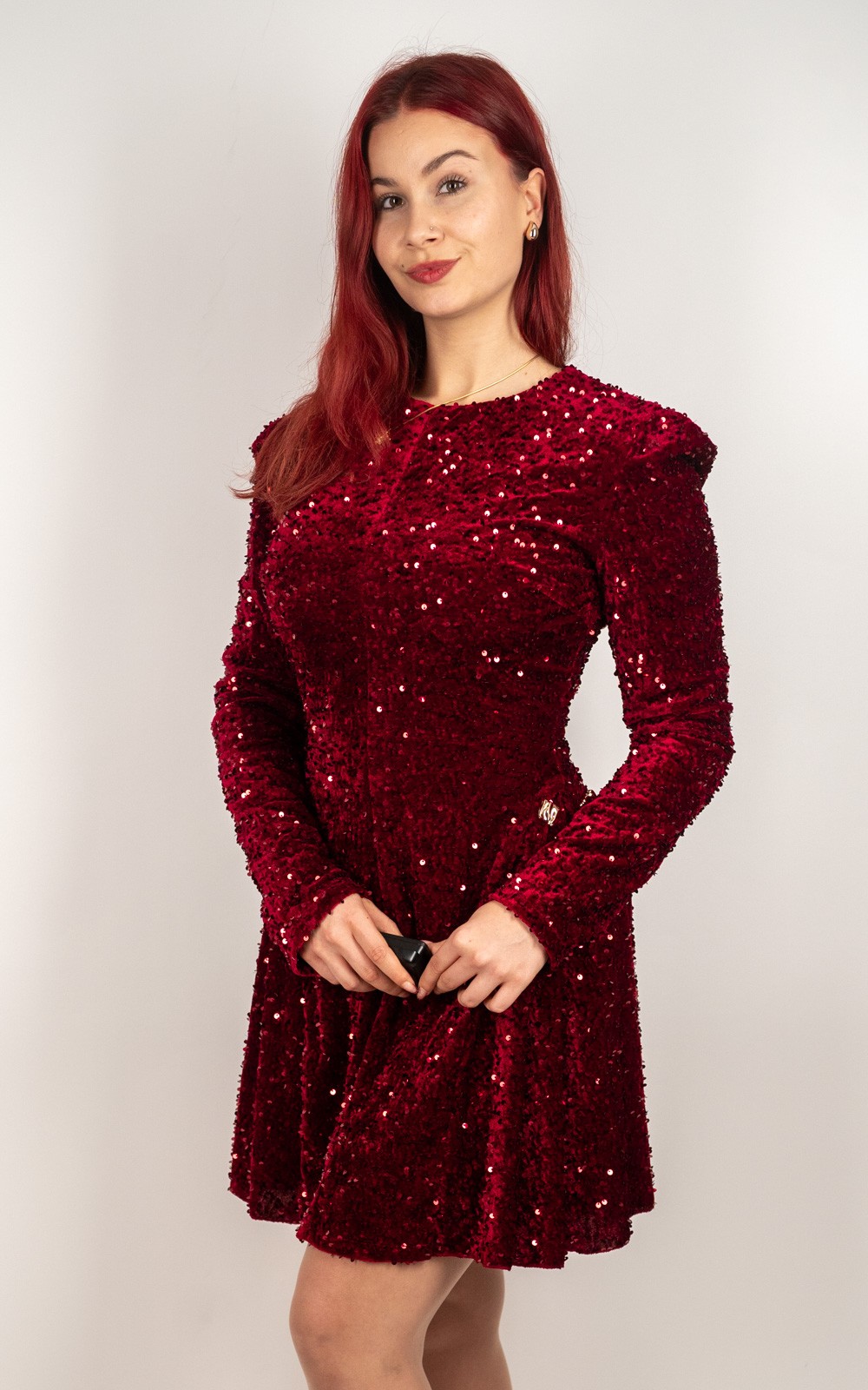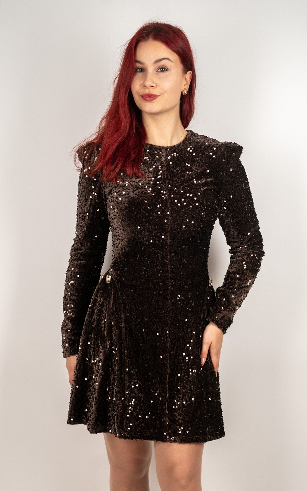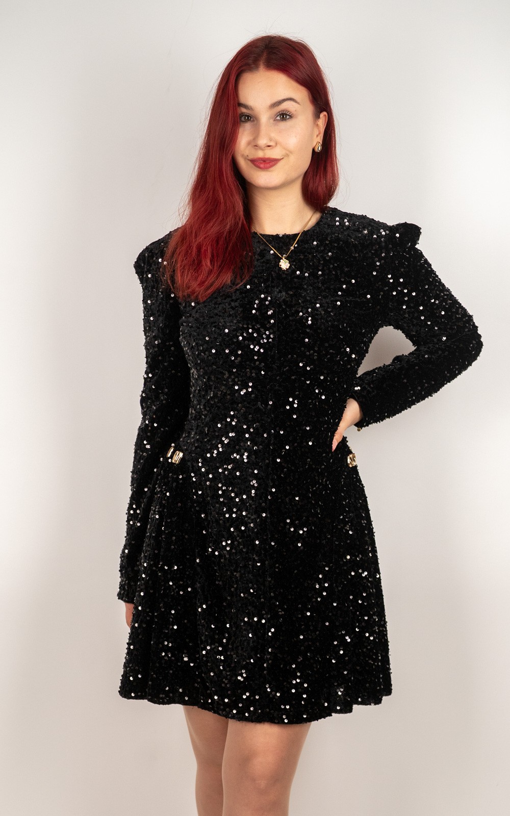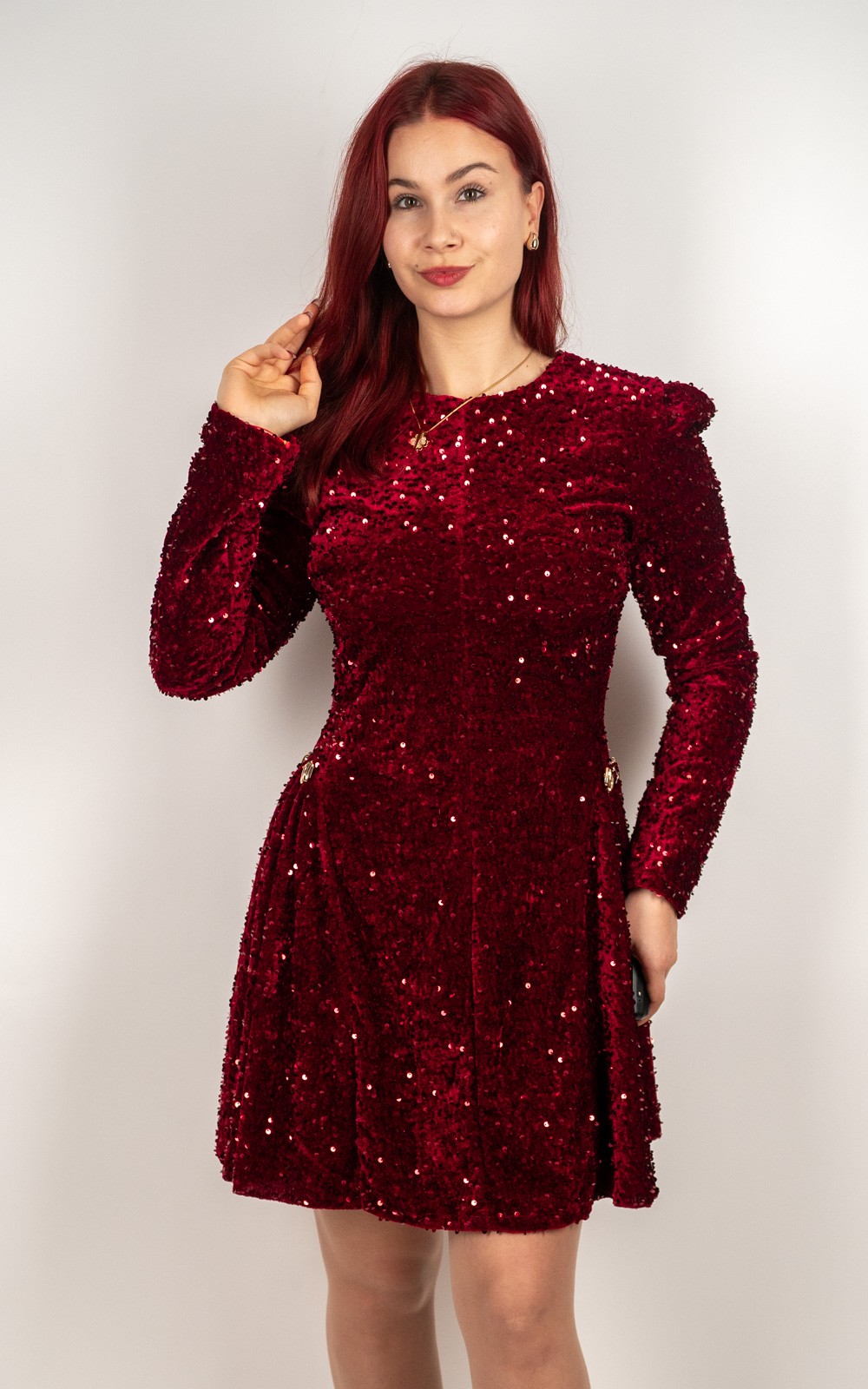 Ova baršunasta mini haljina sa šljokicama idealan je izbor za sve posebne prilike u kojima želiš izgledati glamurozno i profinjeno. Prekrasna baršunasta podloga daje joj luksuzan izgled i ugodan osjećaj na koži, dok sjajne šljokice stvaraju efekt spektakularnog sjaja pri svakom pokretu. Dugi rukavi, lagano naglašena ramena i ženstveni mini kroj savršeno oblikuju figuru. Savršena za zabave, svečanosti, proslave i večernje izlaske – haljina koja sama po sebi ostavlja dojam bez puno dodataka.