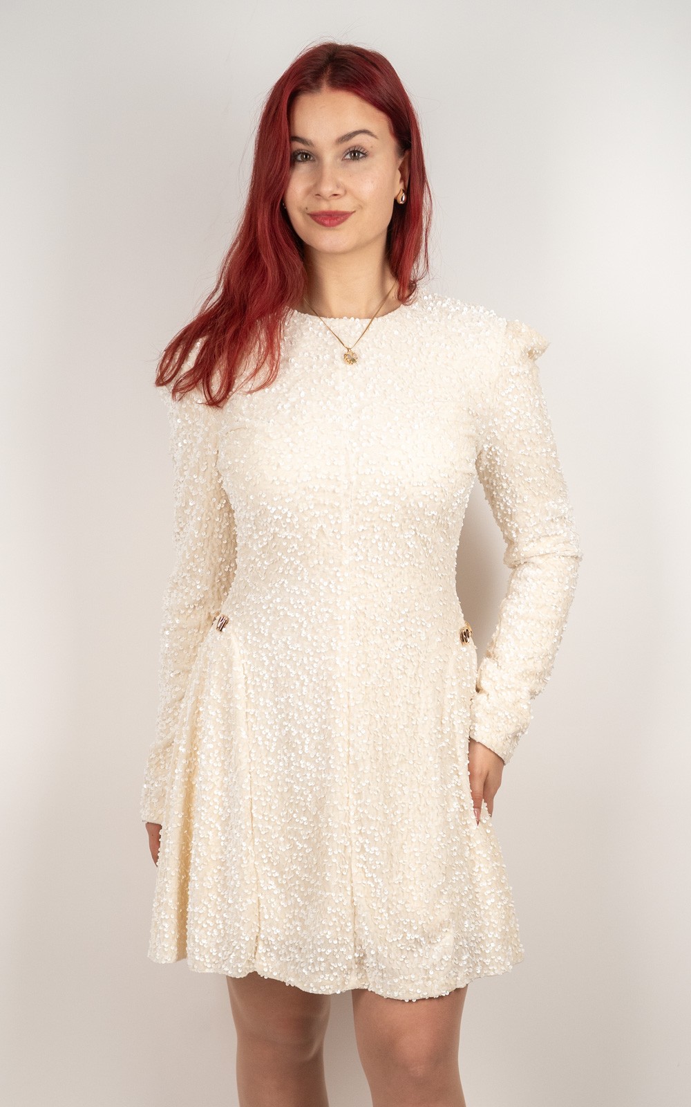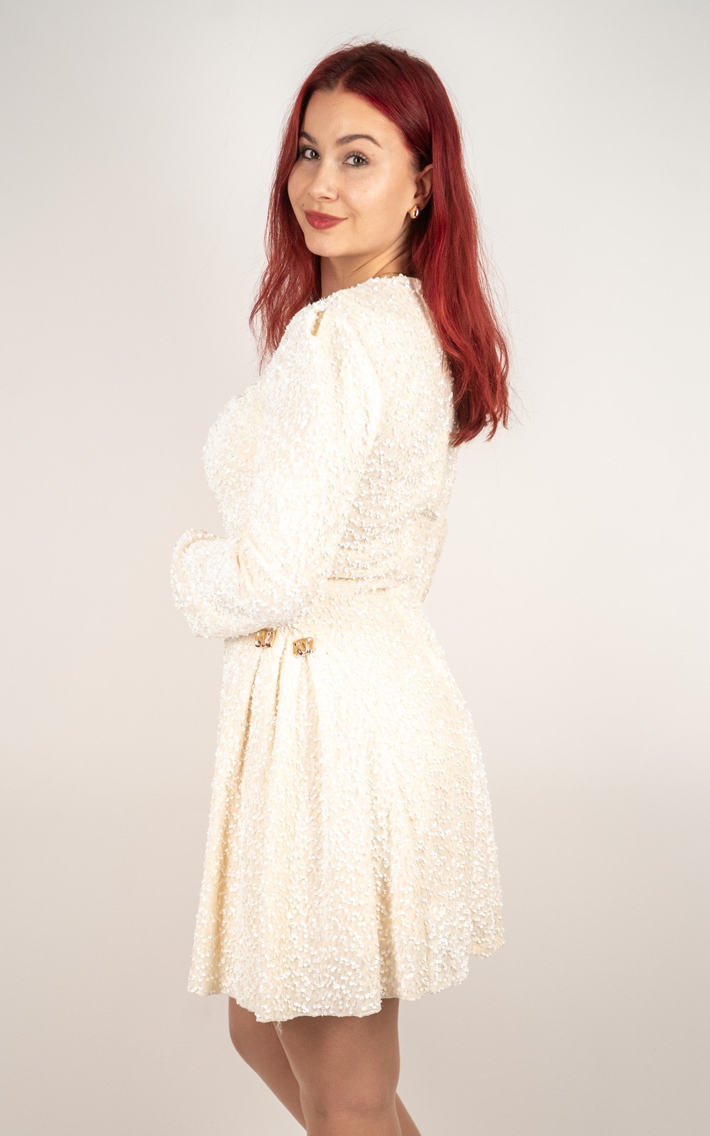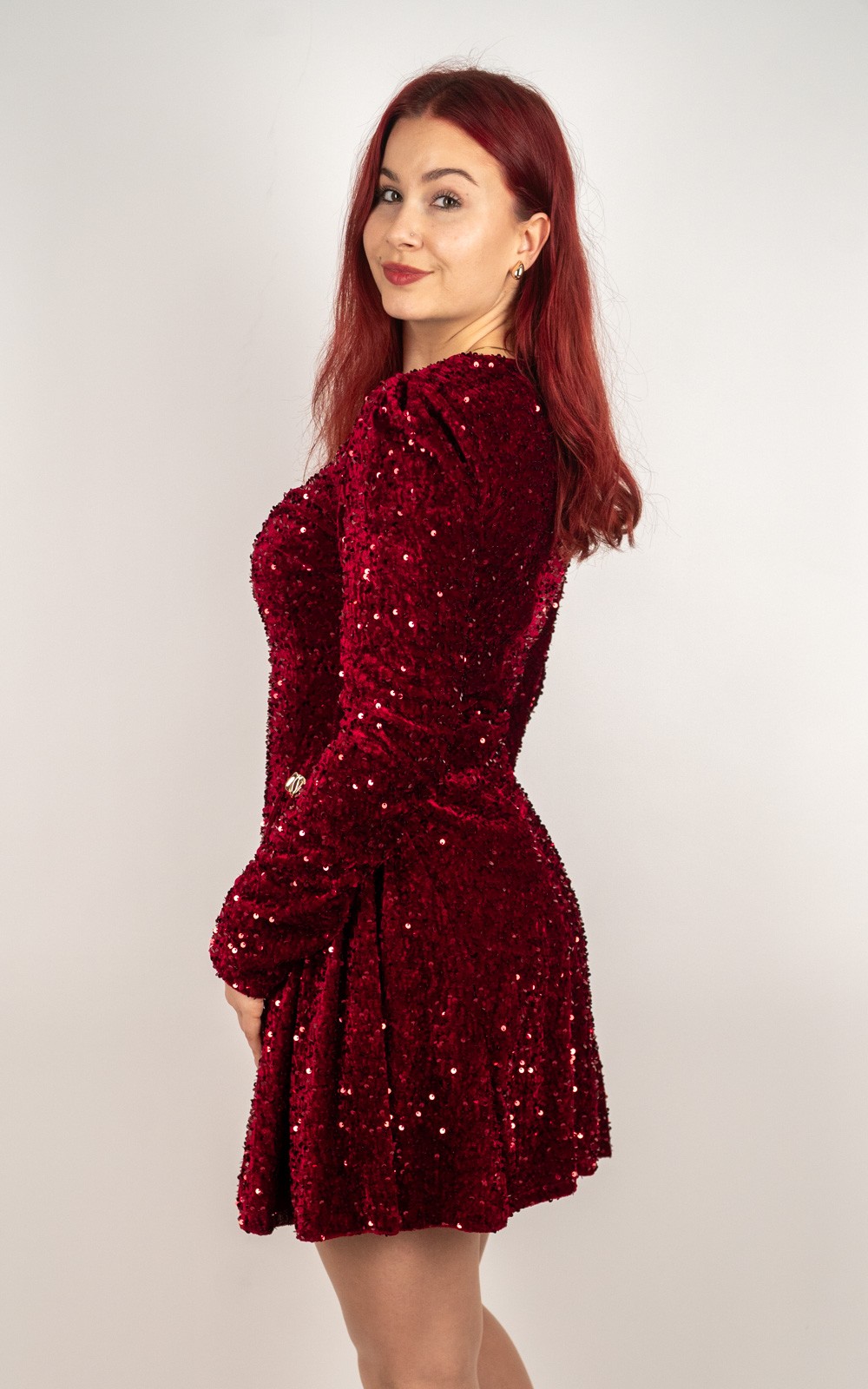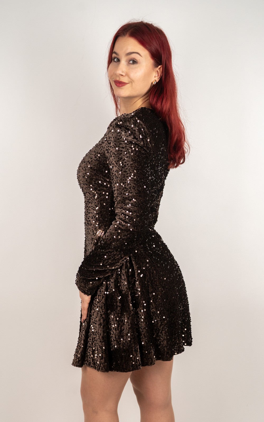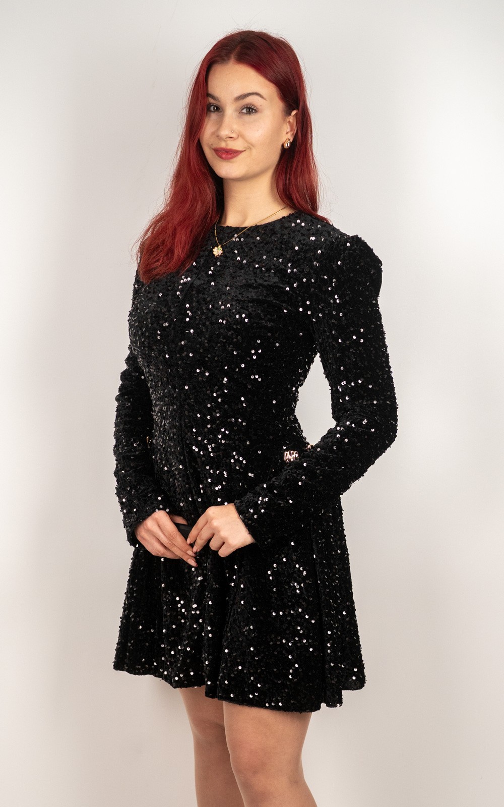 Ova baršunasta mini haljina sa šljokicama idealan je izbor za sve posebne prilike u kojima želiš izgledati glamurozno i profinjeno. Prekrasna baršunasta podloga daje joj luksuzan izgled i ugodan osjećaj na koži, dok sjajne šljokice stvaraju efekt spektakularnog sjaja pri svakom pokretu. Dugi rukavi, lagano naglašena ramena i ženstveni mini kroj savršeno oblikuju figuru. Savršena za zabave, svečanosti, proslave i večernje izlaske – haljina koja sama po sebi ostavlja dojam bez puno dodataka.