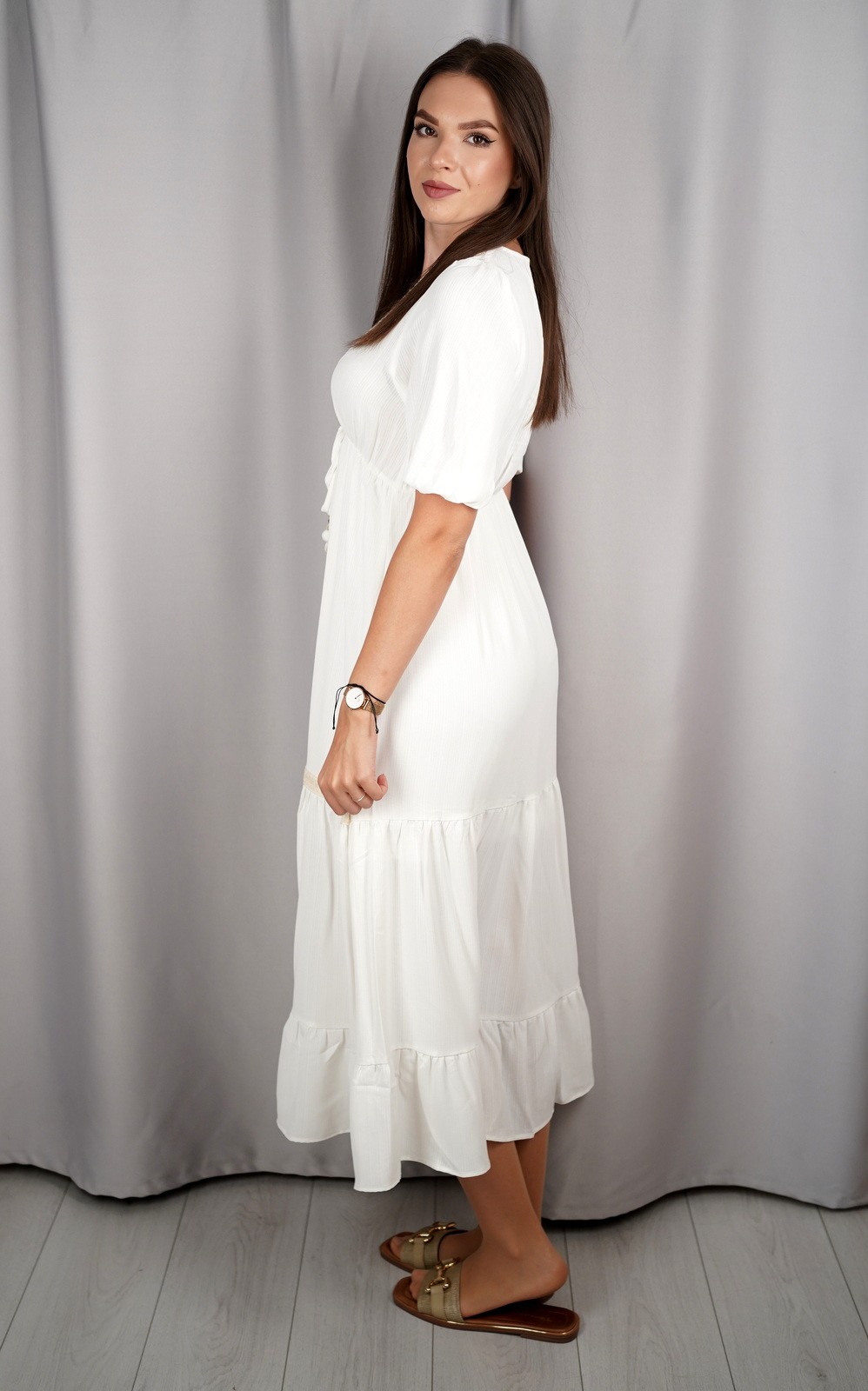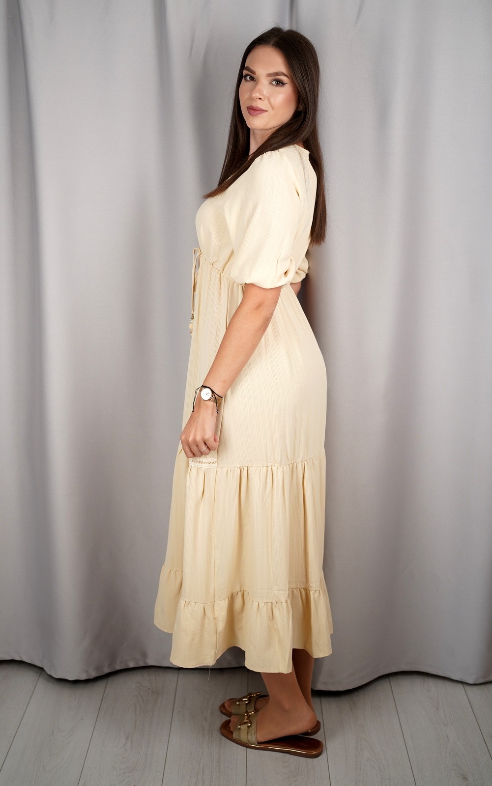 Ova midi boho haljina odiše ženstvenošću i udobnošću, savršena za tople dane i opuštene trenutke. V-izrez ukrašen je finim čipkastim detaljima koji dodaju romantičnu notu, dok vezanje u struku naglašava siluetu. Lagani materijal i lepršavi kroj omogućuju slobodu pokreta, a volani na donjem dijelu donose dodatnu razigranost. Elastični rukavi daju haljini nježan i ženstven izgled. Idealna je za šetnje, ljetne izlaske, odmore i svakodnevne kombinacije u boho stilu.