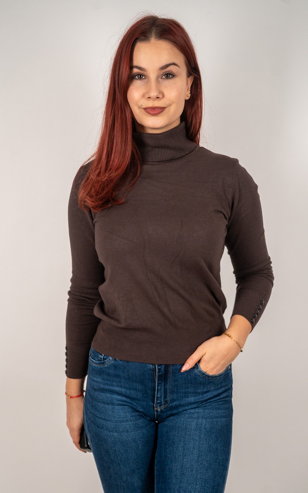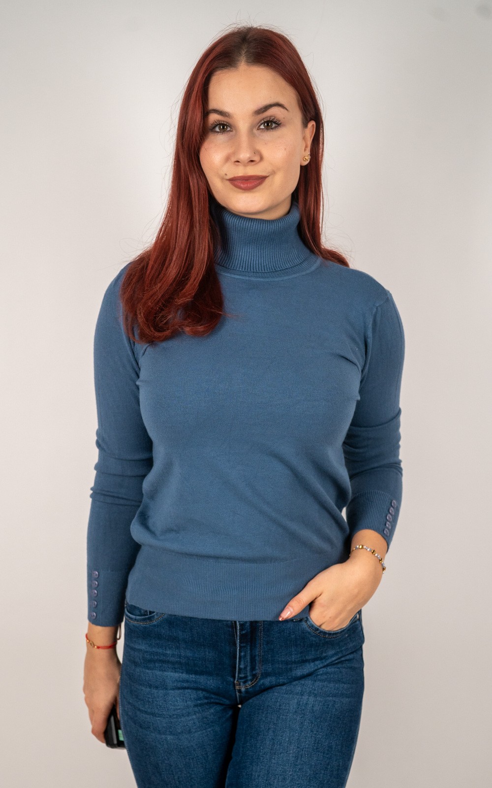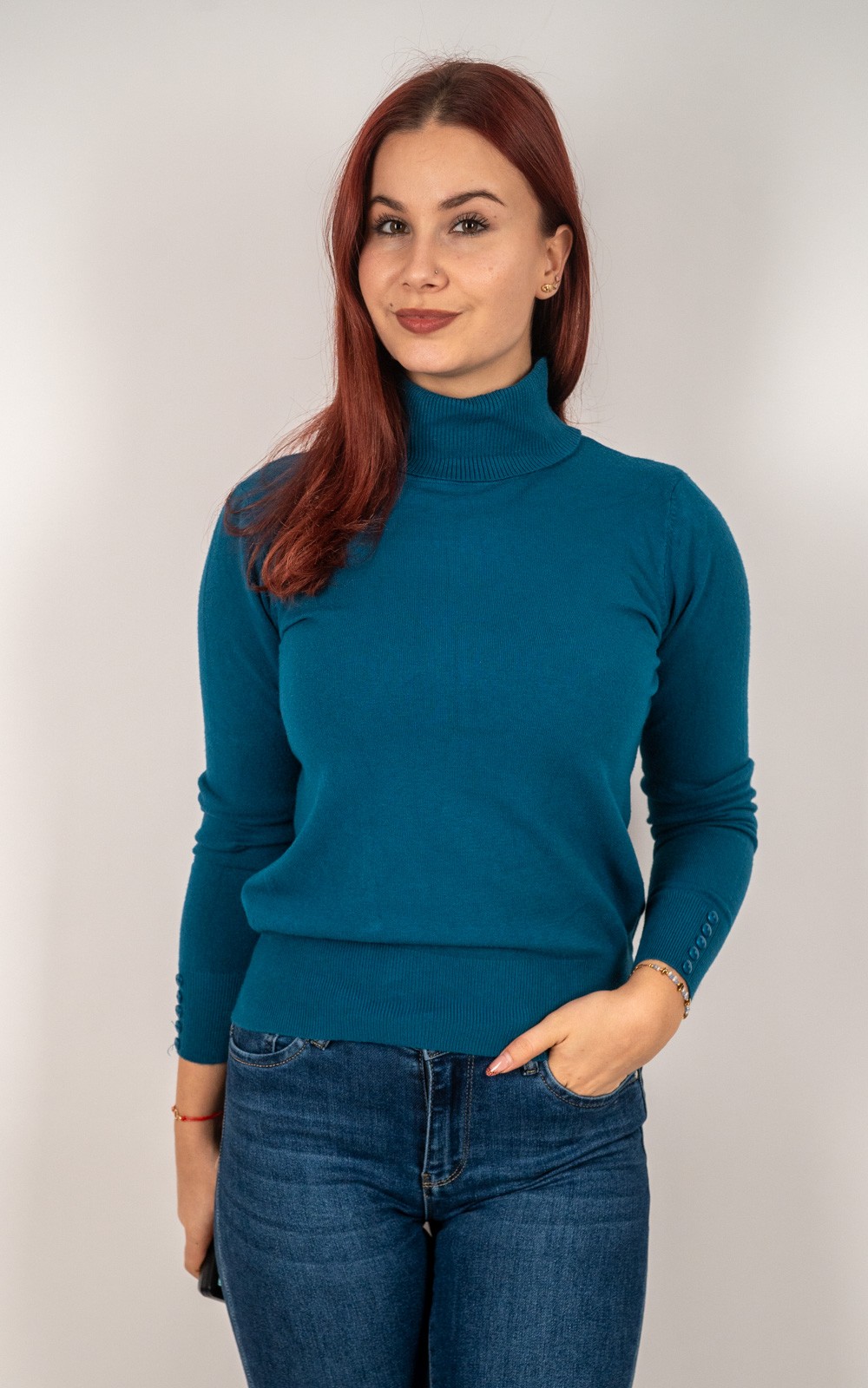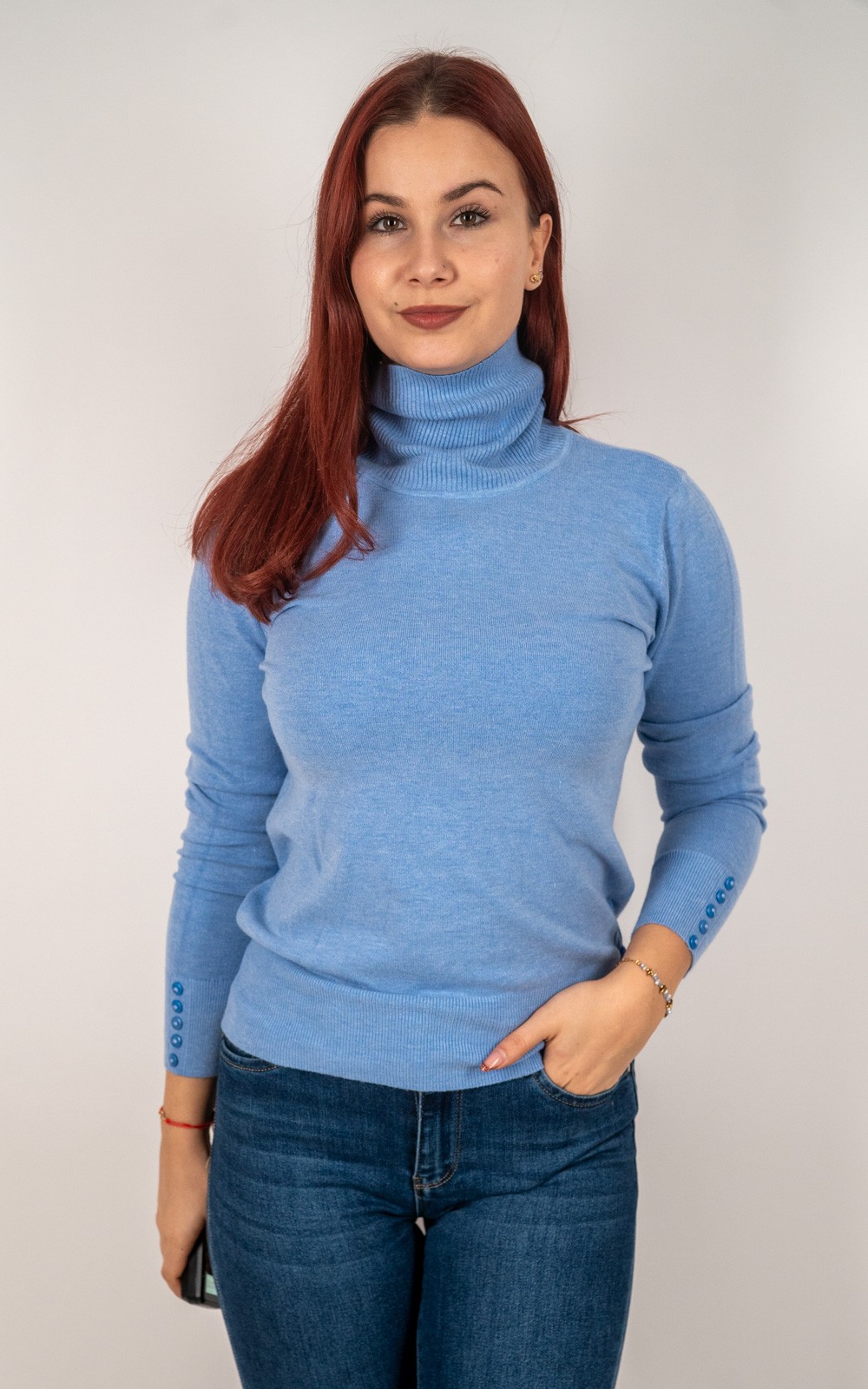kolekcija10% POPUSTA, BOŽIĆNI POPUSTI, Izdvojeno, Majice, Majice fino meko pletivo, Nova kolekcija, Pletene majice, Pletivo, ŽeneŽenska majica od rebrastog pletiva s dolčevitom i dekorativnim gumbima na rukavima – u veličinama – 30021