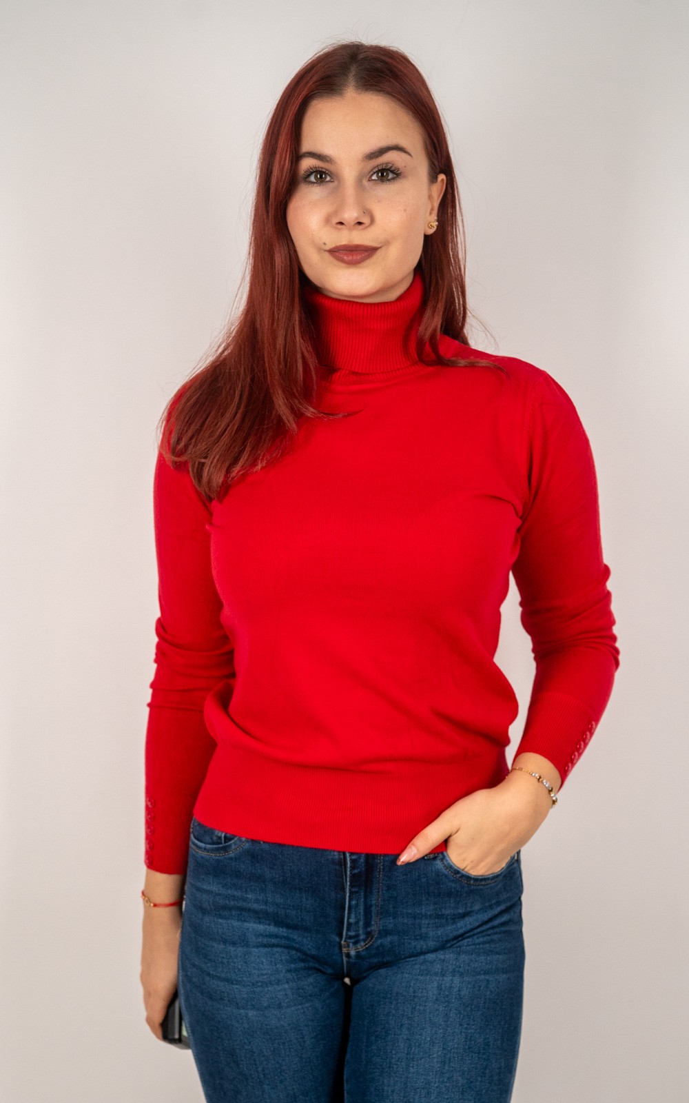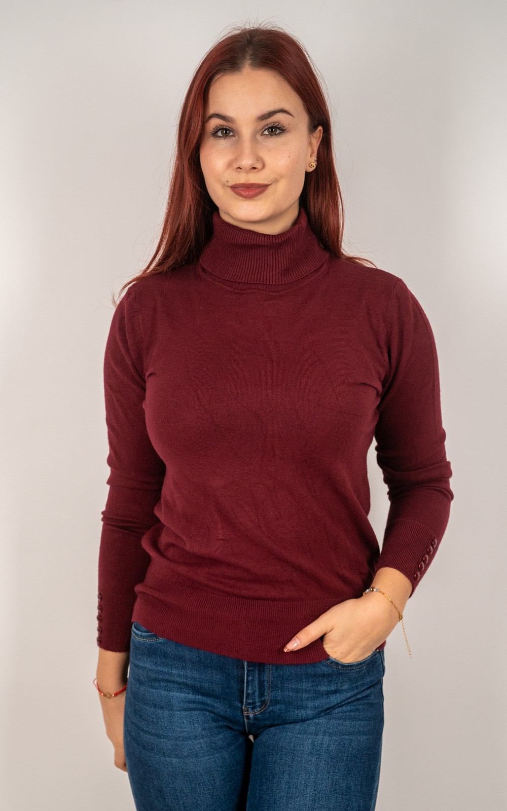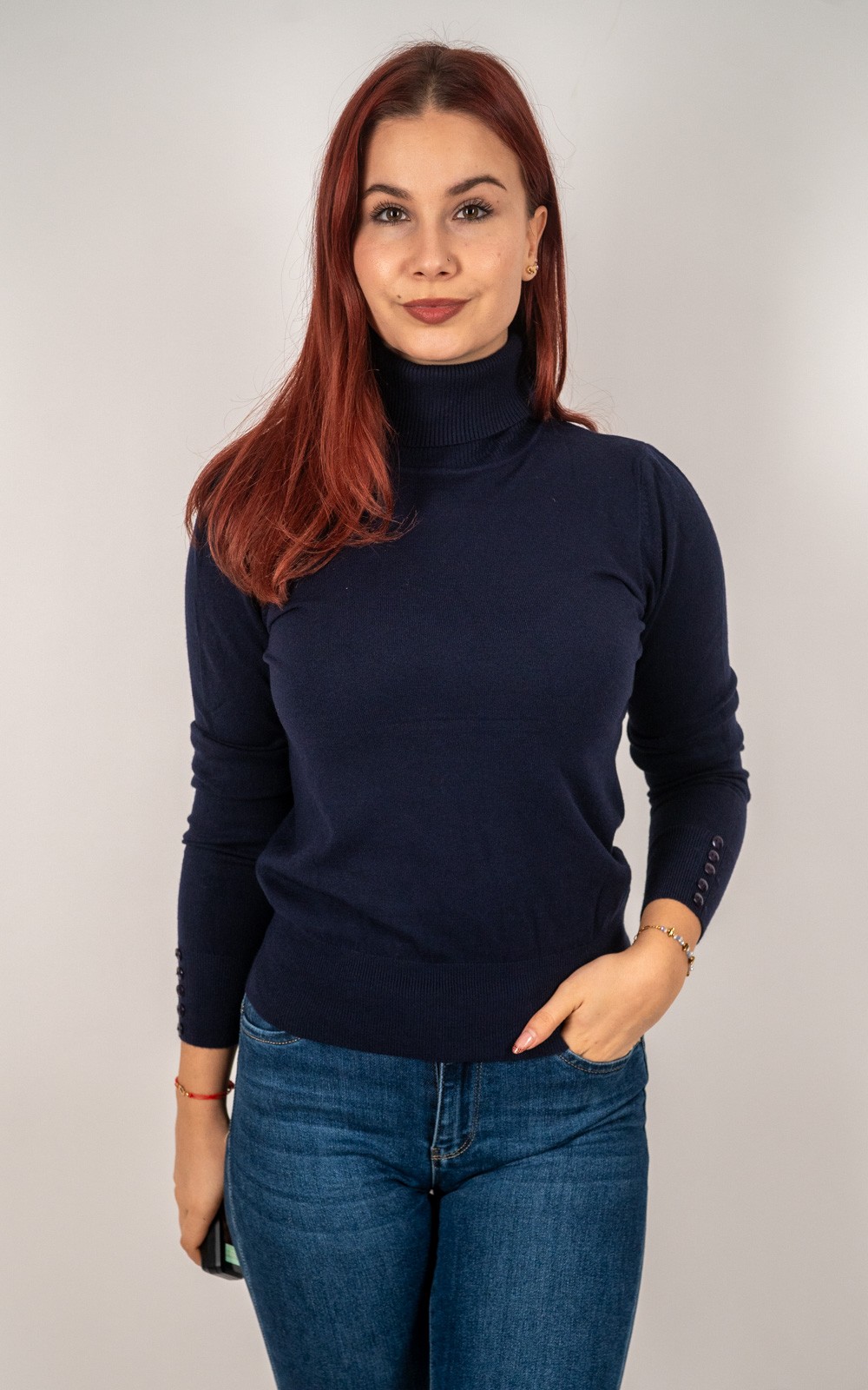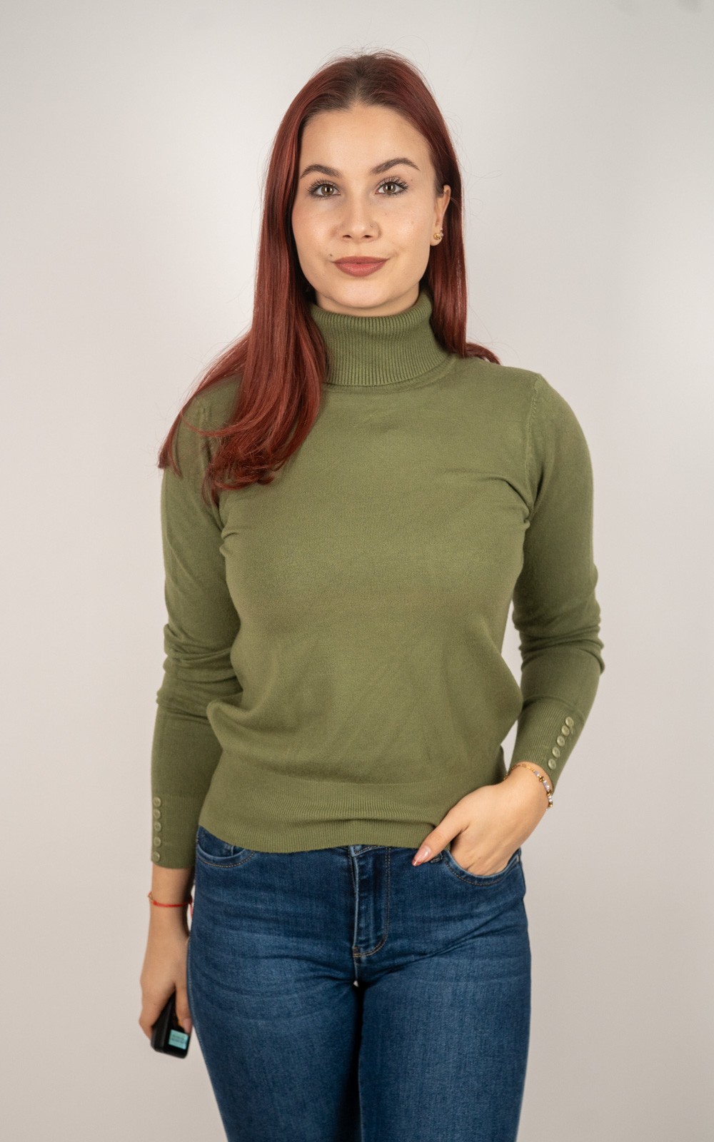 kolekcija10% POPUSTA, BOŽIĆNI POPUSTI, Izdvojeno, Majice, Majice fino meko pletivo, Nova kolekcija, Pletene majice, Pletivo, ŽeneŽenska majica od rebrastog pletiva s dolčevitom i dekorativnim gumbima na rukavima – u veličinama – 30021