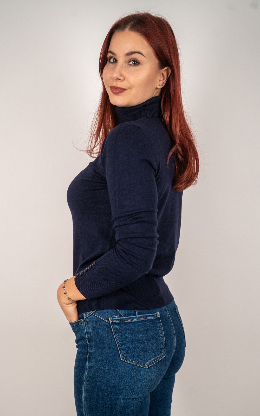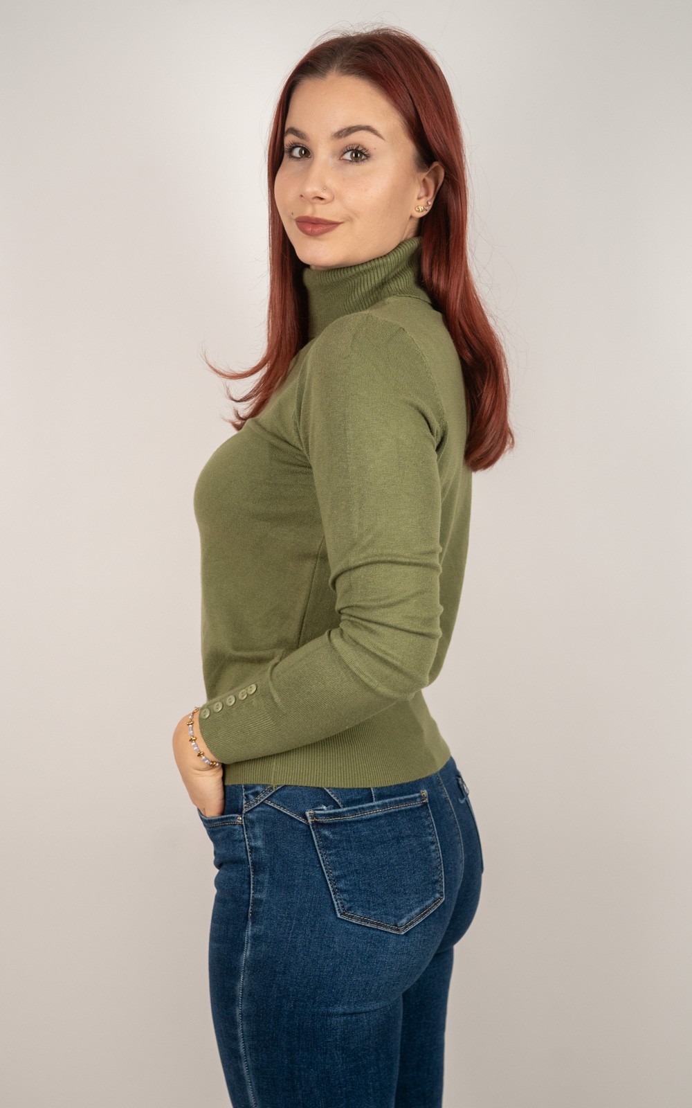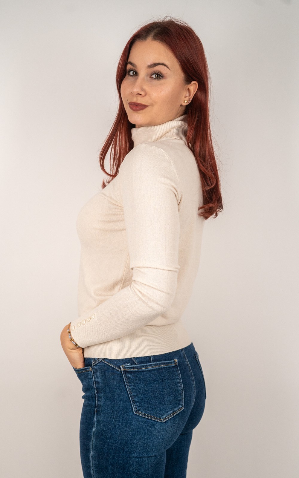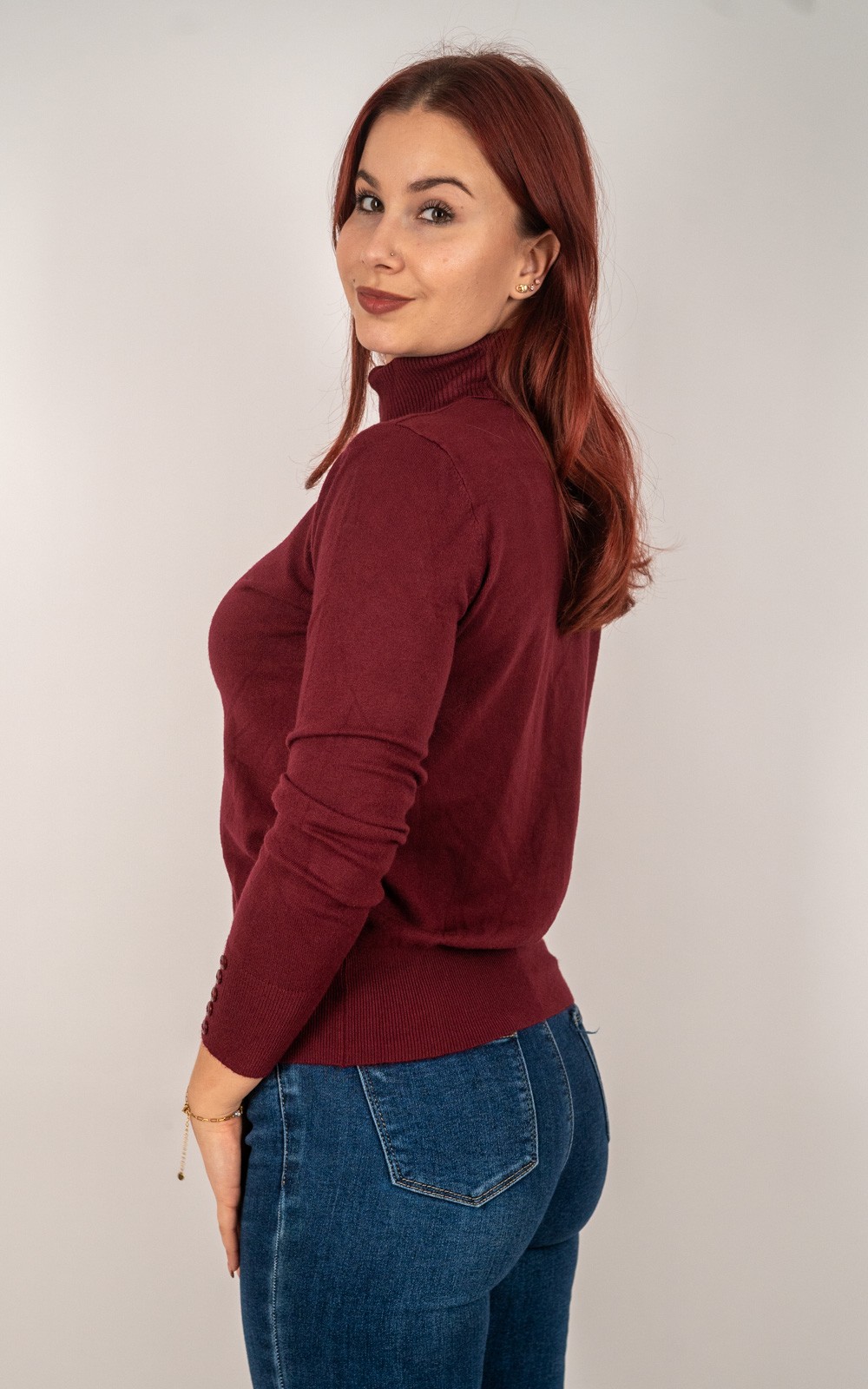 kolekcija10% POPUSTA, BOŽIĆNI POPUSTI, Izdvojeno, Majice, Majice fino meko pletivo, Nova kolekcija, Pletene majice, Pletivo, ŽeneŽenska majica od rebrastog pletiva s dolčevitom i dekorativnim gumbima na rukavima – u veličinama – 30021