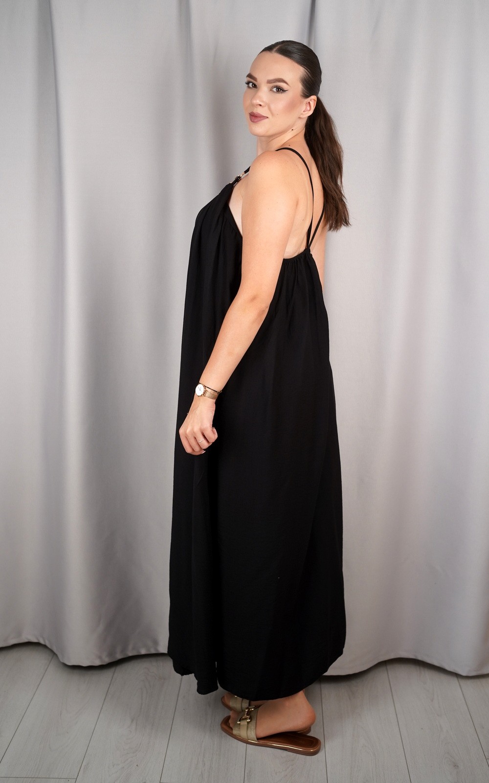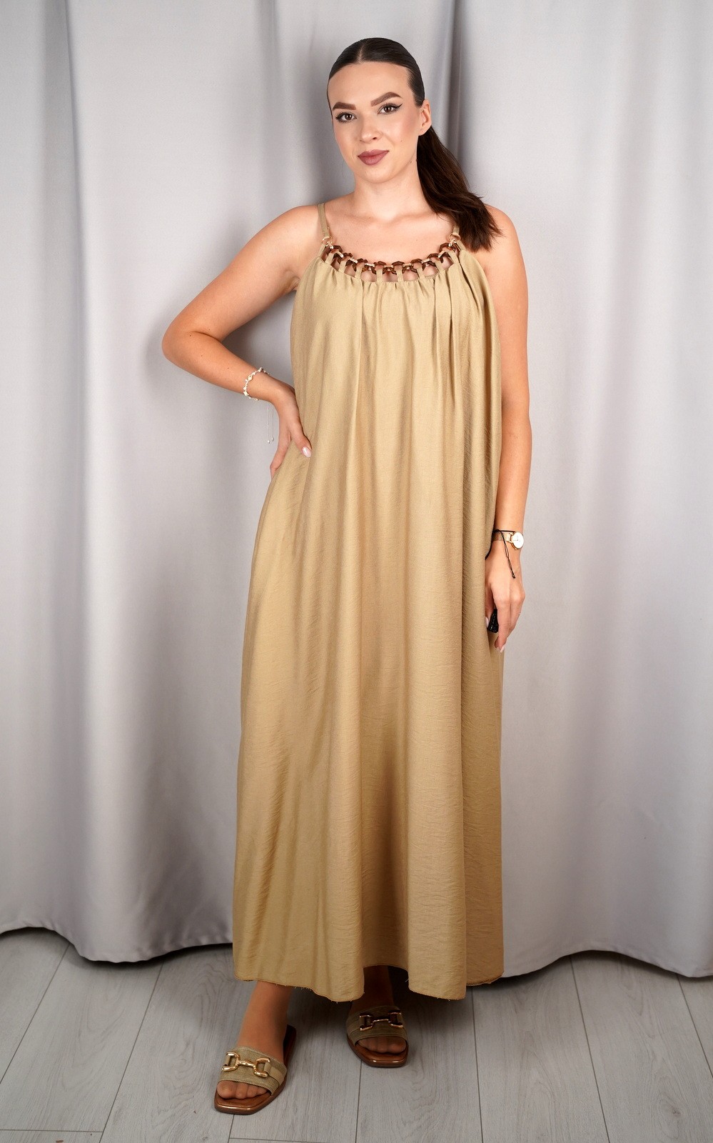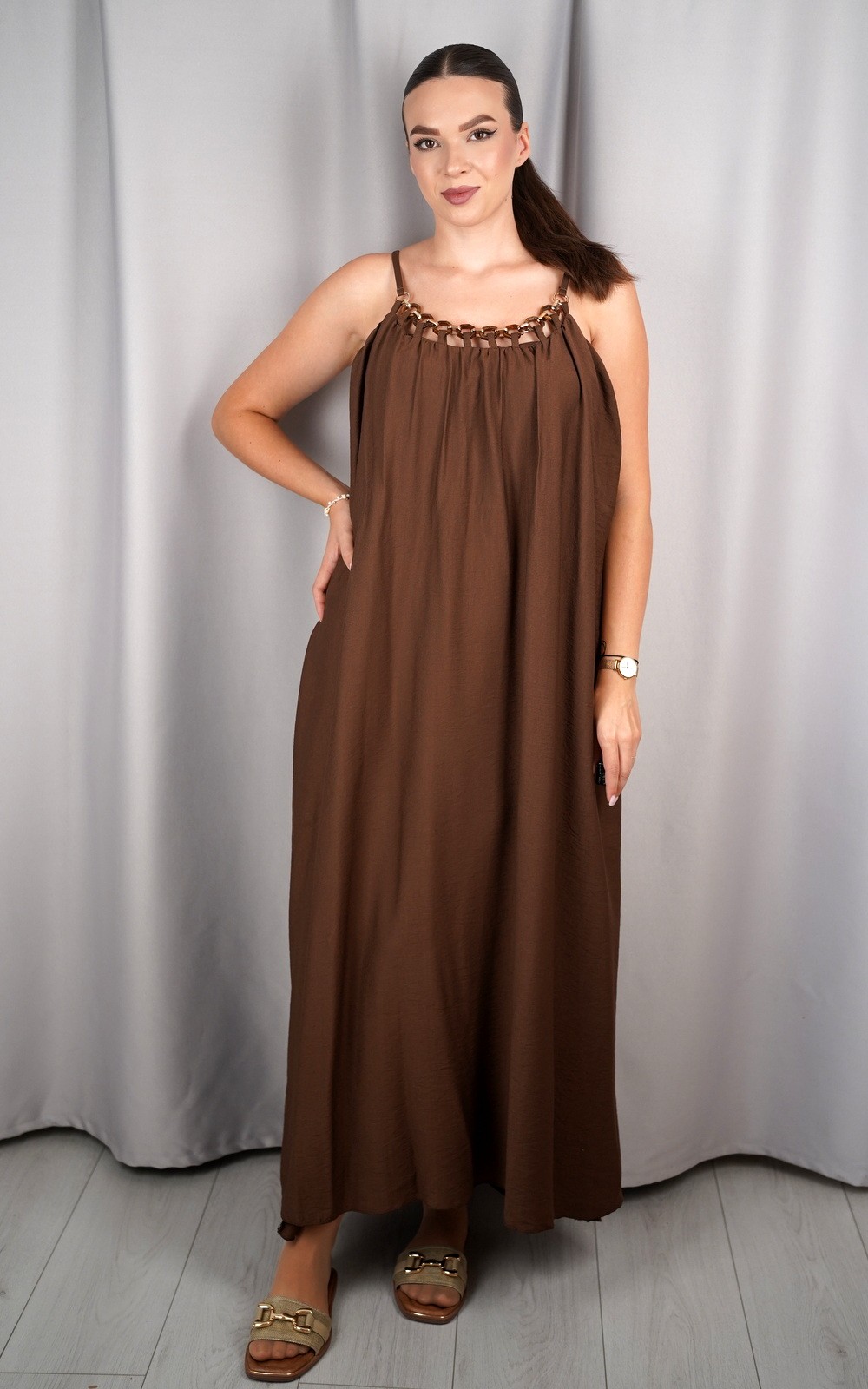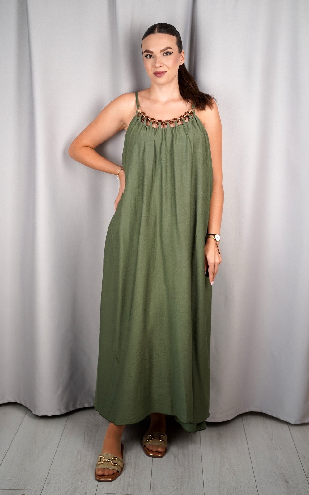 Ženska duga haljina s tankim naramenicama i dekorativnim lancem oko izreza spoj je elegancije i modernog dizajna. Lepršav kroj pruža udobnost i slobodu pokreta, dok prozračan materijal osigurava ugodu i u toplijim danima. Dekorativni lanac dodaje dozu glamura i čini ovu haljinu savršenim izborom za večernje izlaske, posebne prilike, ali i za ležerne ljetne šetnje uz odgovarajuće modne dodatke. Idealna je za sve žene koje vole spoj jednostavnosti i upečatljivih detalja.