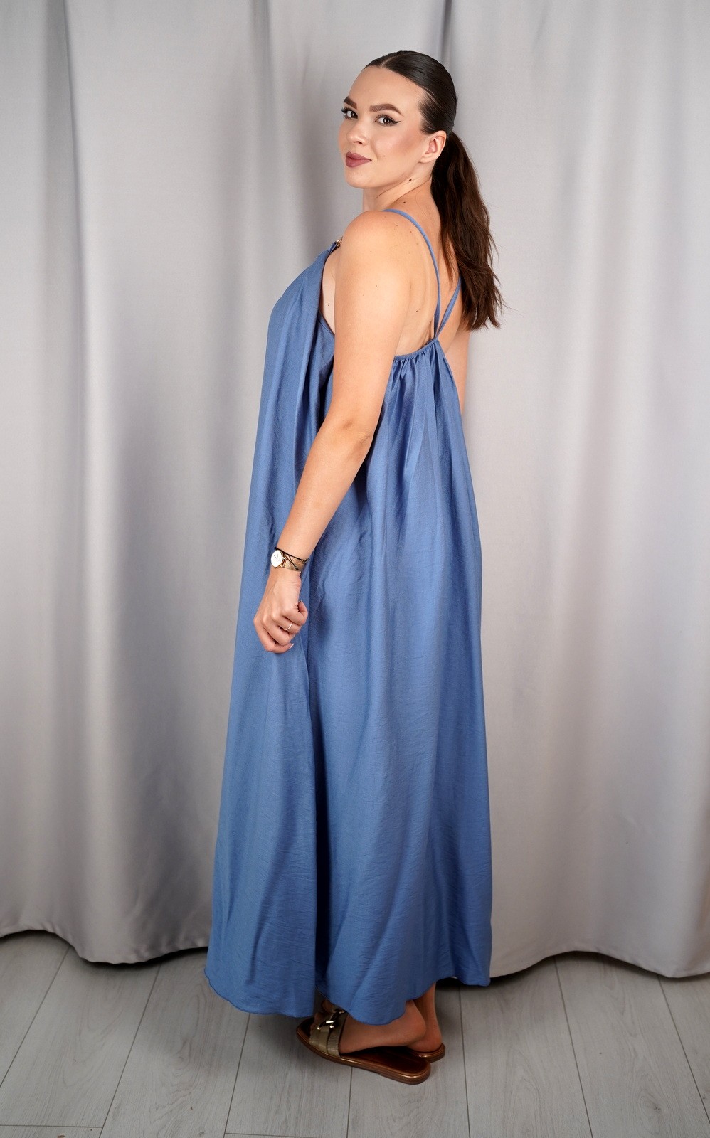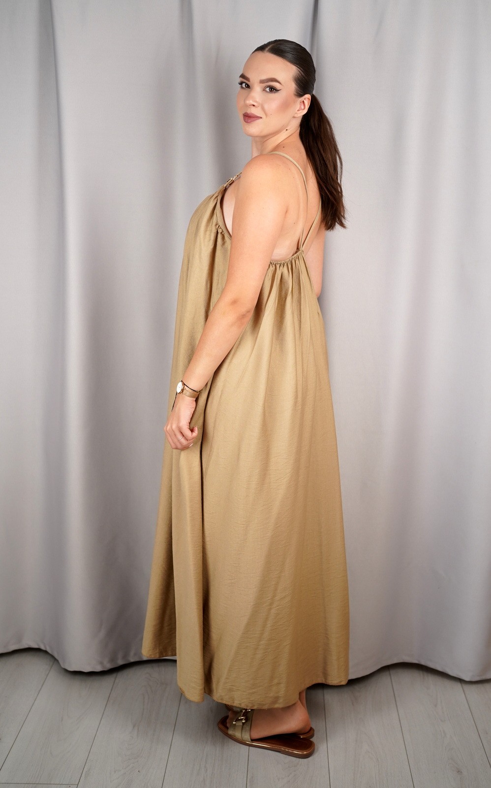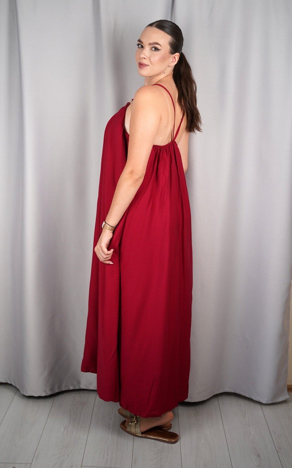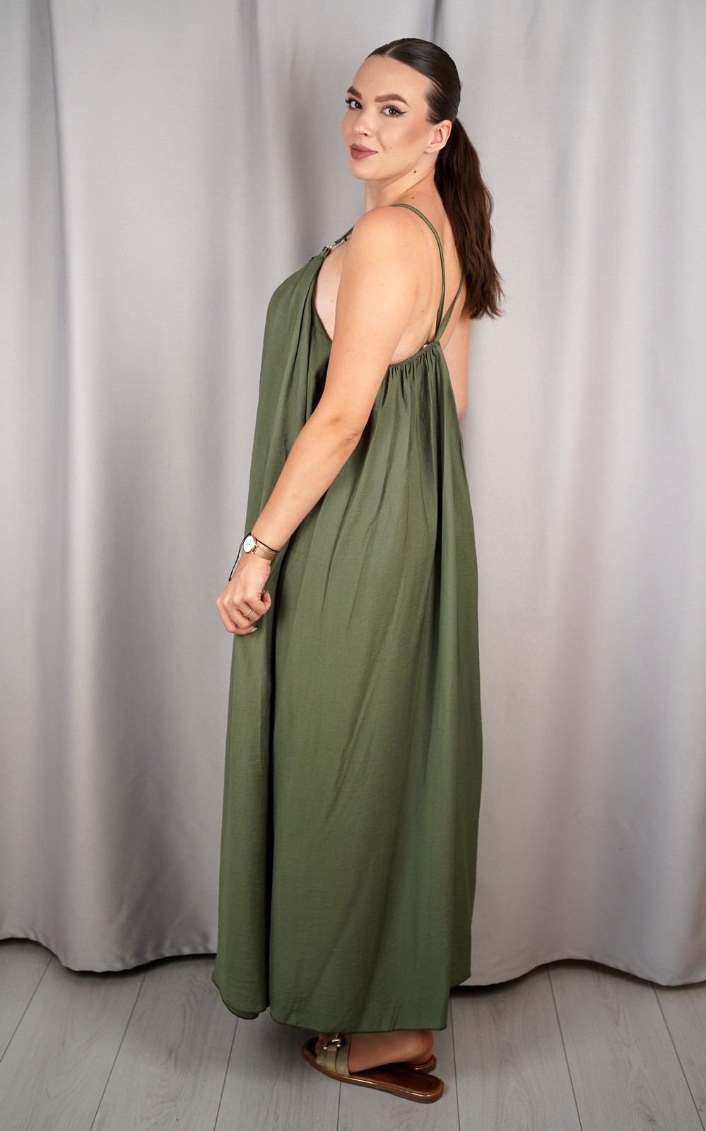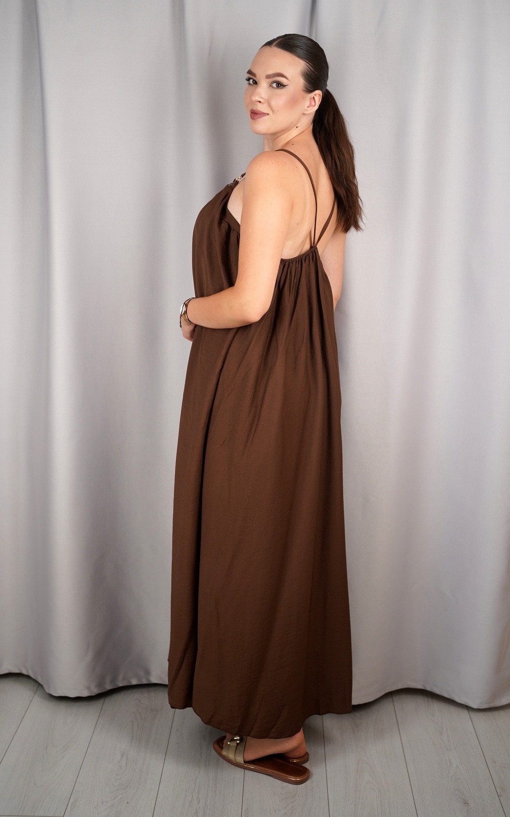 Ženska duga haljina s tankim naramenicama i dekorativnim lancem oko izreza spoj je elegancije i modernog dizajna. Lepršav kroj pruža udobnost i slobodu pokreta, dok prozračan materijal osigurava ugodu i u toplijim danima. Dekorativni lanac dodaje dozu glamura i čini ovu haljinu savršenim izborom za večernje izlaske, posebne prilike, ali i za ležerne ljetne šetnje uz odgovarajuće modne dodatke. Idealna je za sve žene koje vole spoj jednostavnosti i upečatljivih detalja.