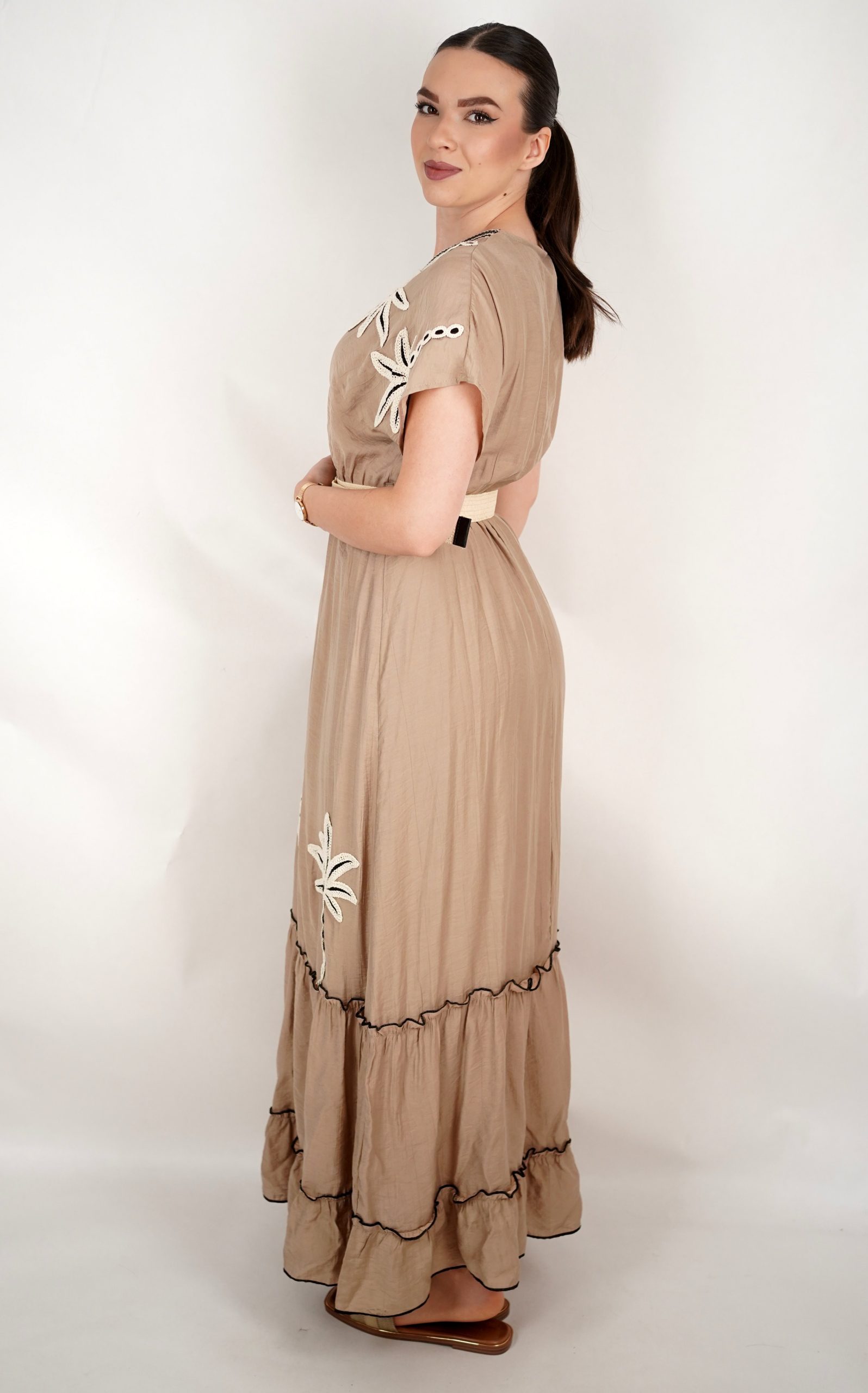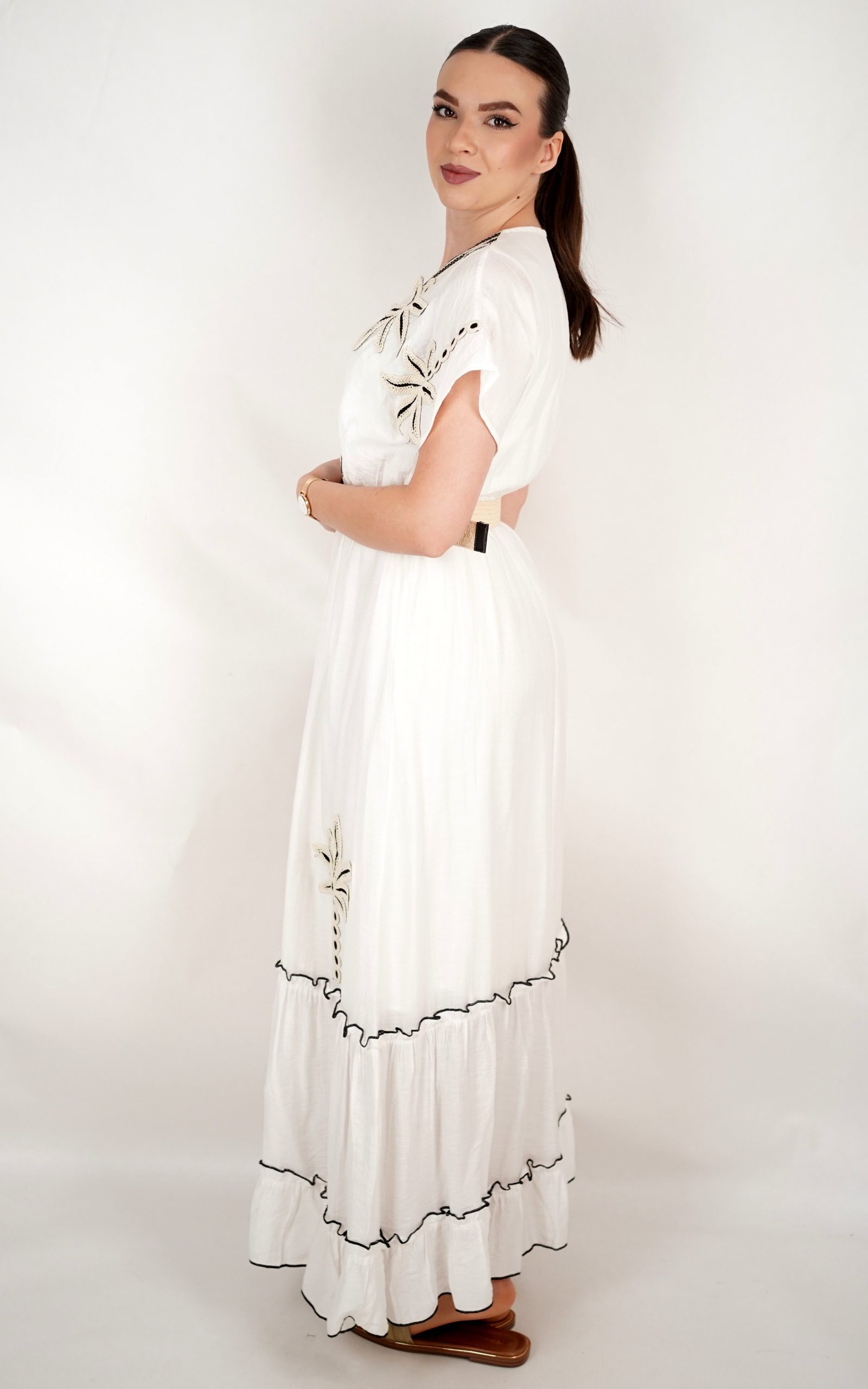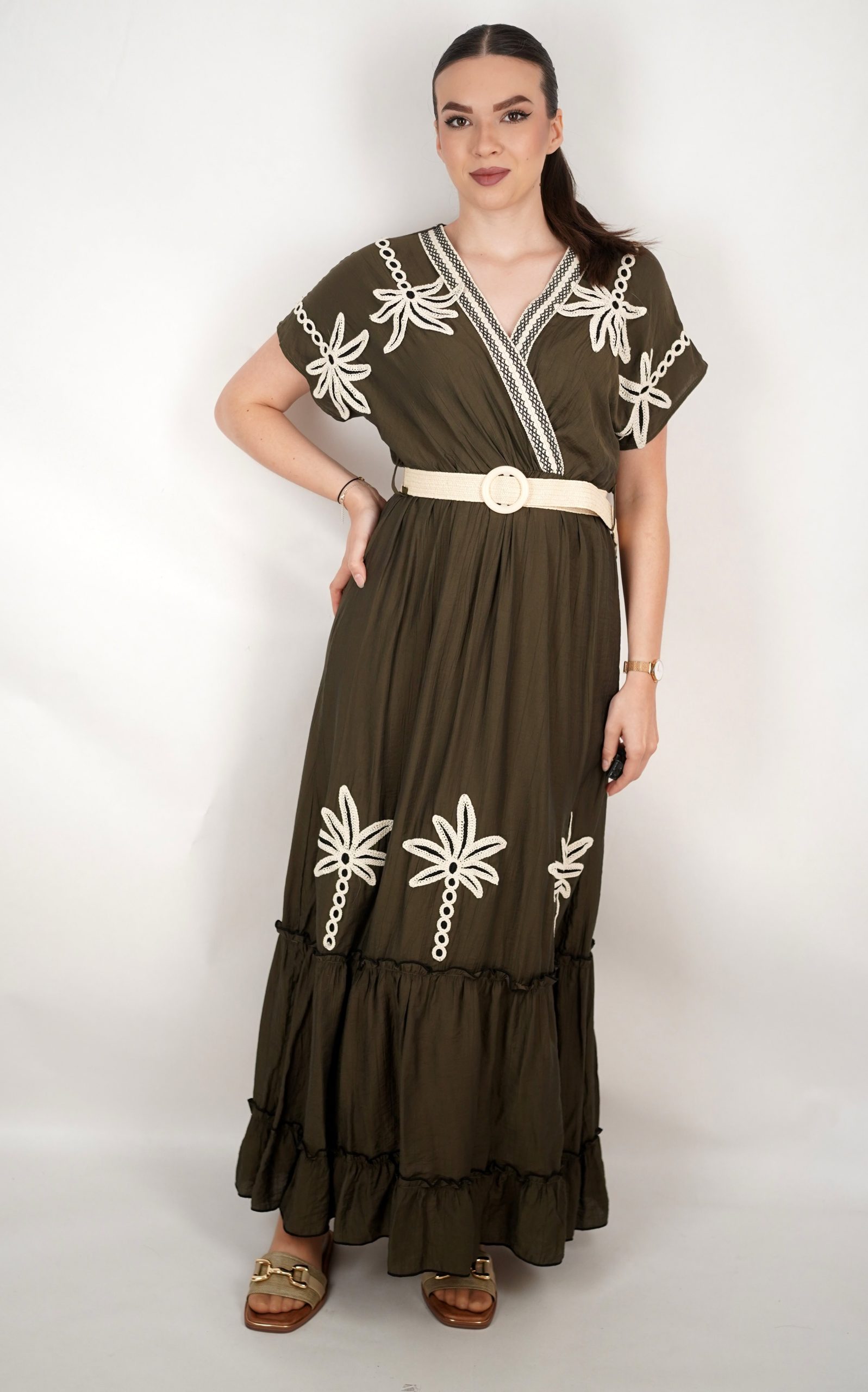Ova duga haljina odiše boho šarmom zahvaljujući upečatljivim vezenim palmama, V-izrezu i suptilno nabranoj suknji s volanom. Priloženi remen dodatno naglašava struk i siluetu, a prozračan materijal čini je idealnim izborom za vruće ljetne dane, šetnje rivom ili ljetne evente. Kombiniraj je uz sandale i slamnati šešir za potpuni ljetni look.