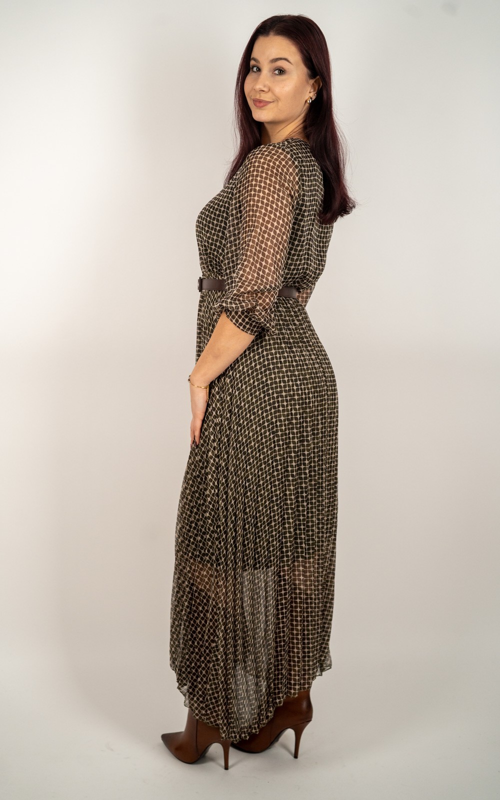 Ova duga prozračna haljina kombinira udobnost i eleganciju u savršenom omjeru. Izrađena od laganog materijala koji nježno pada i prati pokrete, idealna je za svakodnevne i posebne prilike. Rukavi su blago prozirni i završavaju elastičnim rubom, dok remen u struku ističe figuru i dodaje notu sofisticiranosti. Lepršav donji dio i diskretna podstava pružaju potpunu udobnost i slobodu kretanja. Savršena za jesenske dane uz čizme ili elegantne cipele.
