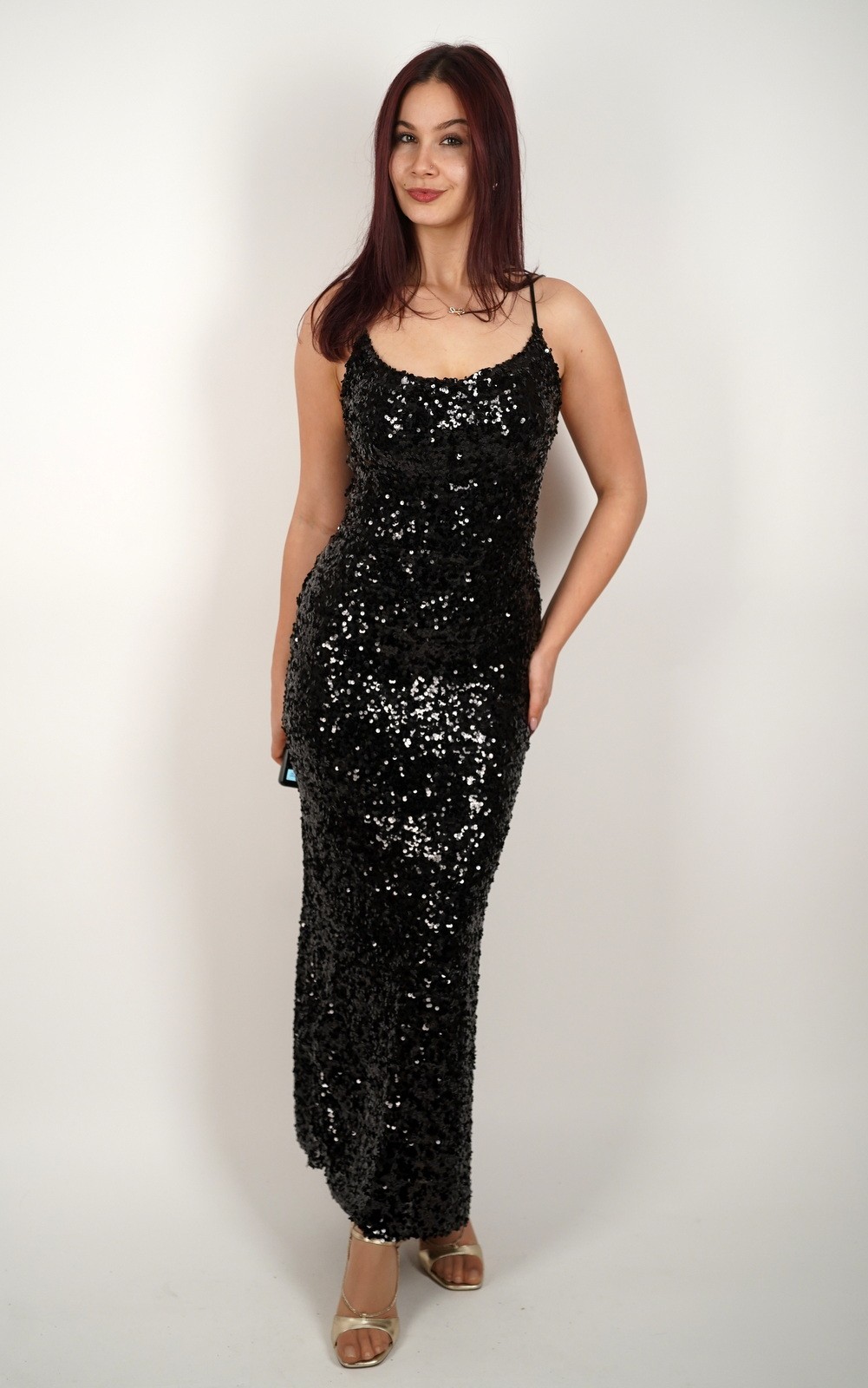 Ženska duga šljokičasta haljina s tankim naramenicama – 37738-65