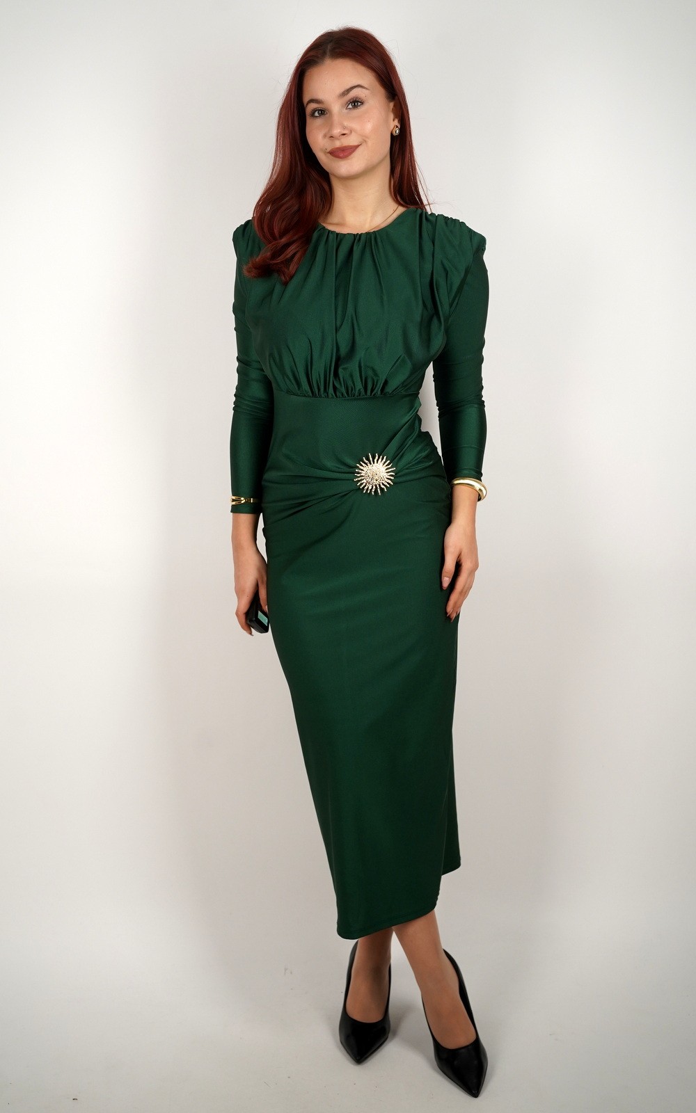 bozic10 očekuje te snižena cijena od 30.60 € za ovaj artikl u košarici.Svečana midi haljina sofisticiranog kroja koji naglašava figuru. Gornji dio haljine ima decentno puf rukave s naglašenim ramenima. Ističe se drapiranim detaljem u struku koji vizualno sužava siluetu i naglašava bokove. U središtu struka nalazi se upečatljiva dekorativna kopča/broš koja dodaje glamuroznu notu. Idealna za svečane prigode, vjenčanja i koktel zabave.