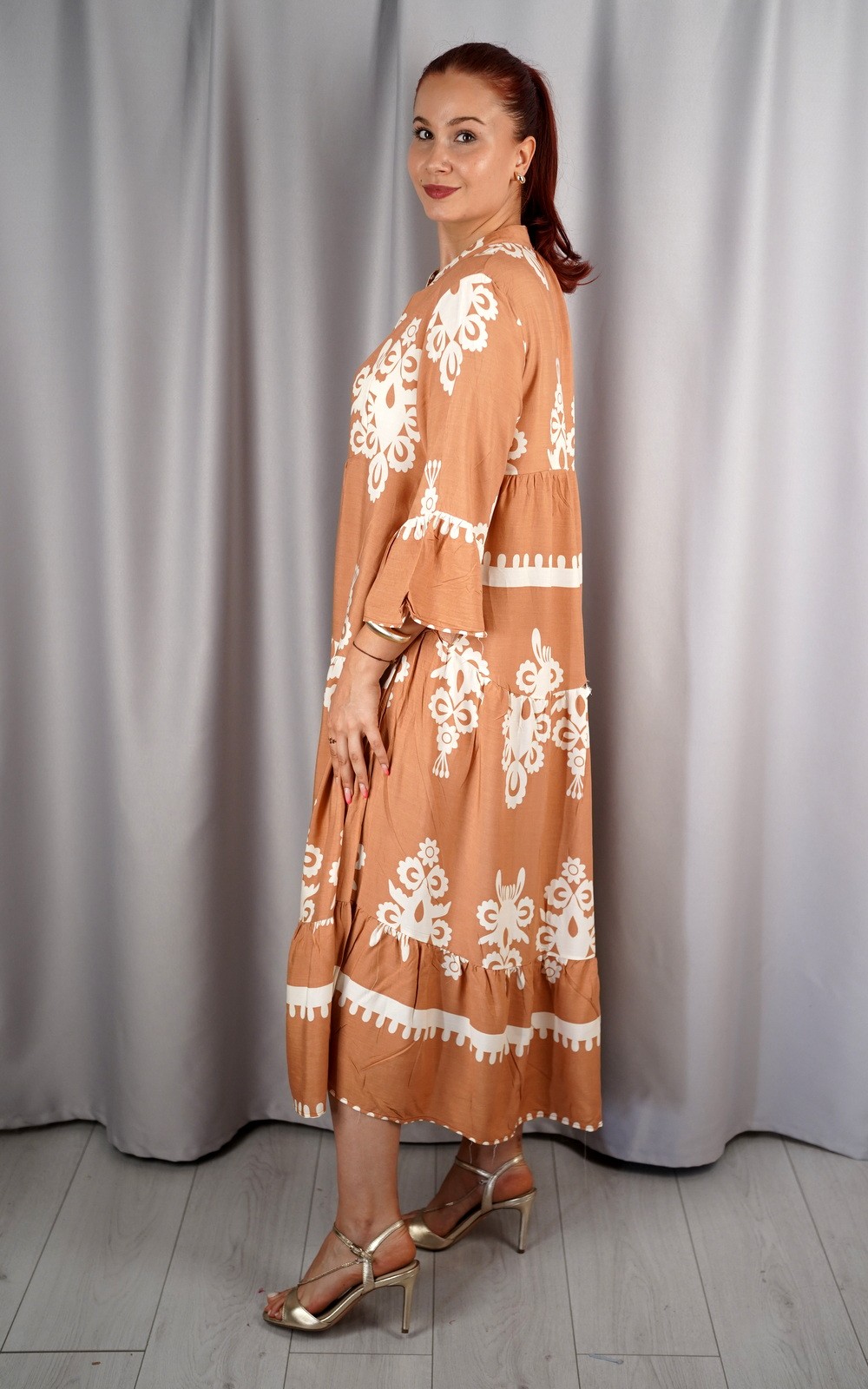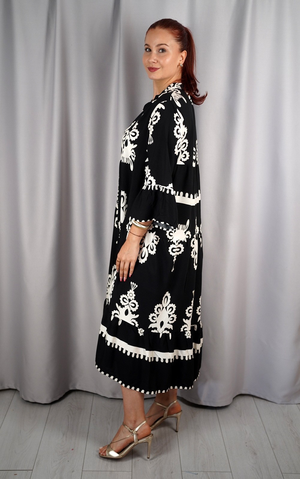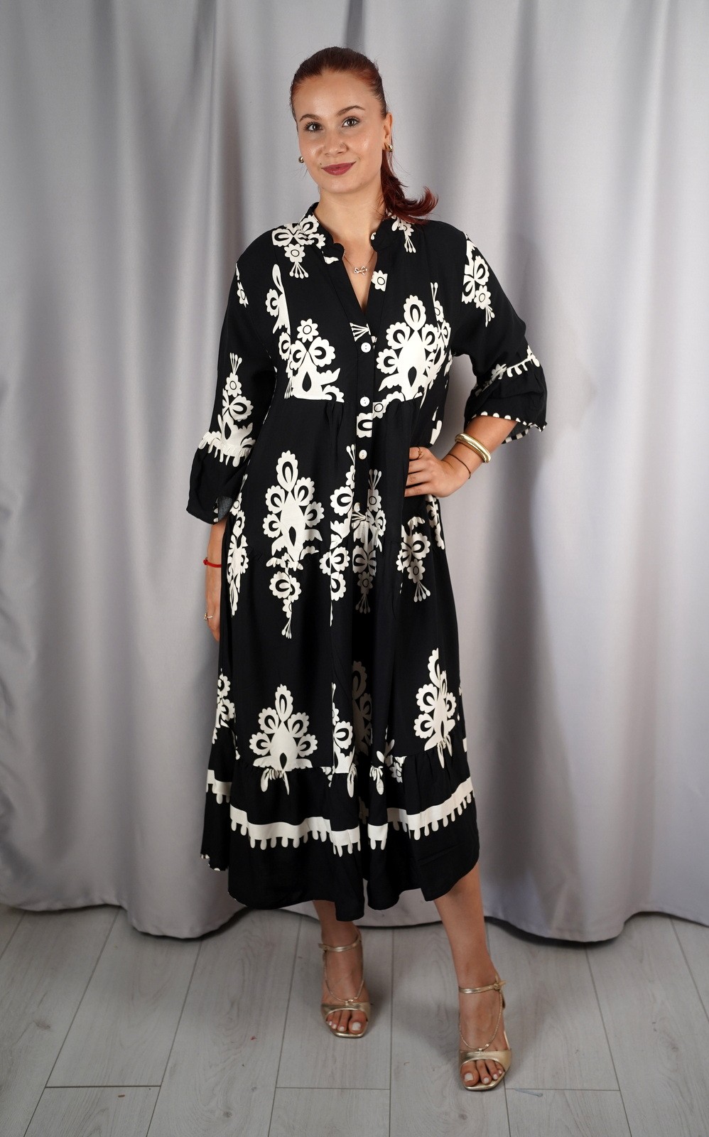 Ova ženska midi haljina s etno uzorkom odiše šarmom i ženstvenošću. Posebno je zanimljiva zahvaljujući volan rukavima koji donose dozu lepršavosti i originalnosti, dok gumbi na prednjem dijelu daju klasičan i praktičan detalj. Lepršavi kroj omogućava slobodu pokreta i udobnost, a lagani materijal osigurava prozračnost i ugodan osjećaj tijekom nošenja. Haljina je savršen izbor za dnevne prilike, šetnje, druženja, ali i za večernje izlazke uz prave modne dodatke. Svestrana je i lako se kombinira s ravnim sandalama za ležeran look ili s elegantnim cipelama za sofisticiraniji stil. Komad koji donosi spoj modernog i tradicionalnog etno stila u garderobu svake žene.