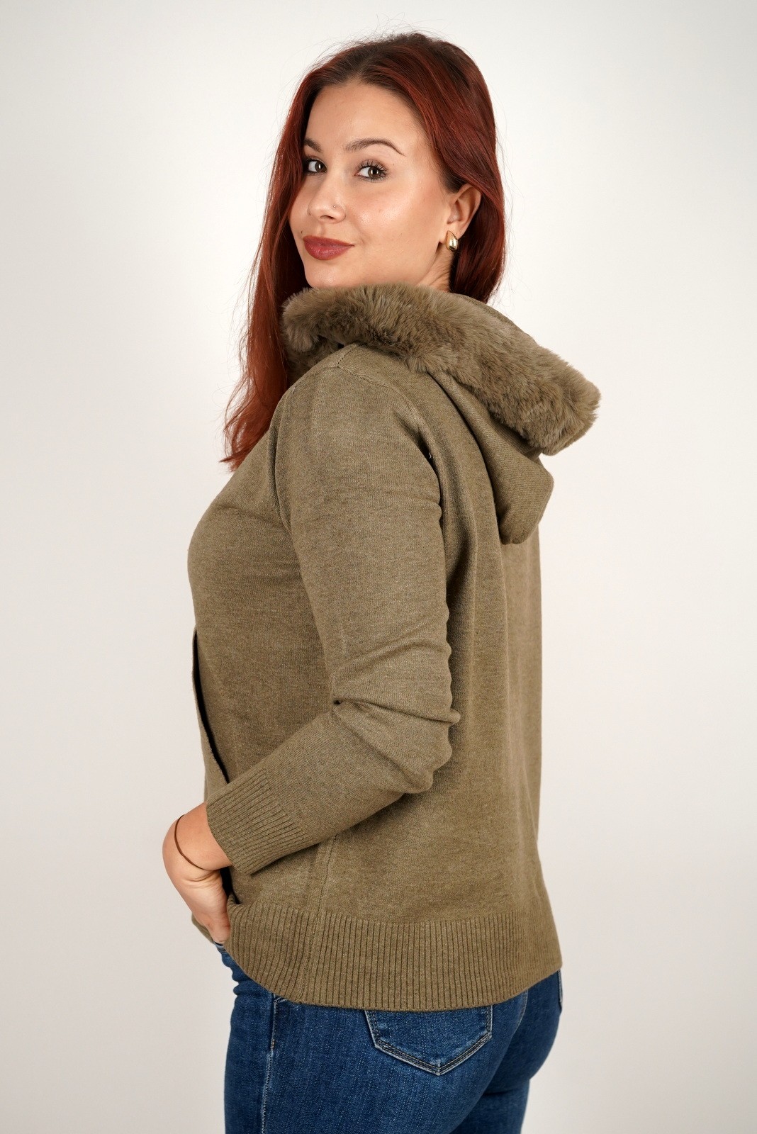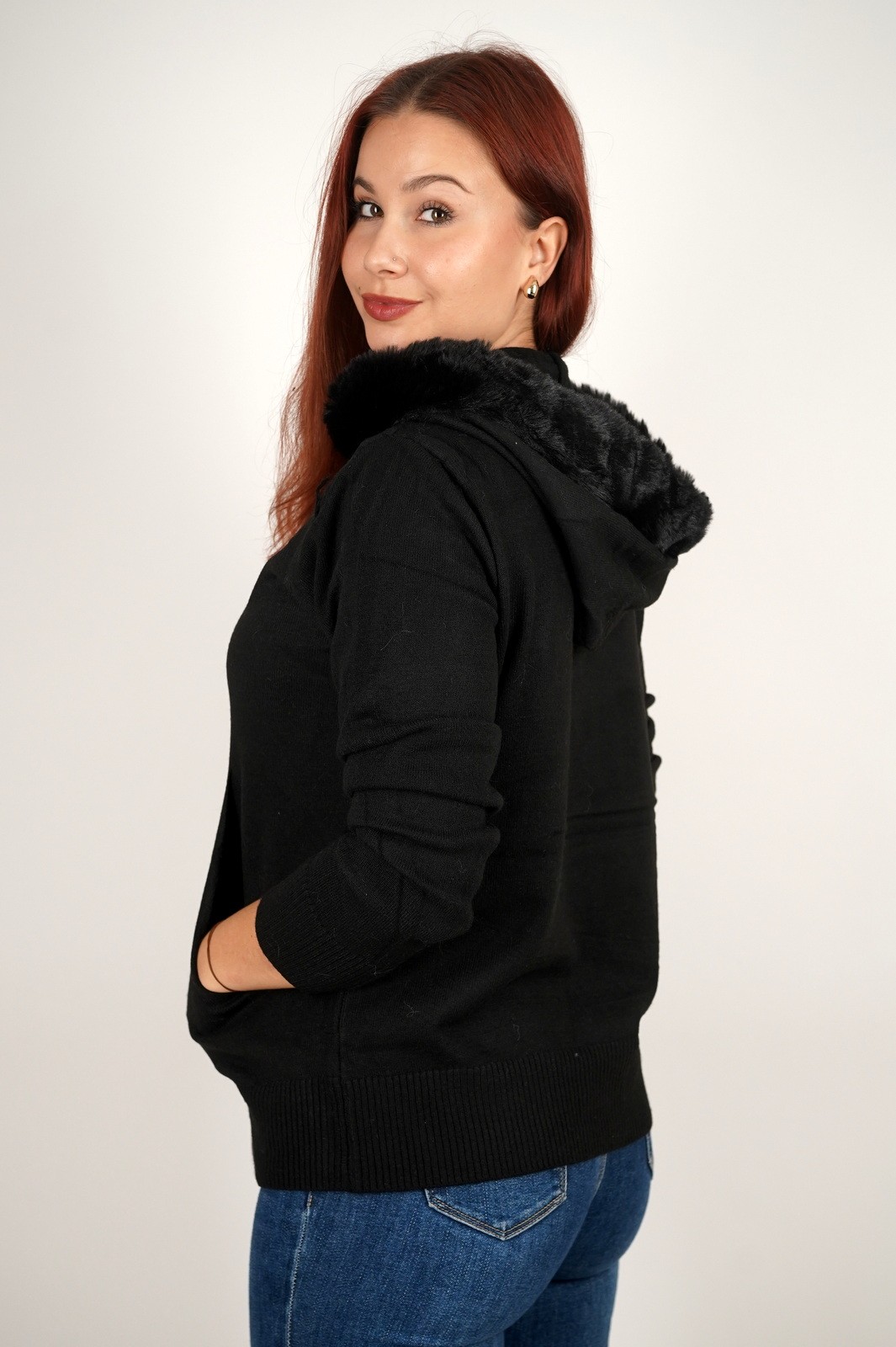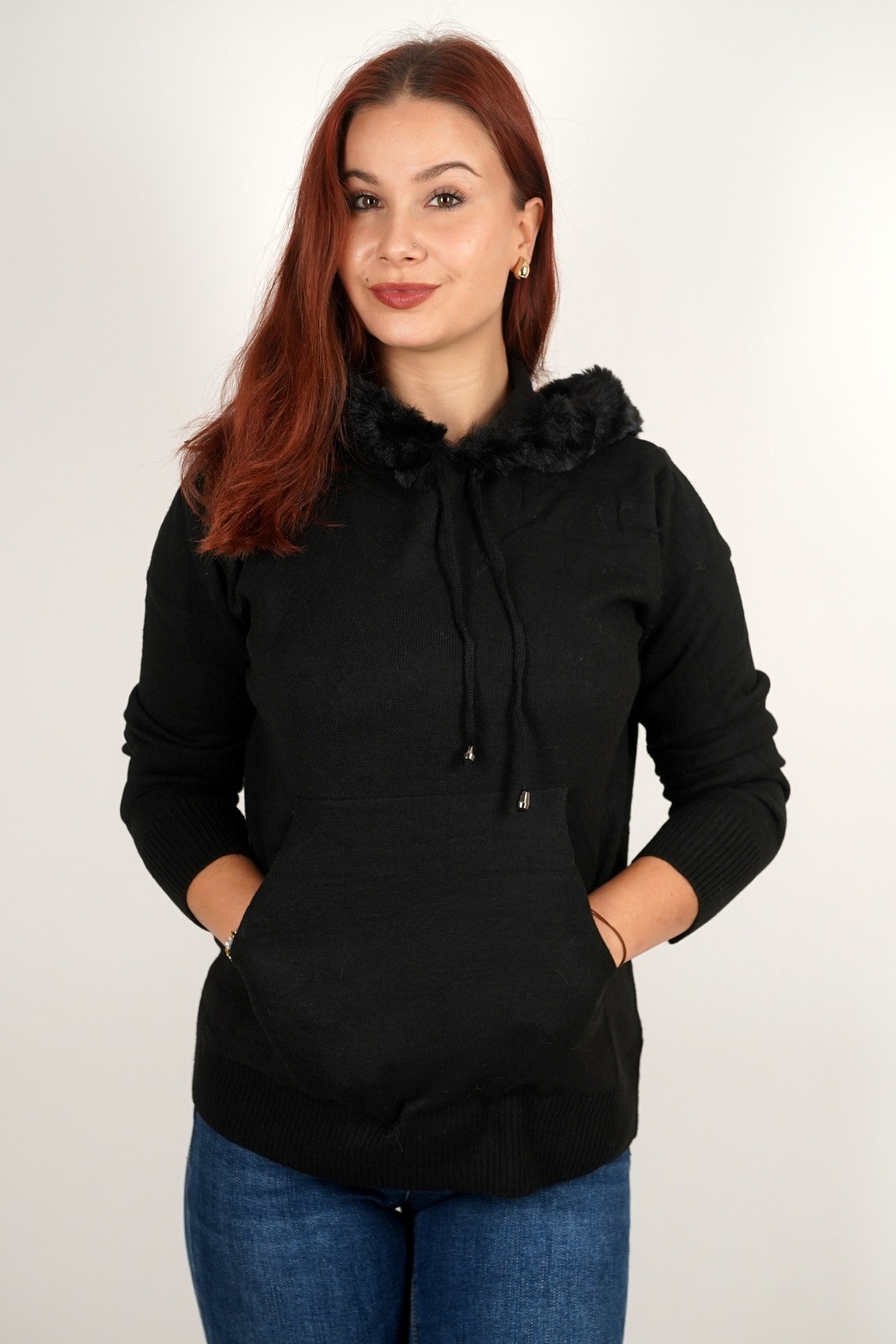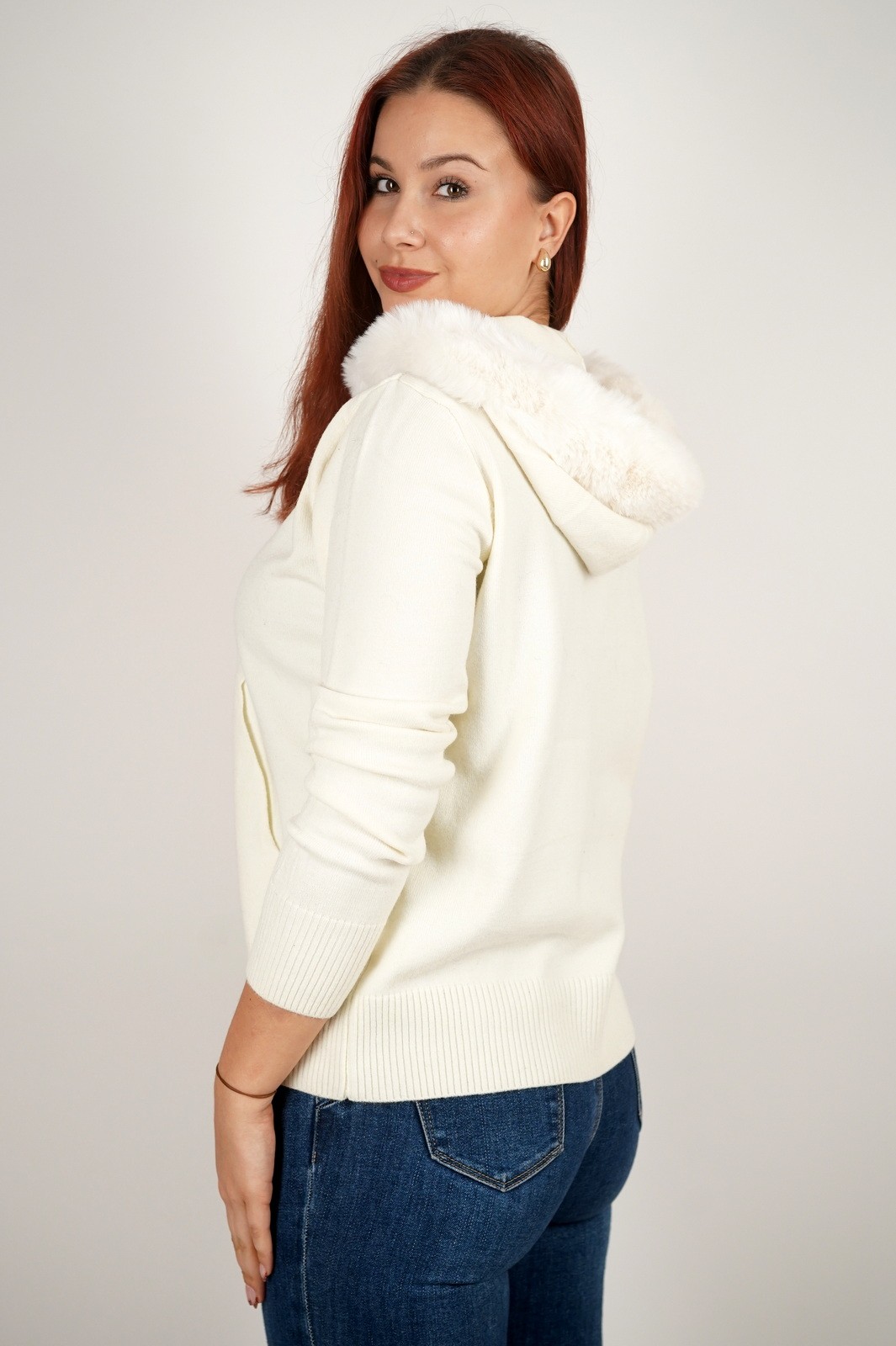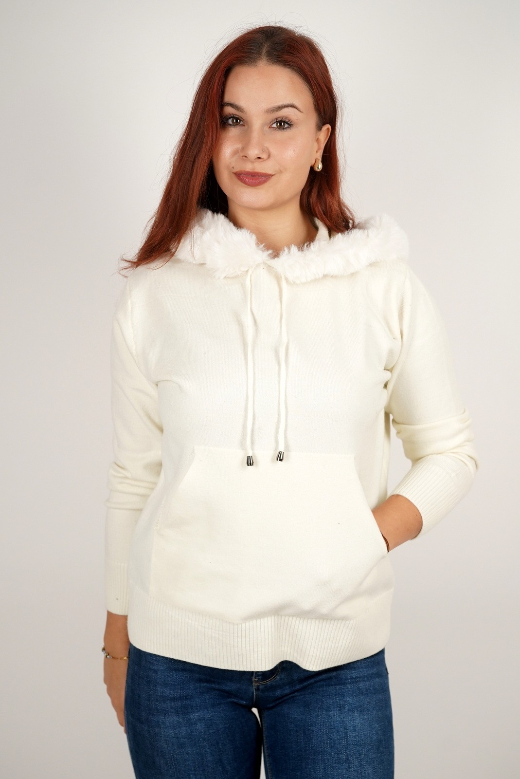 Ženska dukserica fino meko pletivo s krznom na kapuljači – 8297