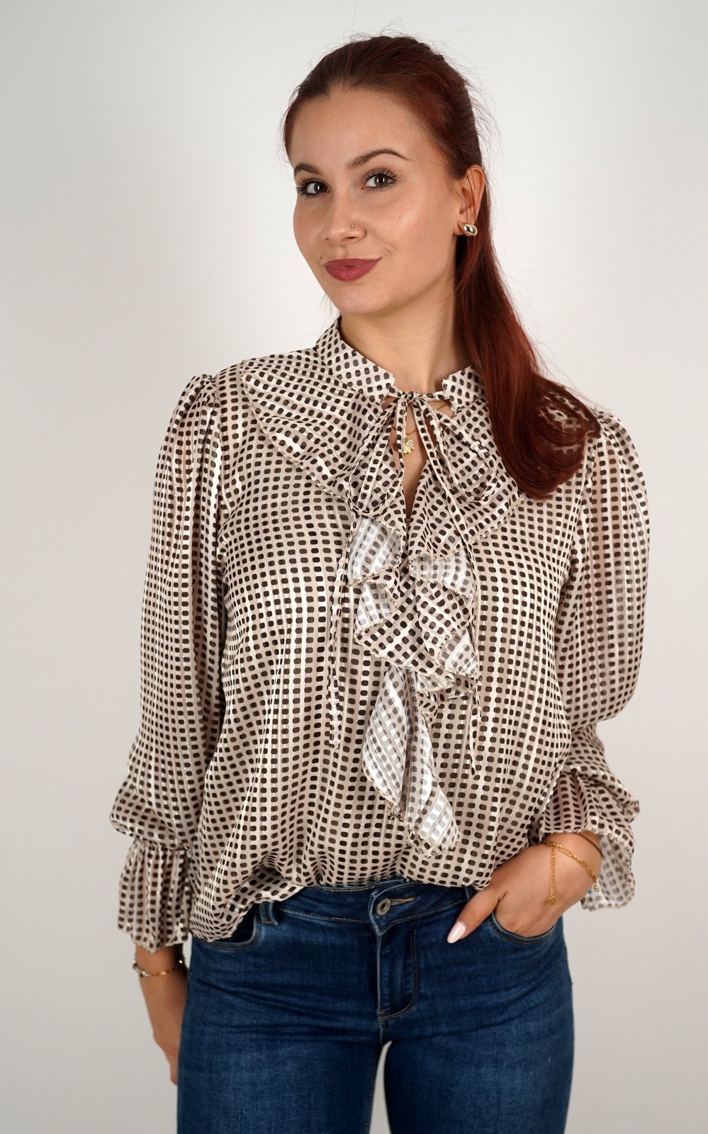 Ova elegantna ženska košulja spaja retro šarm i suvremeni dizajn. Prepoznatljiva po raskošnim volanima i mašnom na ovratniku, stvara ženstven i profinjen izgled koji pristaje svakoj prigodi. Lepršava tkanina pruža udobnost i lakoću, dok uzorak dodaje dinamiku i moderan karakter. Idealna je za ured, poslovne sastanke, večernje izlaske ili svečanije prilike. Uz traperice, elegantne hlače ili suknju, ova košulja uvijek izgleda besprijekorno i s dozom luksuza.