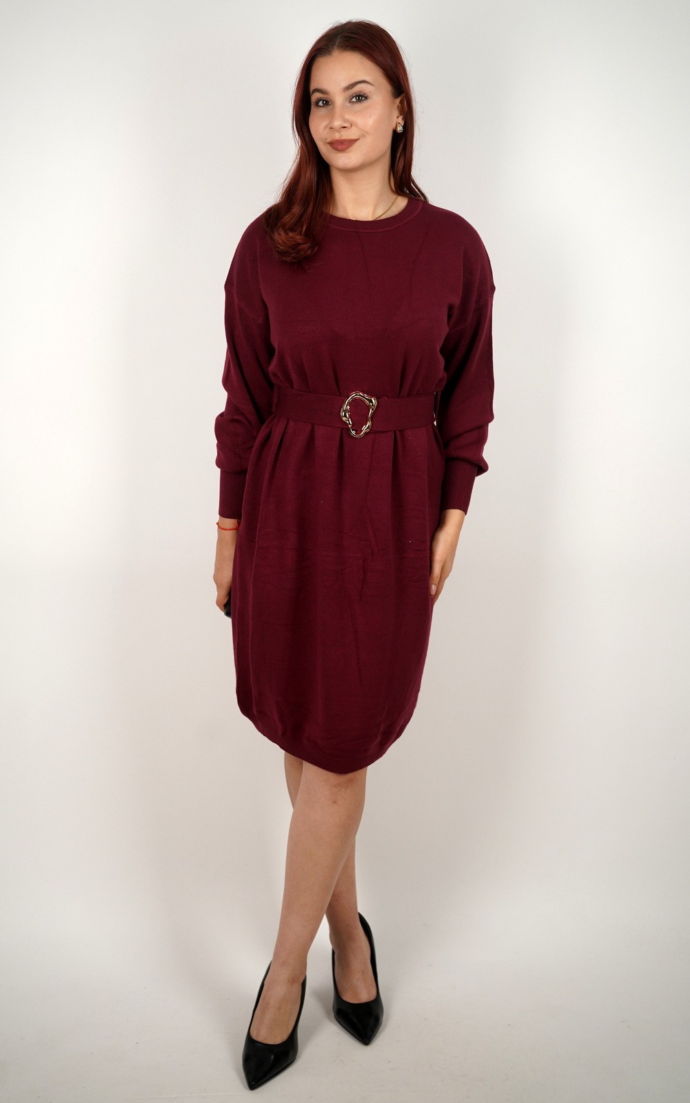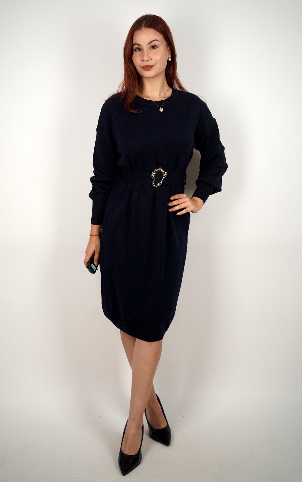 Elegantna haljina od mekanog pletiva koja spaja udobnost i sofisticiran izgled. Model ravnog kroja savršeno pristaje svakoj figuri, a pojas s dekorativnom kopčom naglašava struk i dodaje modni naglasak. Dugi rukavi i jednostavan okrugli izrez čine je idealnim izborom za svakodnevne, poslovne i večernje kombinacije. Haljina pruža osjećaj topline i mekoće, a uz čizme ili salonke lako se pretvara u chic outfit za svaku priliku.