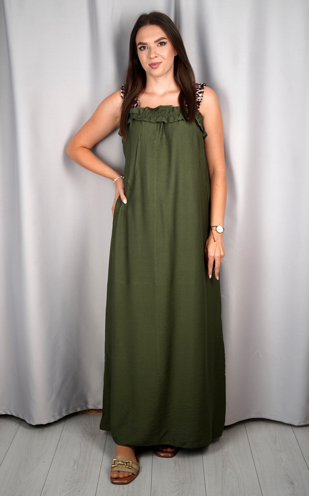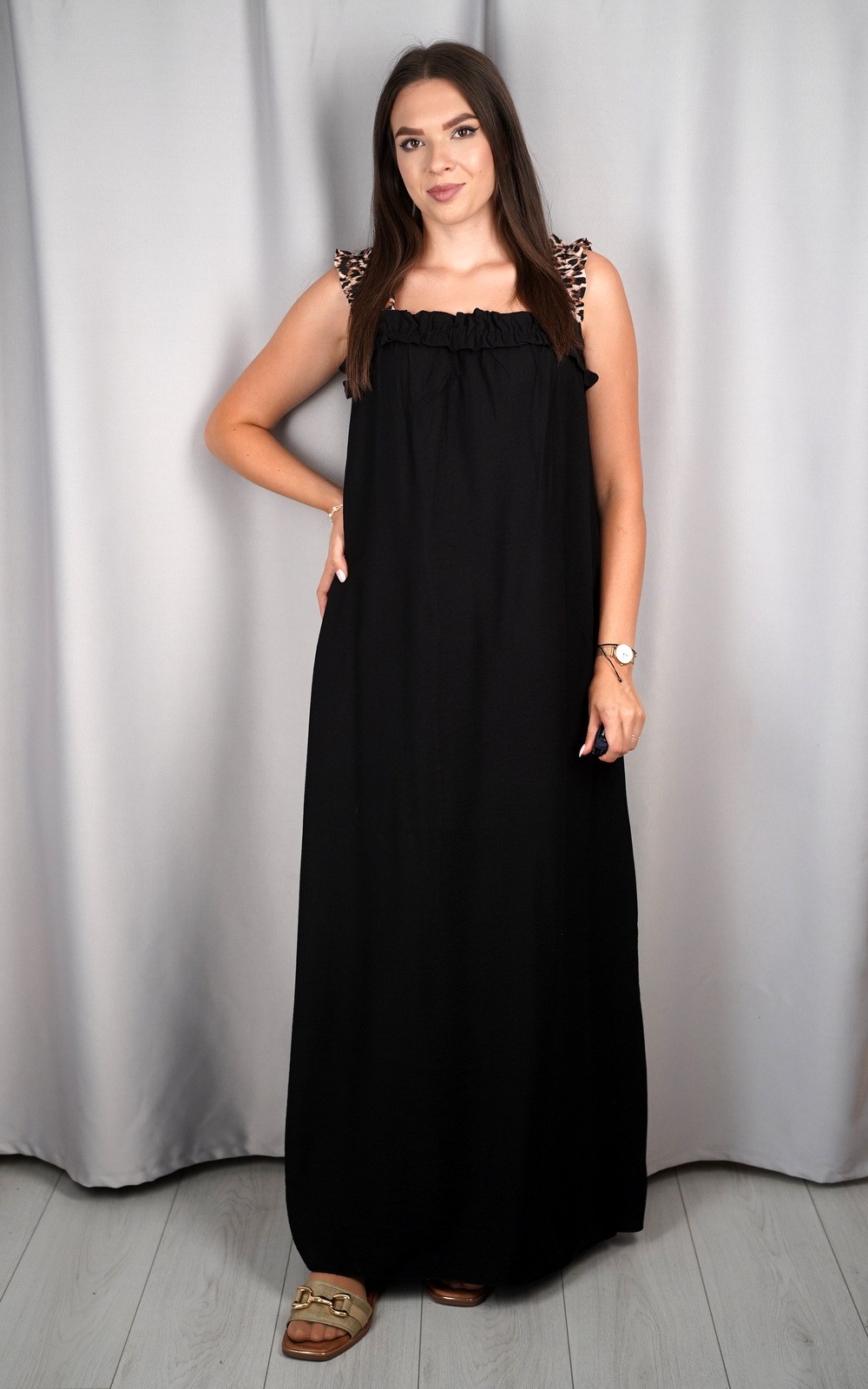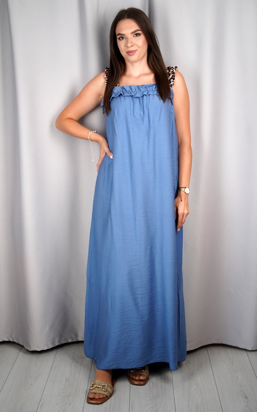 Ova duga lepršava haljina s volanom na dekolteu i detaljima uzorka na naramenicama unosi dašak romantičnog i razigranog stila u svaku priliku. Izrađena od laganog i prozračnog materijala, pruža maksimalnu udobnost i slobodu pokreta, savršena za tople ljetne dane. Široki kroj i lepršava silueta omogućuju opušten izgled, dok atraktivni detalji na naramenicama daju haljini poseban šarm. Odličan izbor za plažu, šetnje, ljetne izlaske ili putovanja, kombinira udobnost i moderni dizajn u jednom komadu.