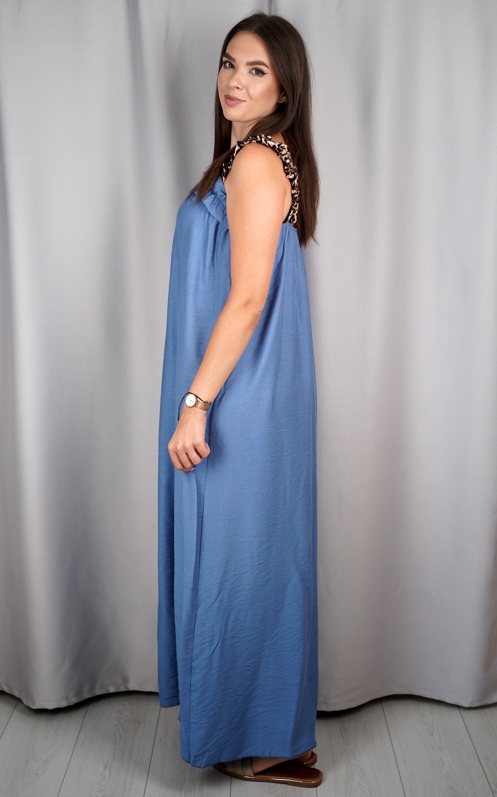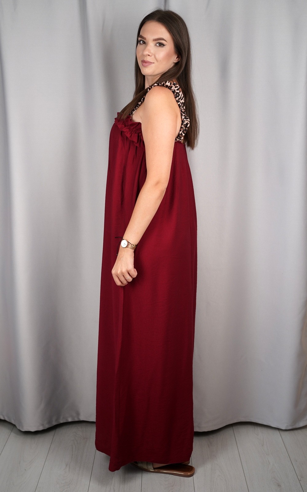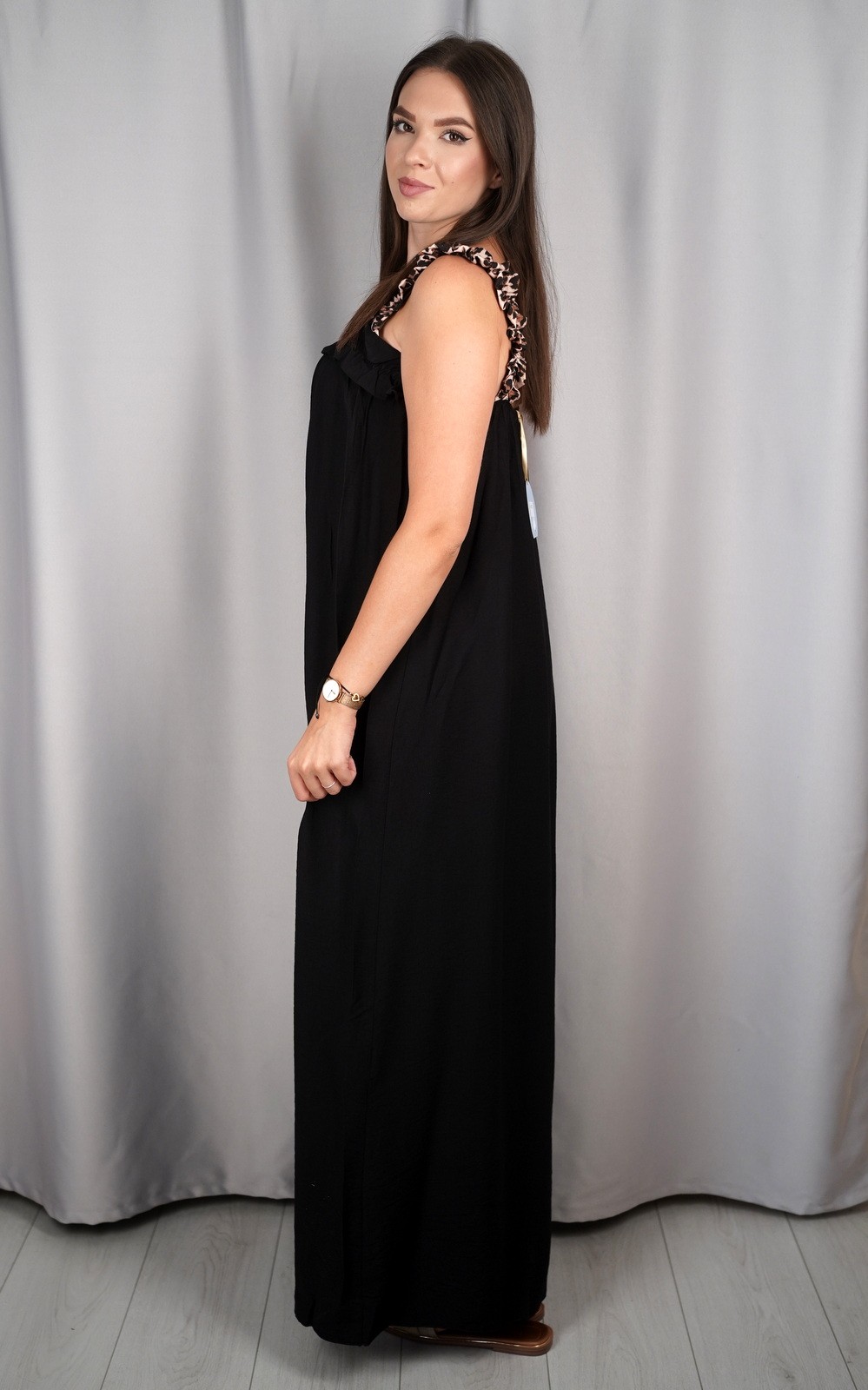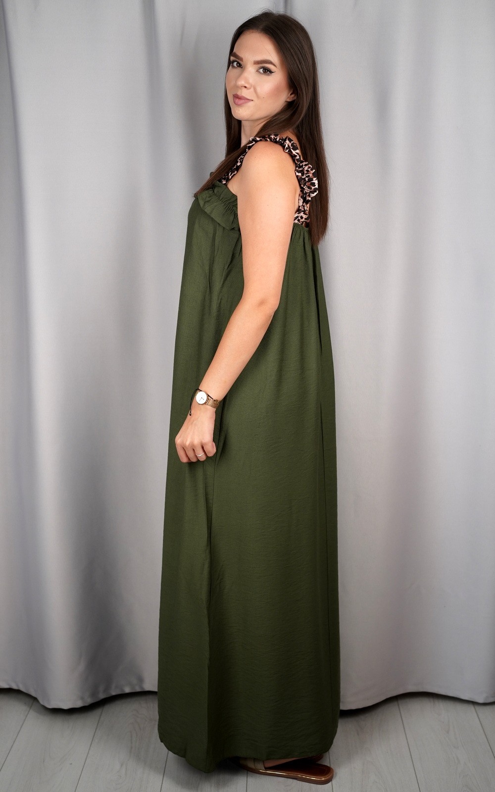 Ova duga lepršava haljina s volanom na dekolteu i detaljima uzorka na naramenicama unosi dašak romantičnog i razigranog stila u svaku priliku. Izrađena od laganog i prozračnog materijala, pruža maksimalnu udobnost i slobodu pokreta, savršena za tople ljetne dane. Široki kroj i lepršava silueta omogućuju opušten izgled, dok atraktivni detalji na naramenicama daju haljini poseban šarm. Odličan izbor za plažu, šetnje, ljetne izlaske ili putovanja, kombinira udobnost i moderni dizajn u jednom komadu.
