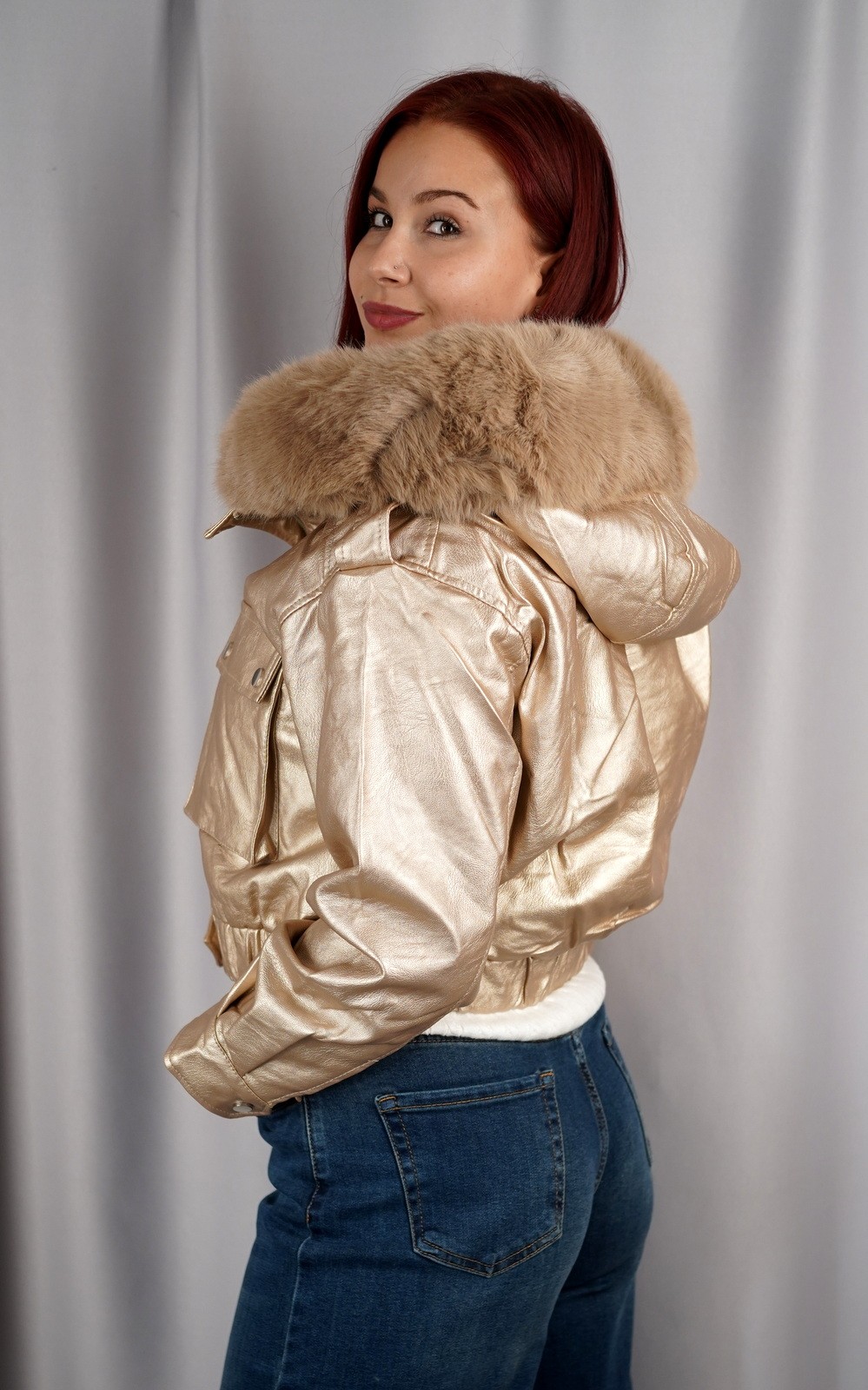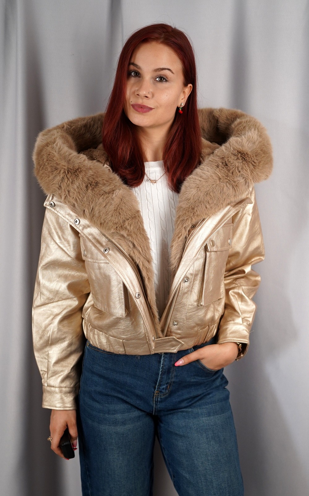 Ženska jakna eko koža s kapuljačom i bogatim krznom – u veličinama – V6372