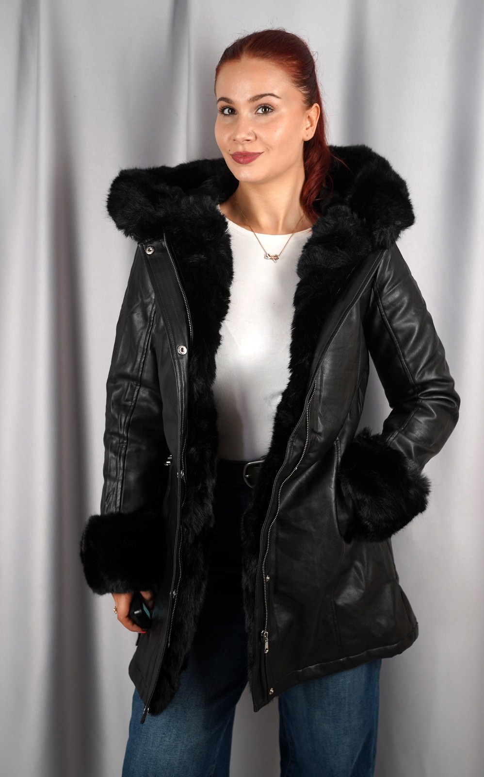 Ženska jakna eko koža s kapuljačom, krznom i vezicom u struku – u veličinama – 6373