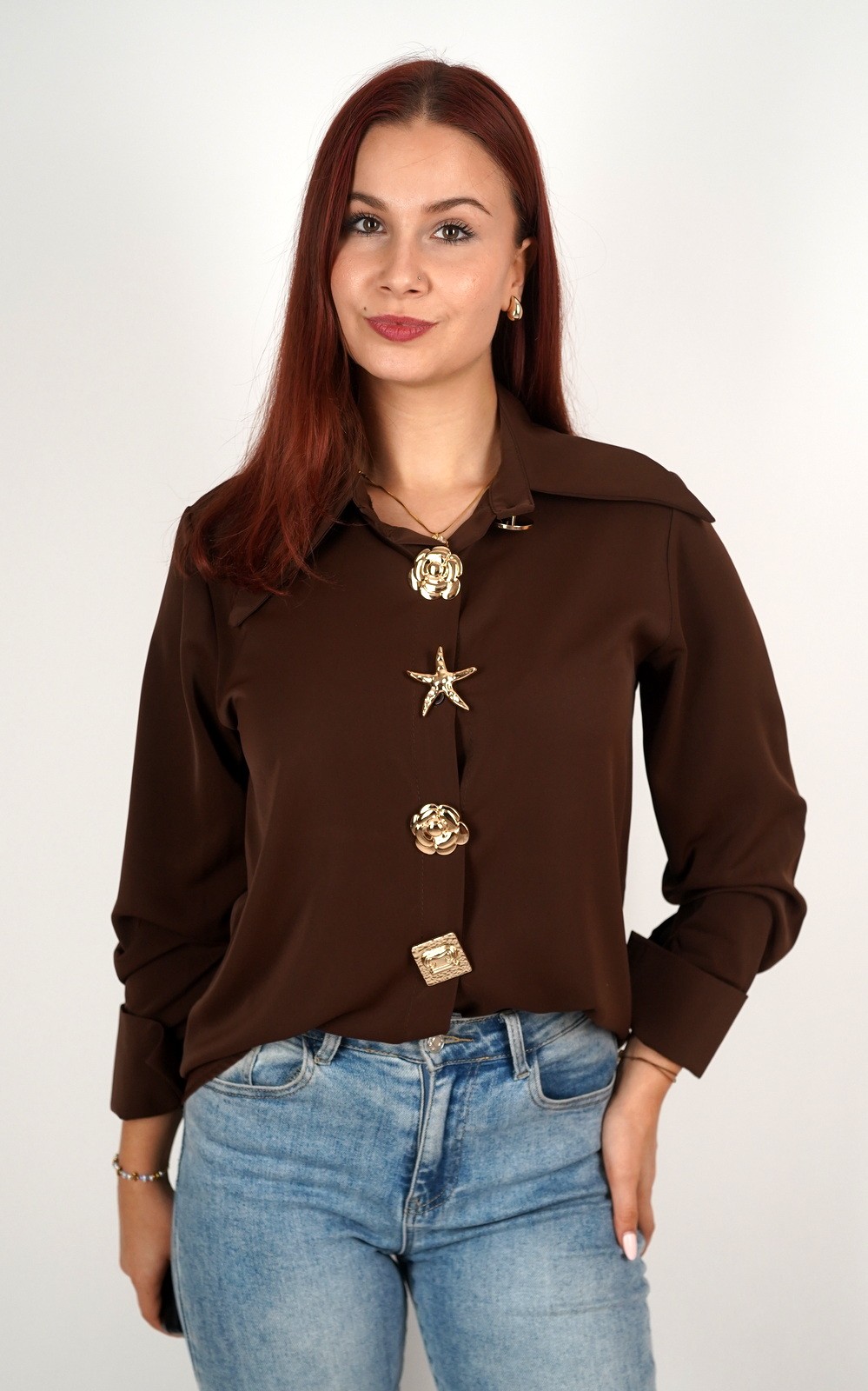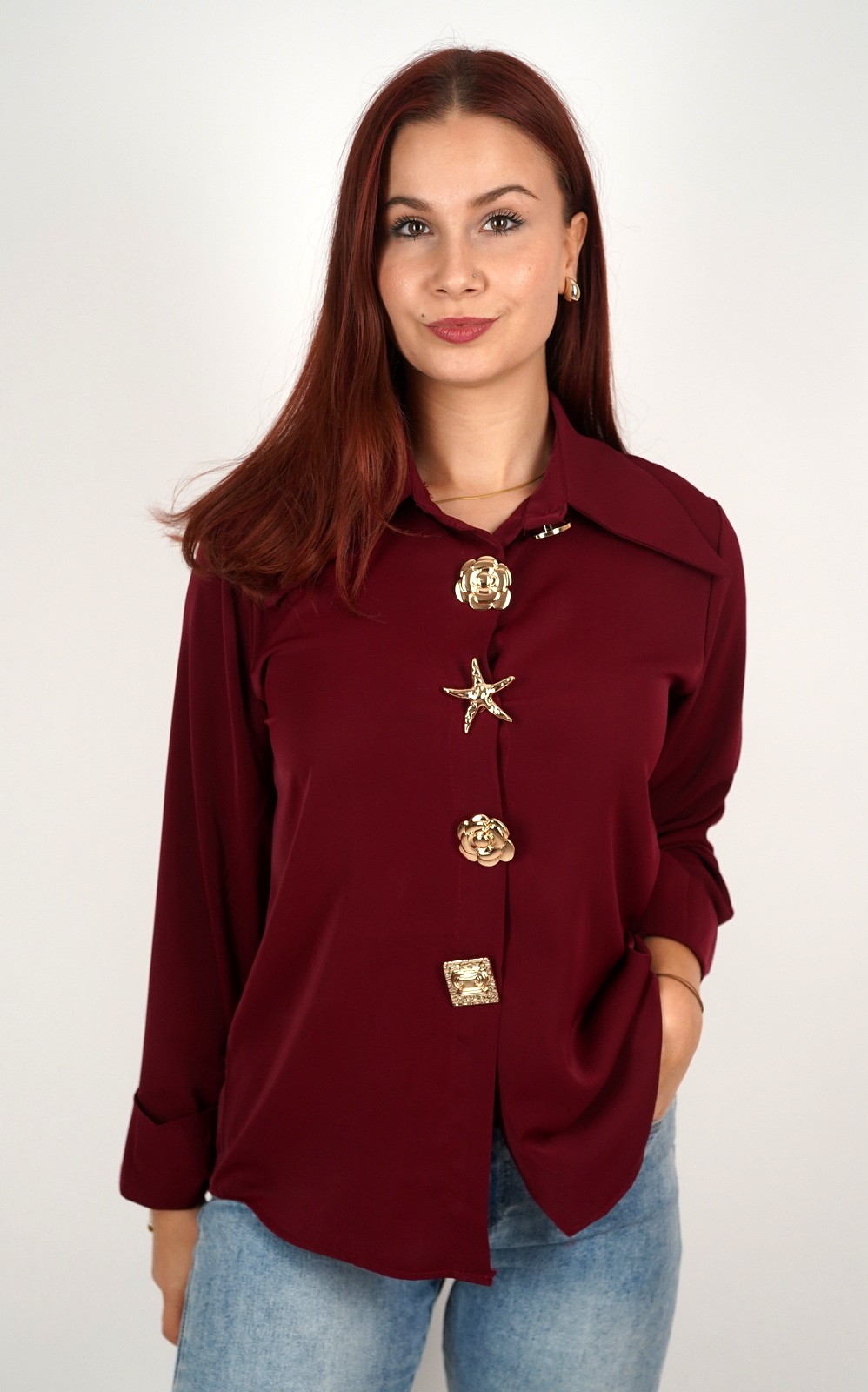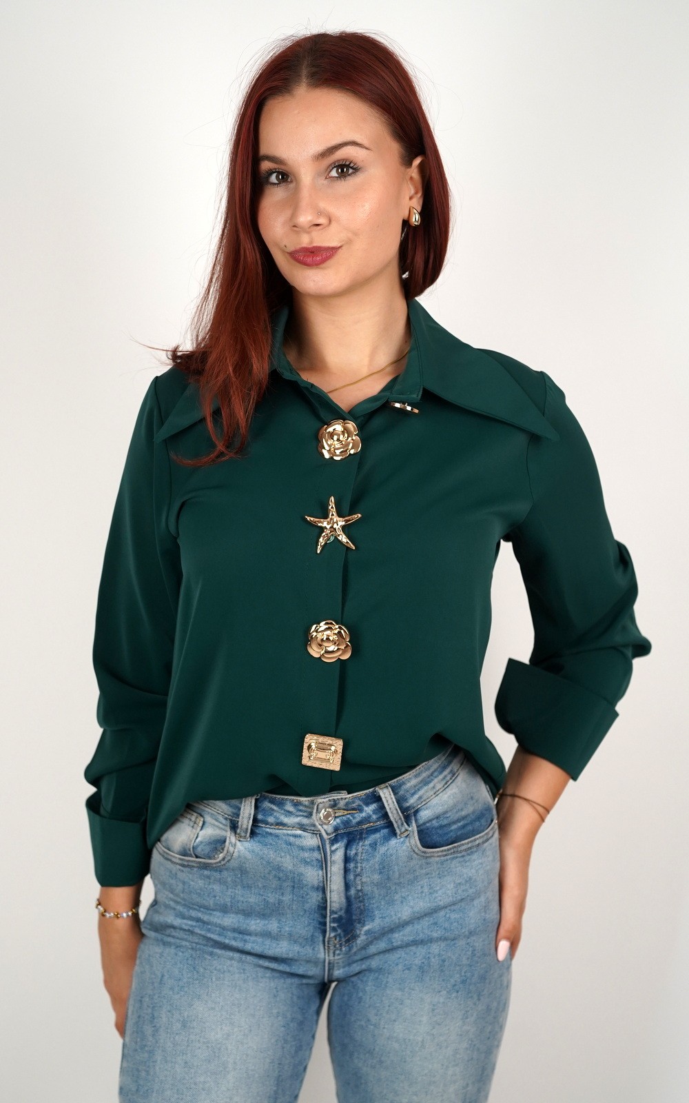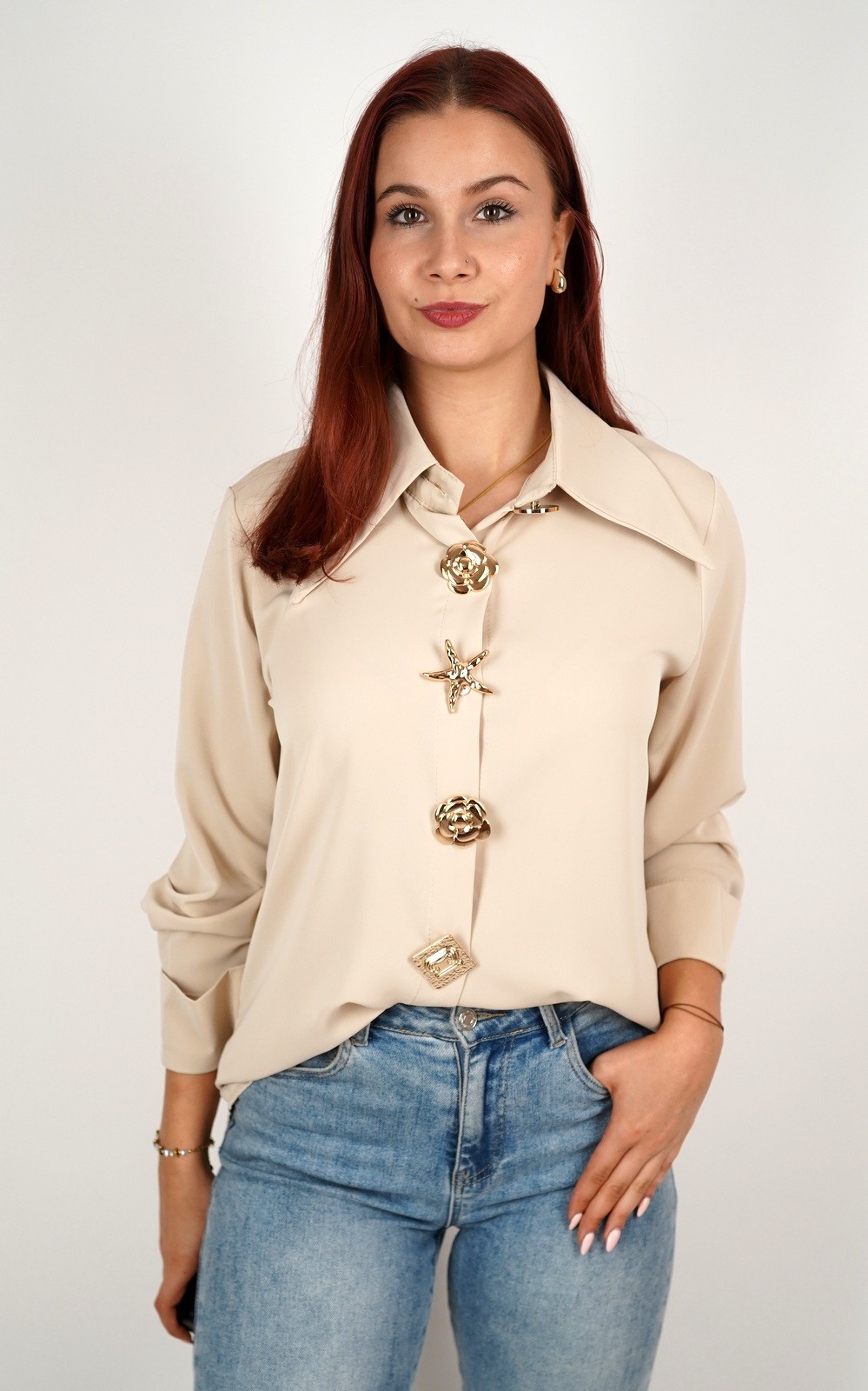 Ova ženska elegantna košulja odiše luksuzom i sofisticiranim stilom zahvaljujući unikatnim ukrasnim gumbima u različitim motivima – od cvijeta, preko morske zvijezde do klasičnih dekorativnih formi. Izrađena je u udobnom kroju s dugim rukavima i izraženim ovratnikom koji dodatno naglašava dojam elegancije. Idealna je za svečane prilike, poslovne kombinacije ili kao poseban statement komad u ležernijem outfitu. Lako se uklapa s trapericama za chic izgled ili elegantnim hlačama i suknjama za profinjeniji dojam.