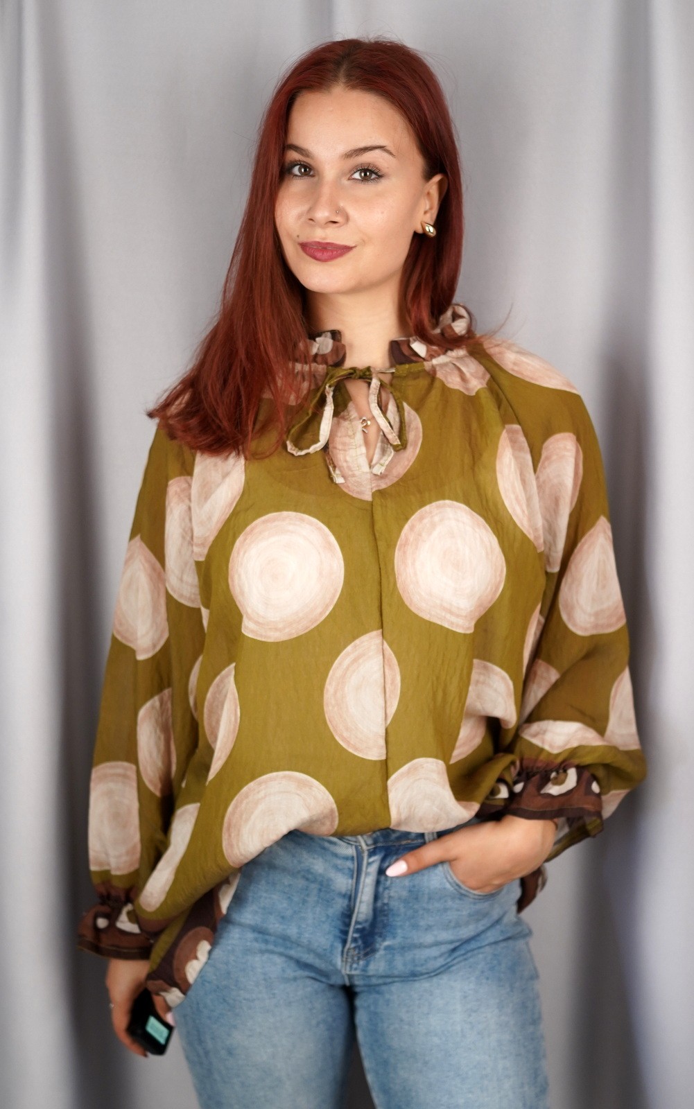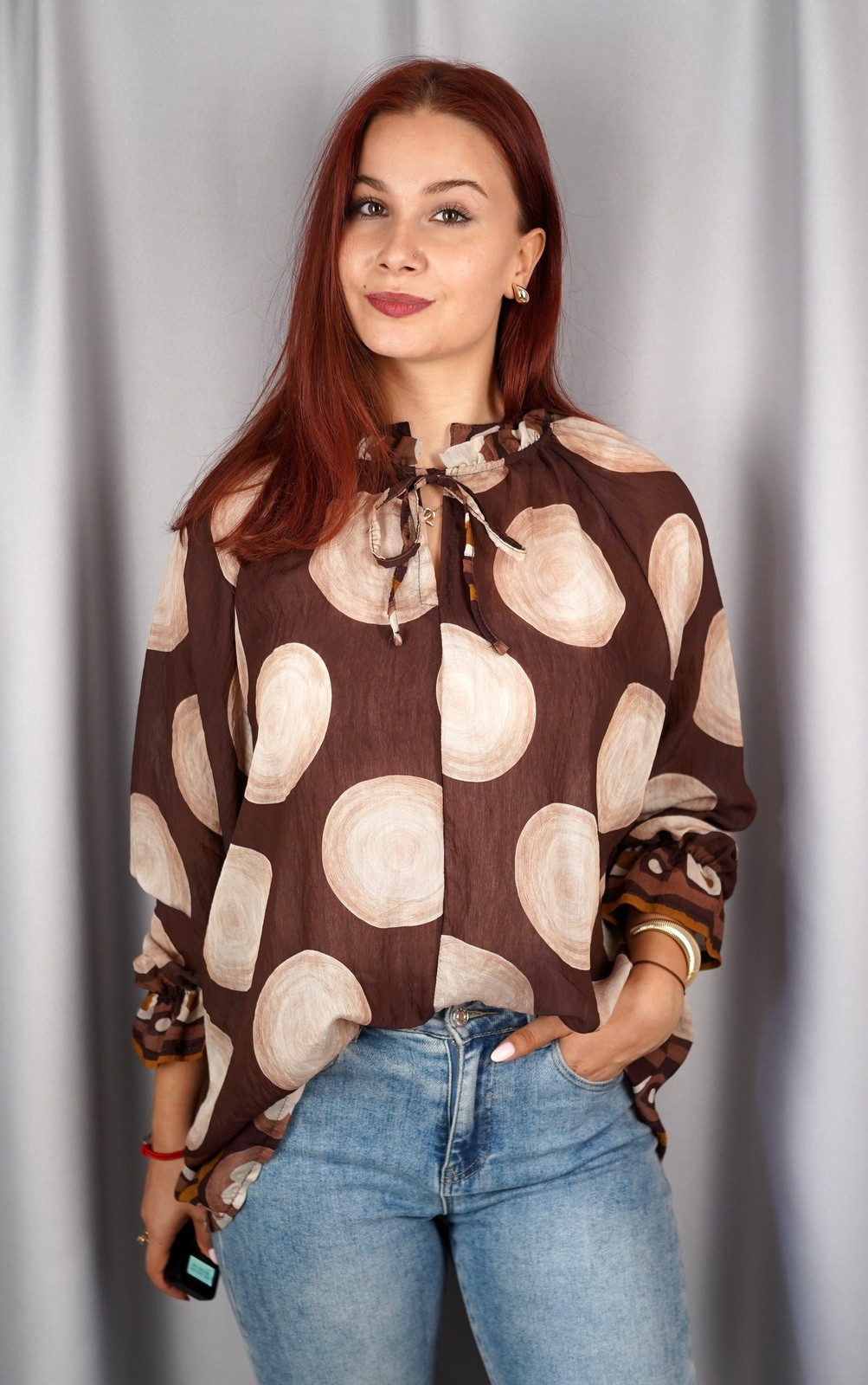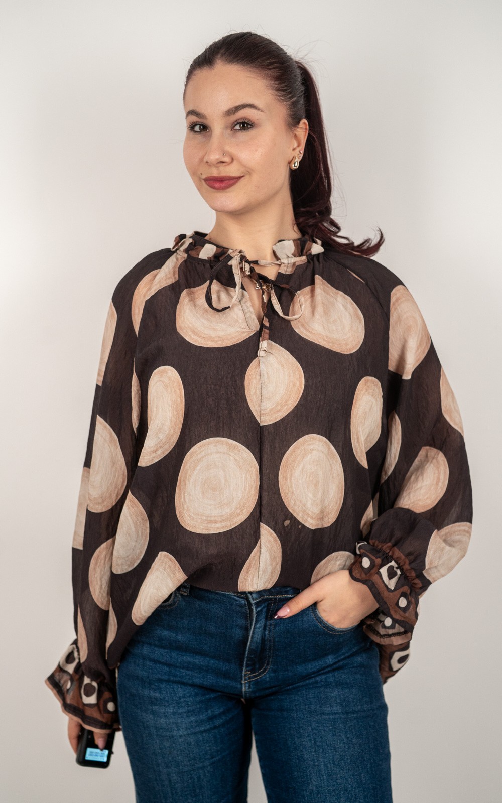 Ženska košulja na točkice s volanom i dekorativnom mašnom – krupne točkice – 5070/5050