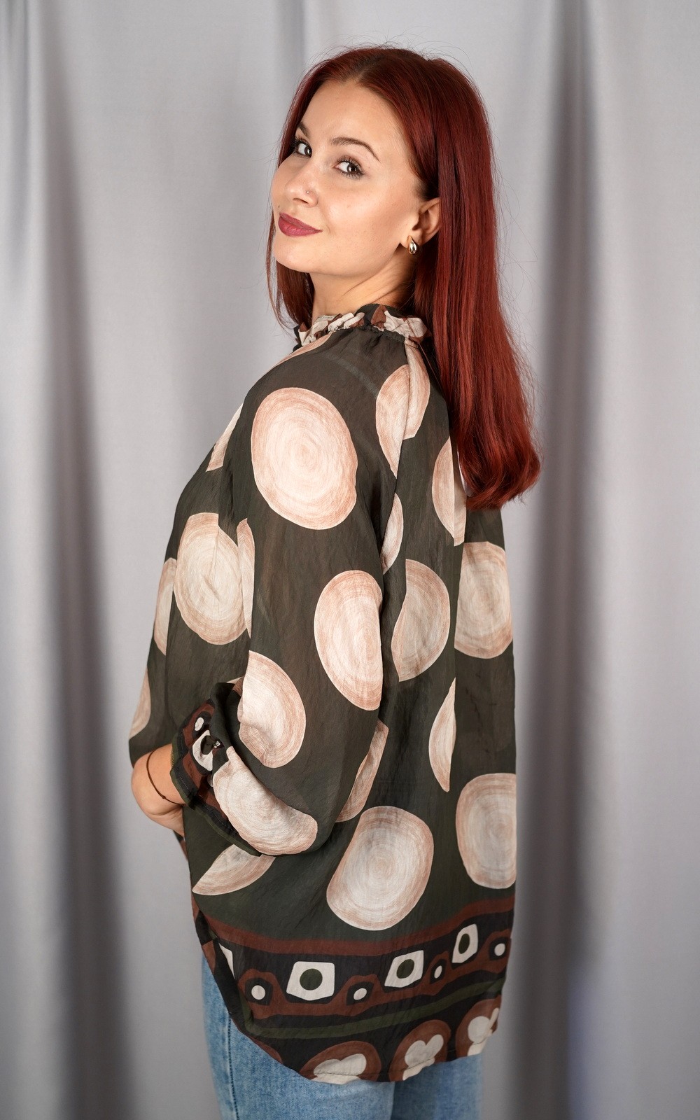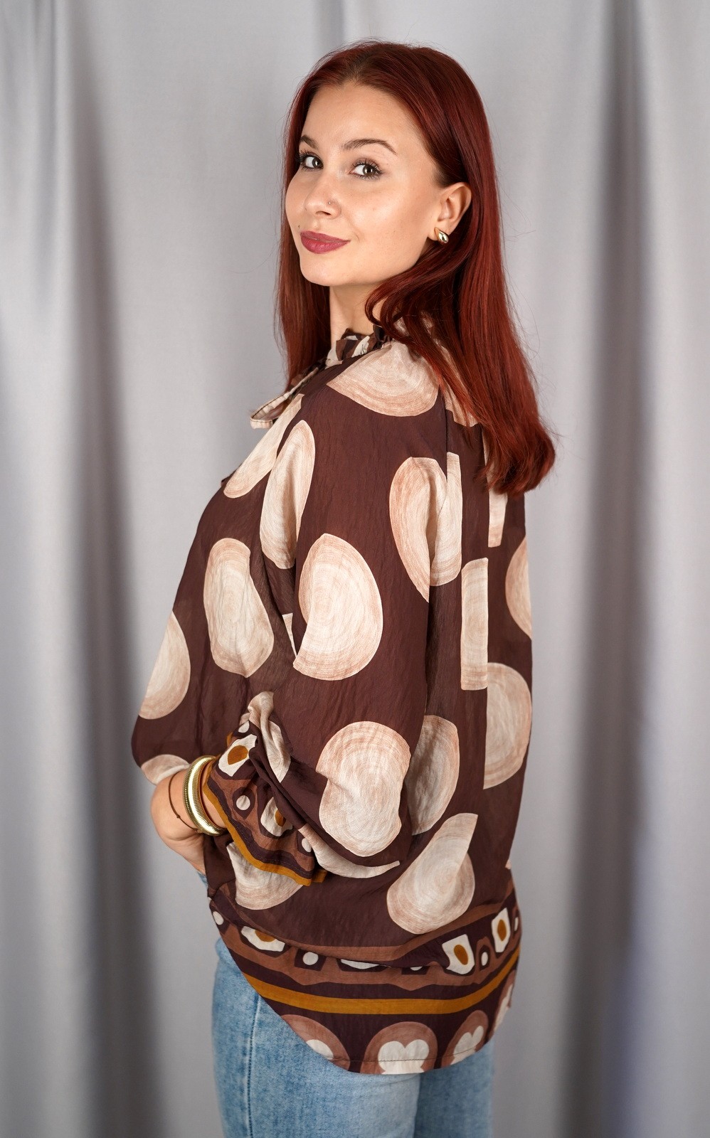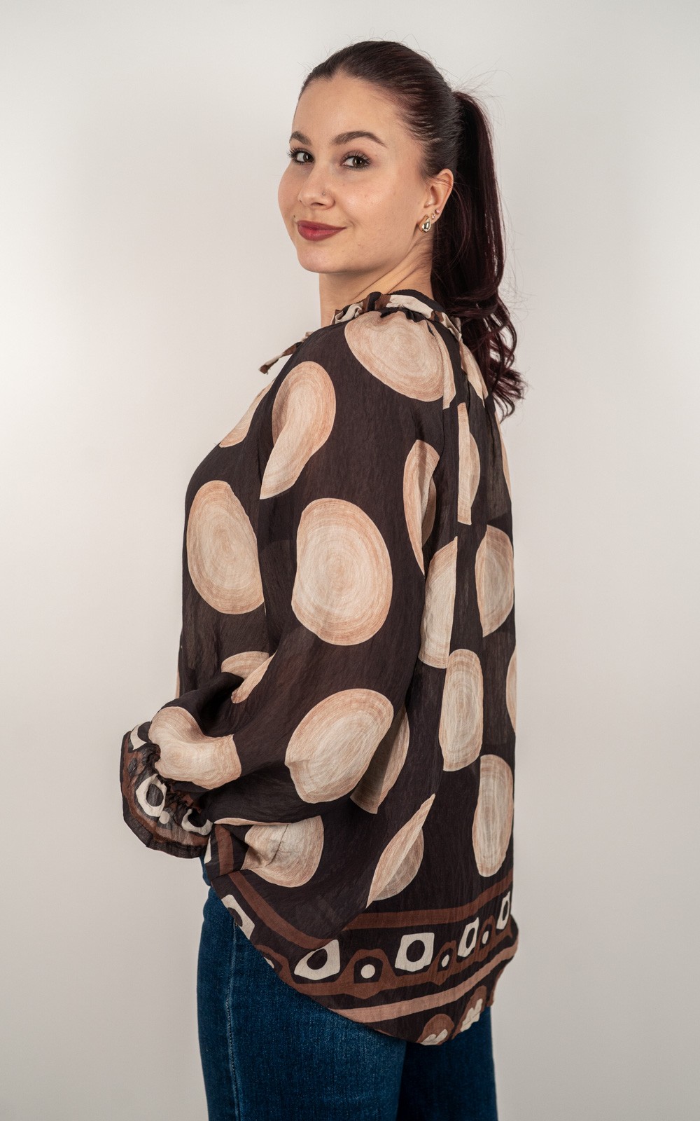 Ženska košulja na točkice s volanom i dekorativnom mašnom – krupne točkice – 5070/5050