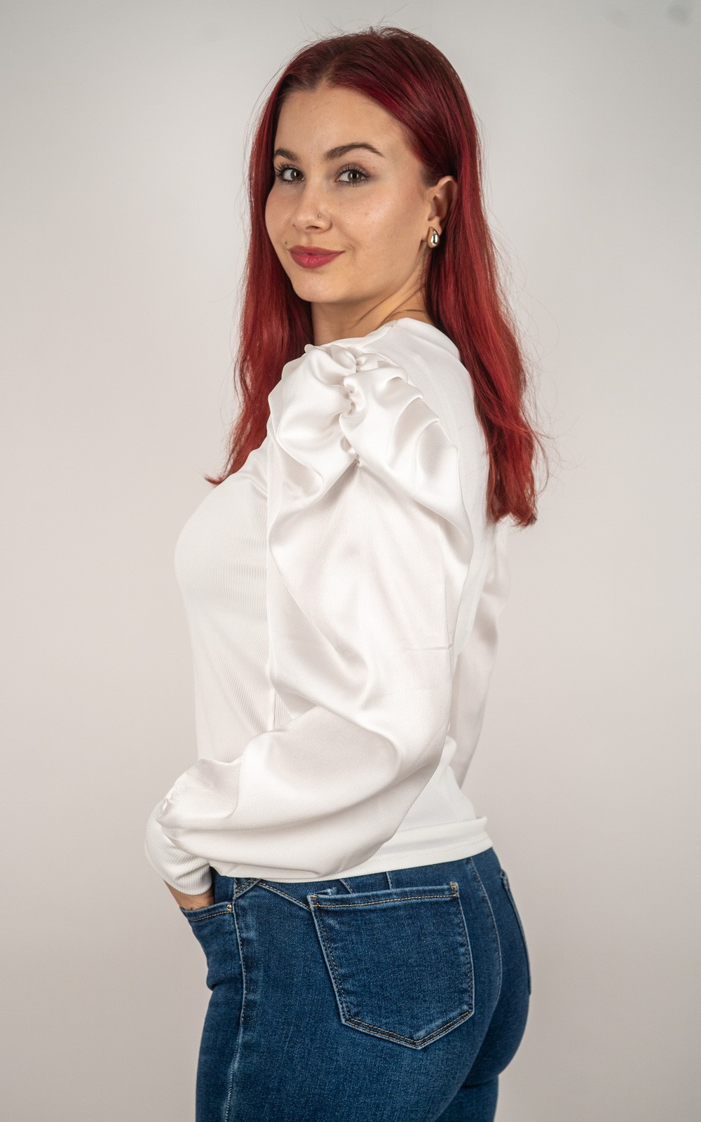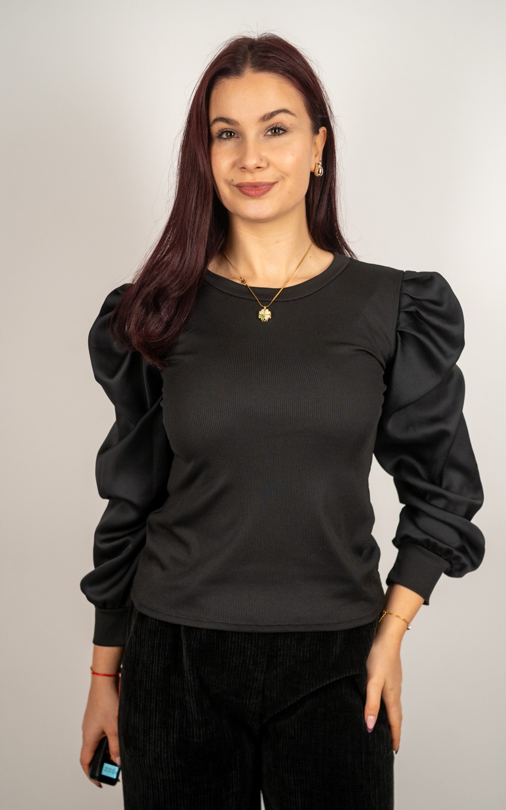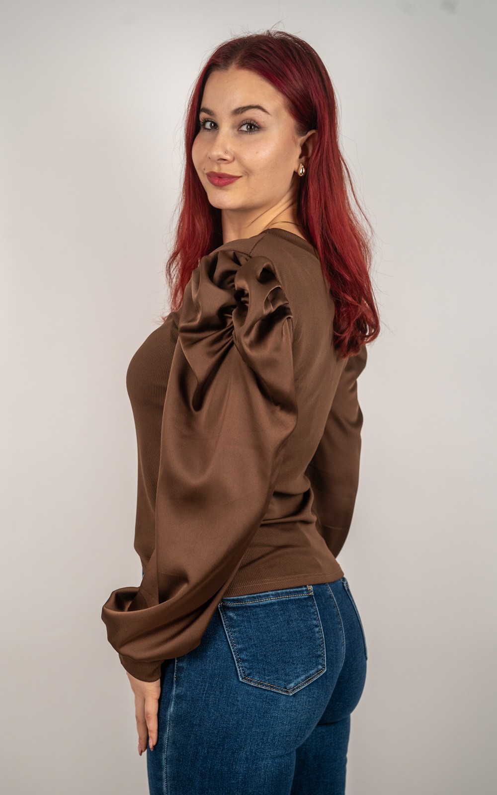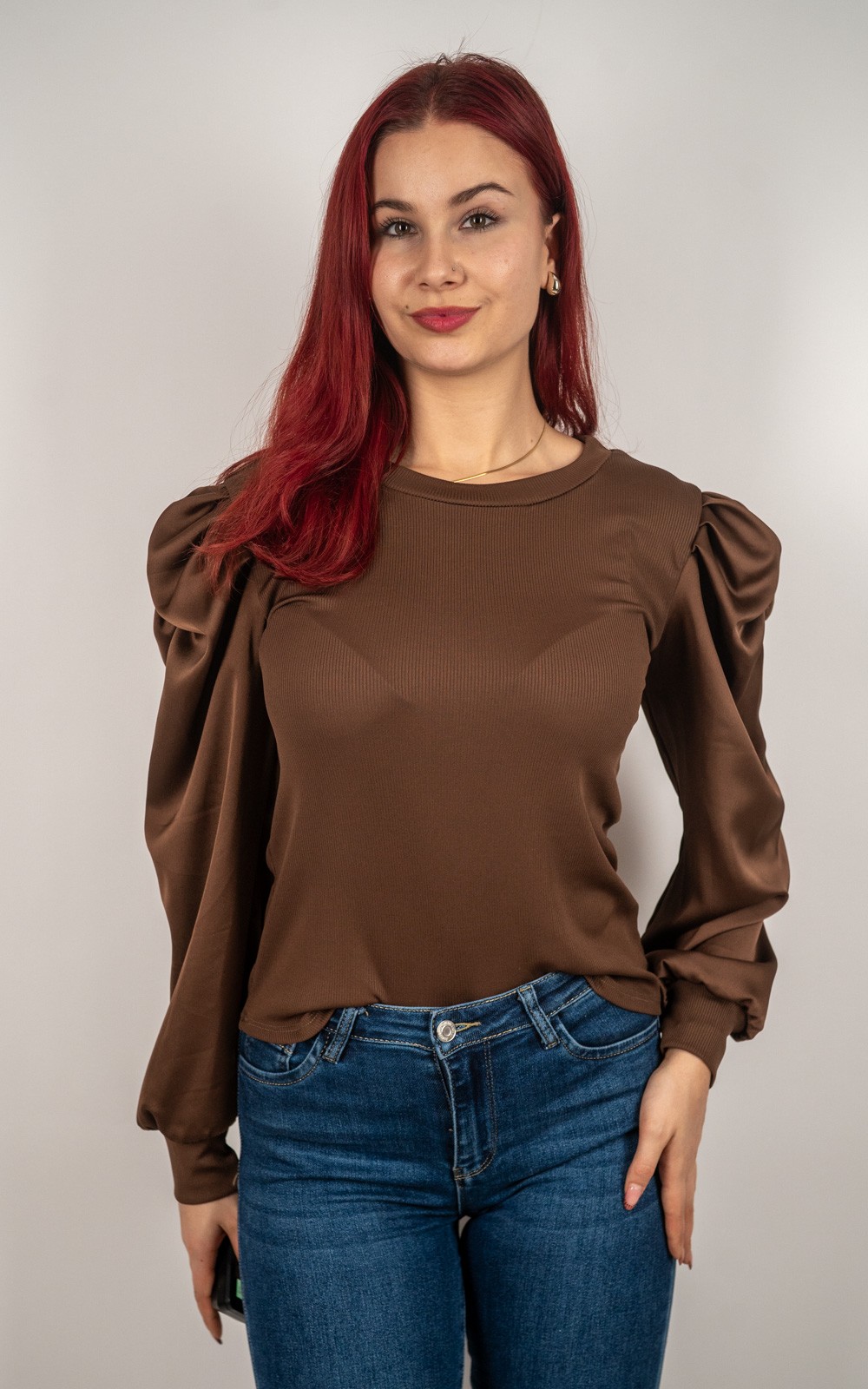 Ženska majica s puf rukavima od satenskog materijala – 89355
