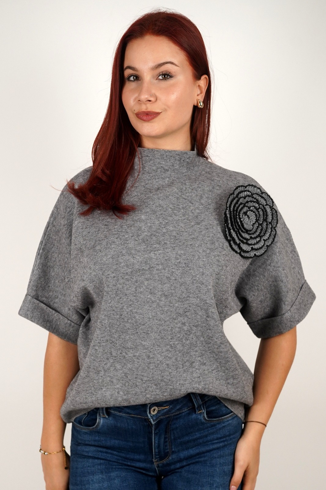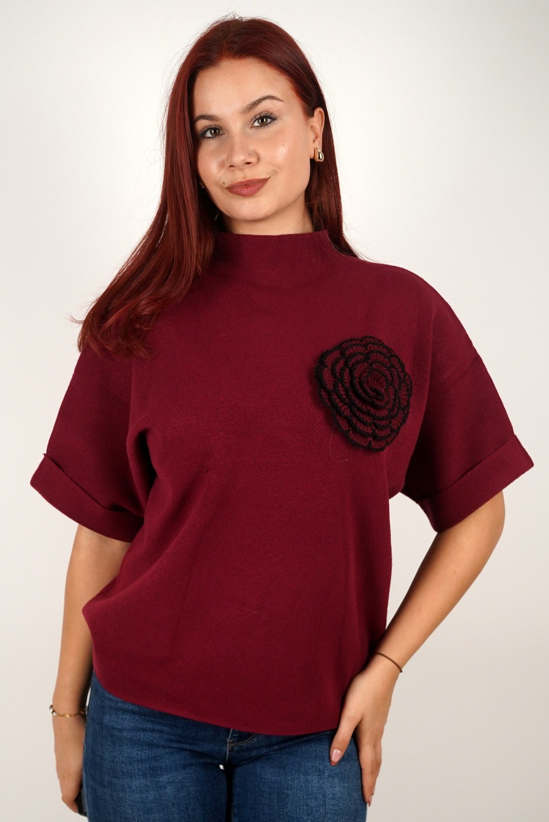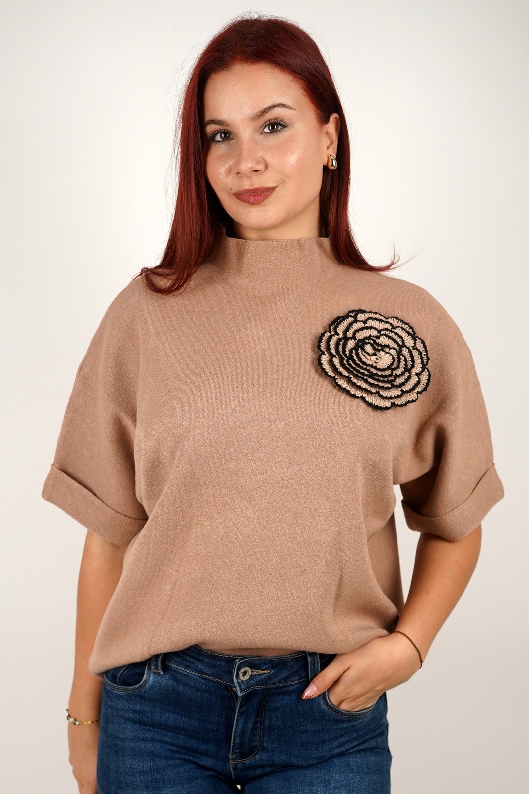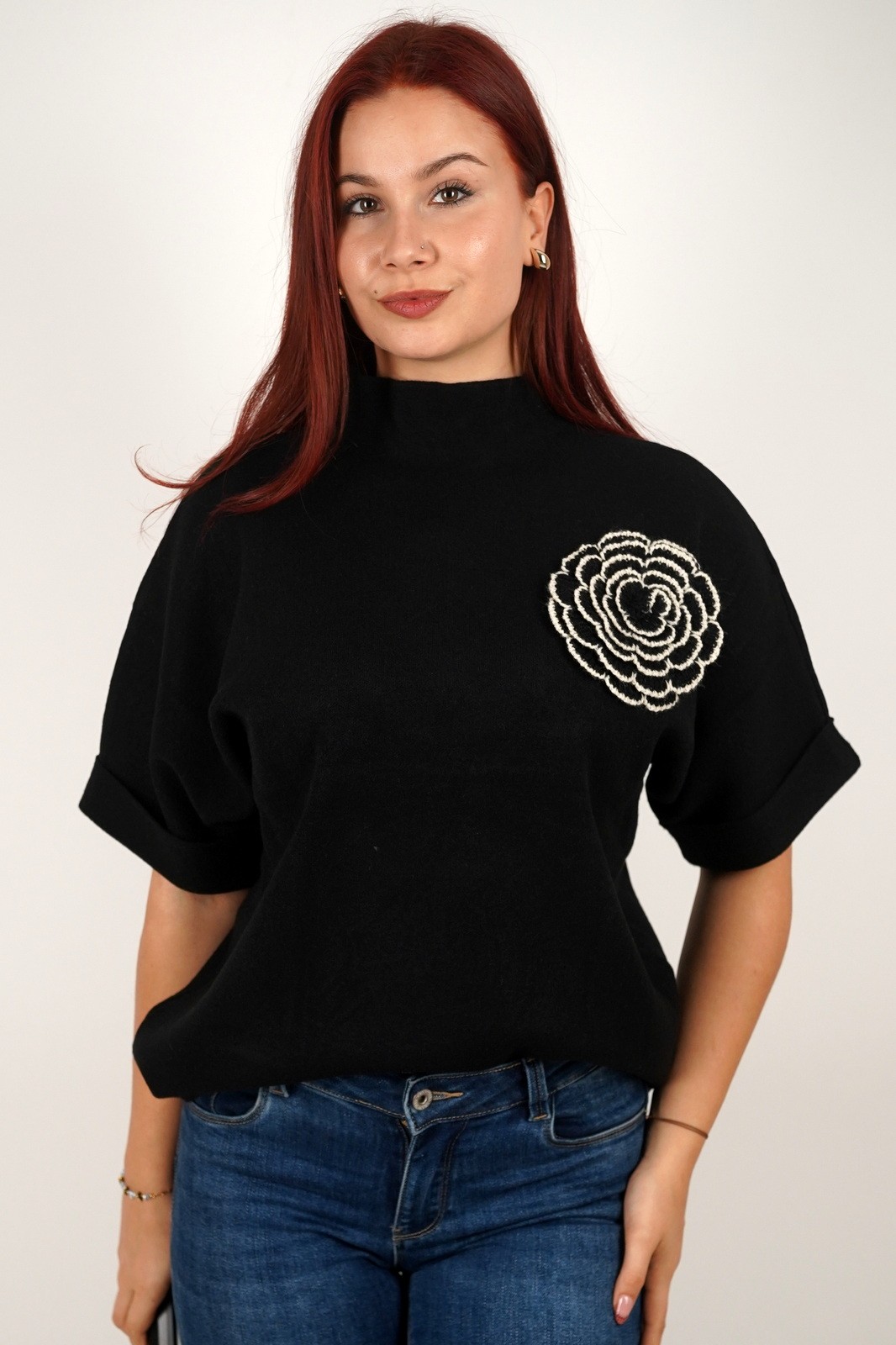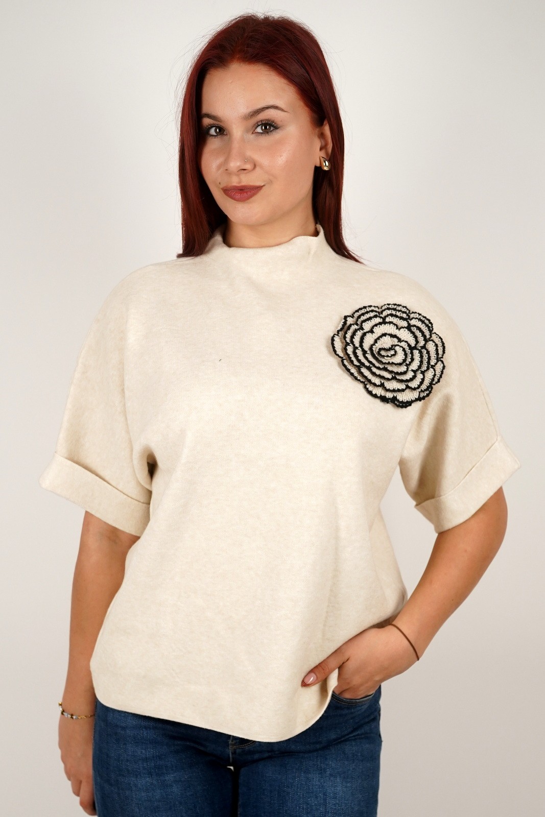 Ženska majica s ukrasnim cvijetom i kratkim rukavima – fino meko pletivo – u veličinama – 3978