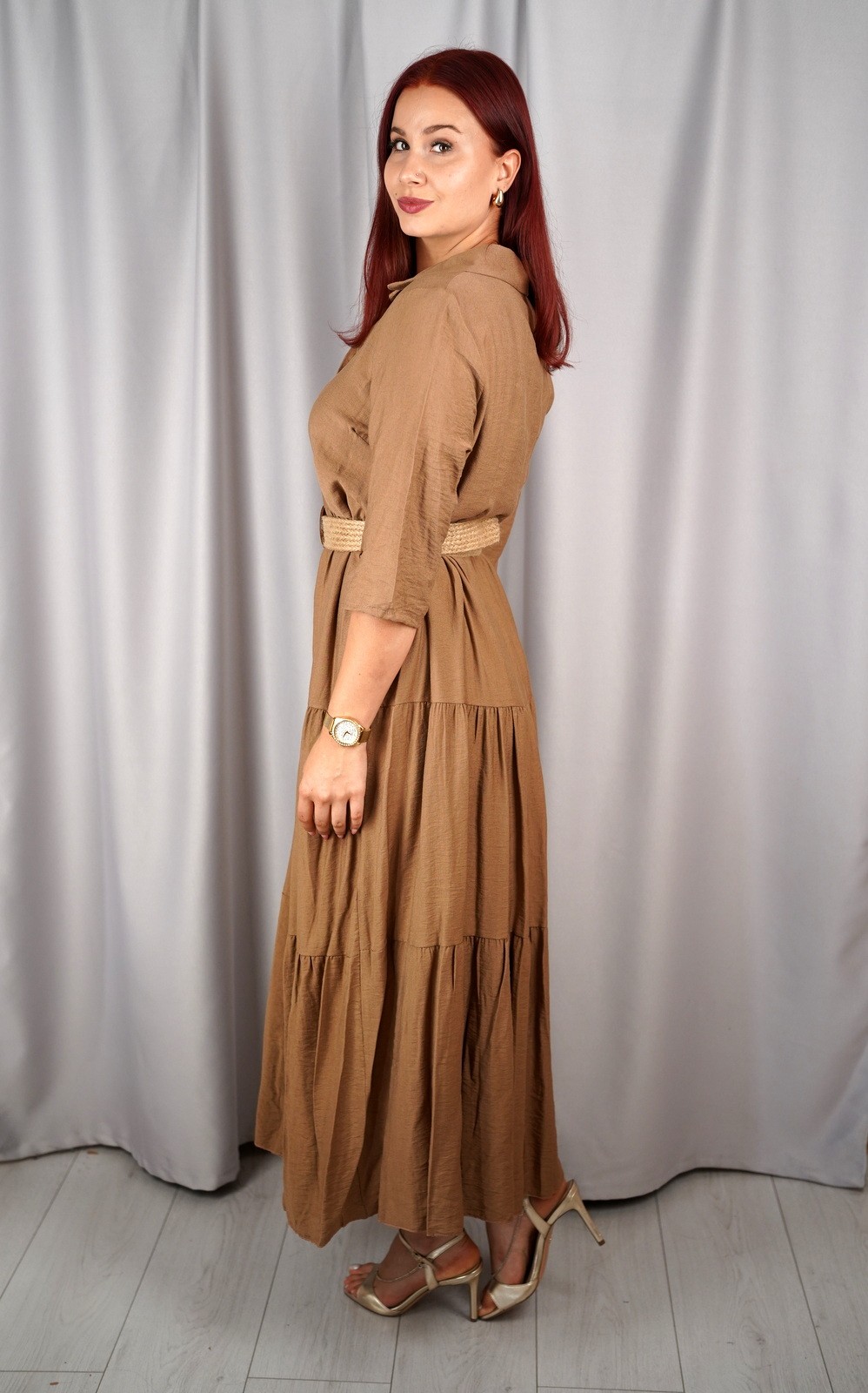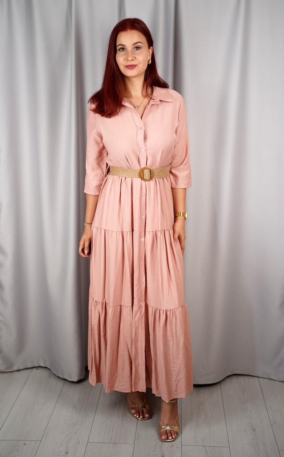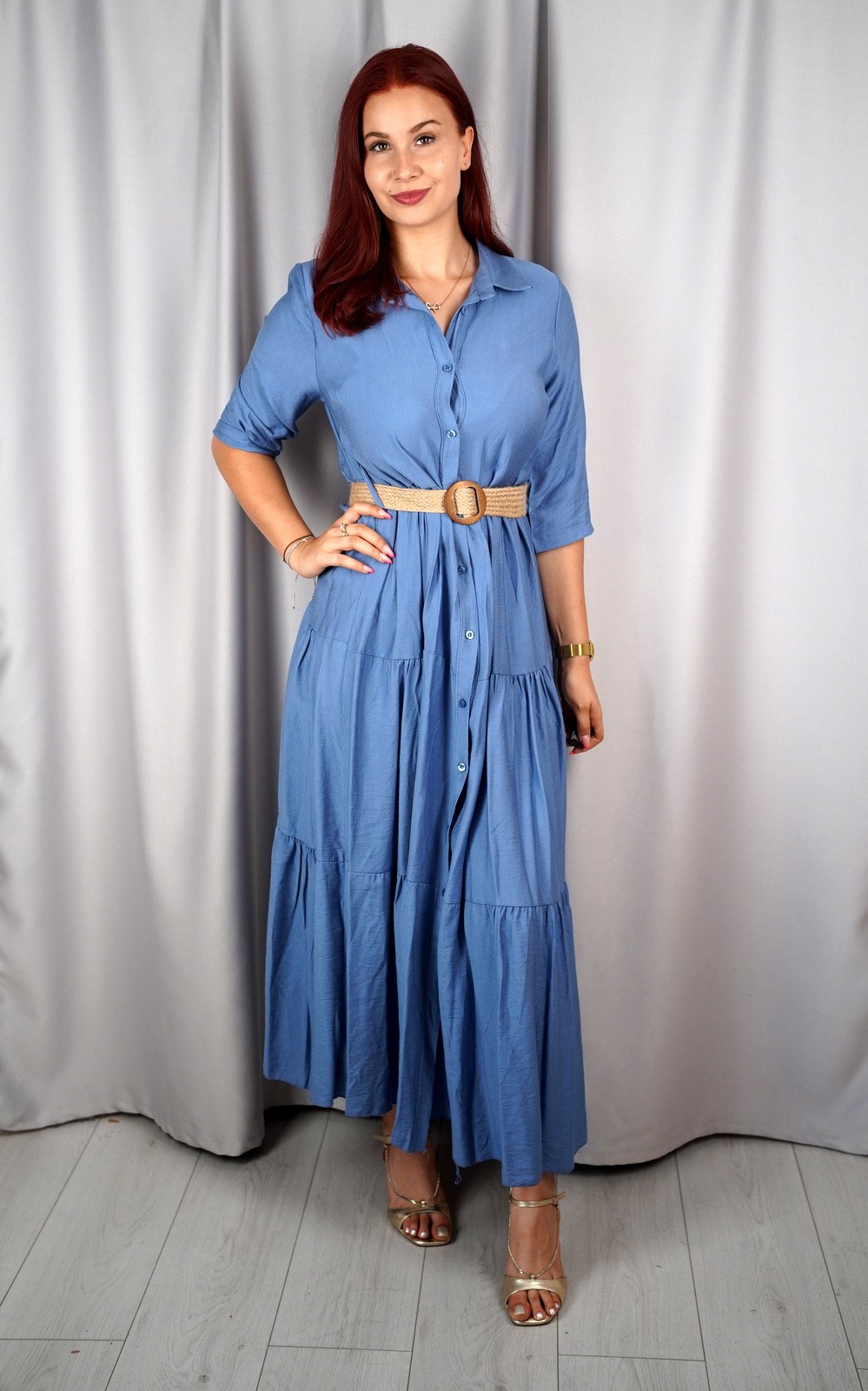 Maxi košulja haljina s gumbima i remenom donosi spoj elegancije i udobnosti u jednom odjevnom komadu. Njezin kroj s dugim slojevitim dijelovima stvara efekt lepršavosti i lakoće, dok gumbi cijelom dužinom omogućuju praktičnost i moderan izgled. Remen u struku naglašava figuru i daje ženstvenu liniju, a 3/4 rukavi dodatno pridonose sofisticiranom dojmu. Zahvaljujući prozračnom materijalu, haljina je idealna za tople dane, ali i za poslovne ili ležerne prilike. Može se nositi uz sandale za opušten izgled ili uz elegantne cipele i modne dodatke za svečanije trenutke.
