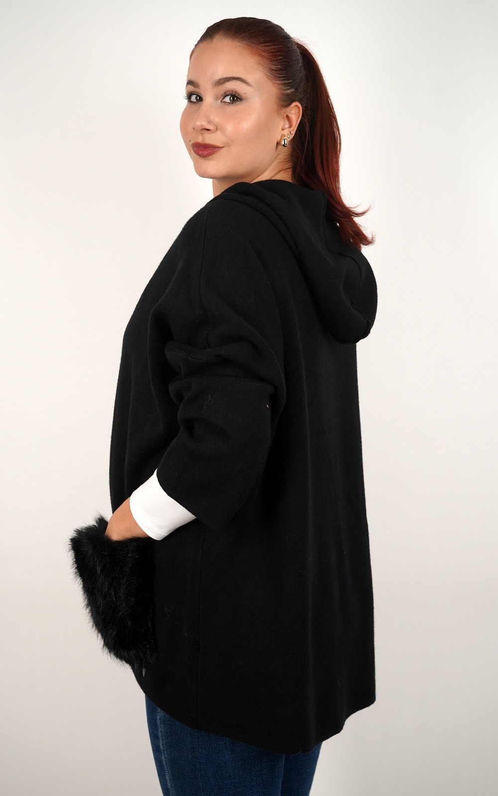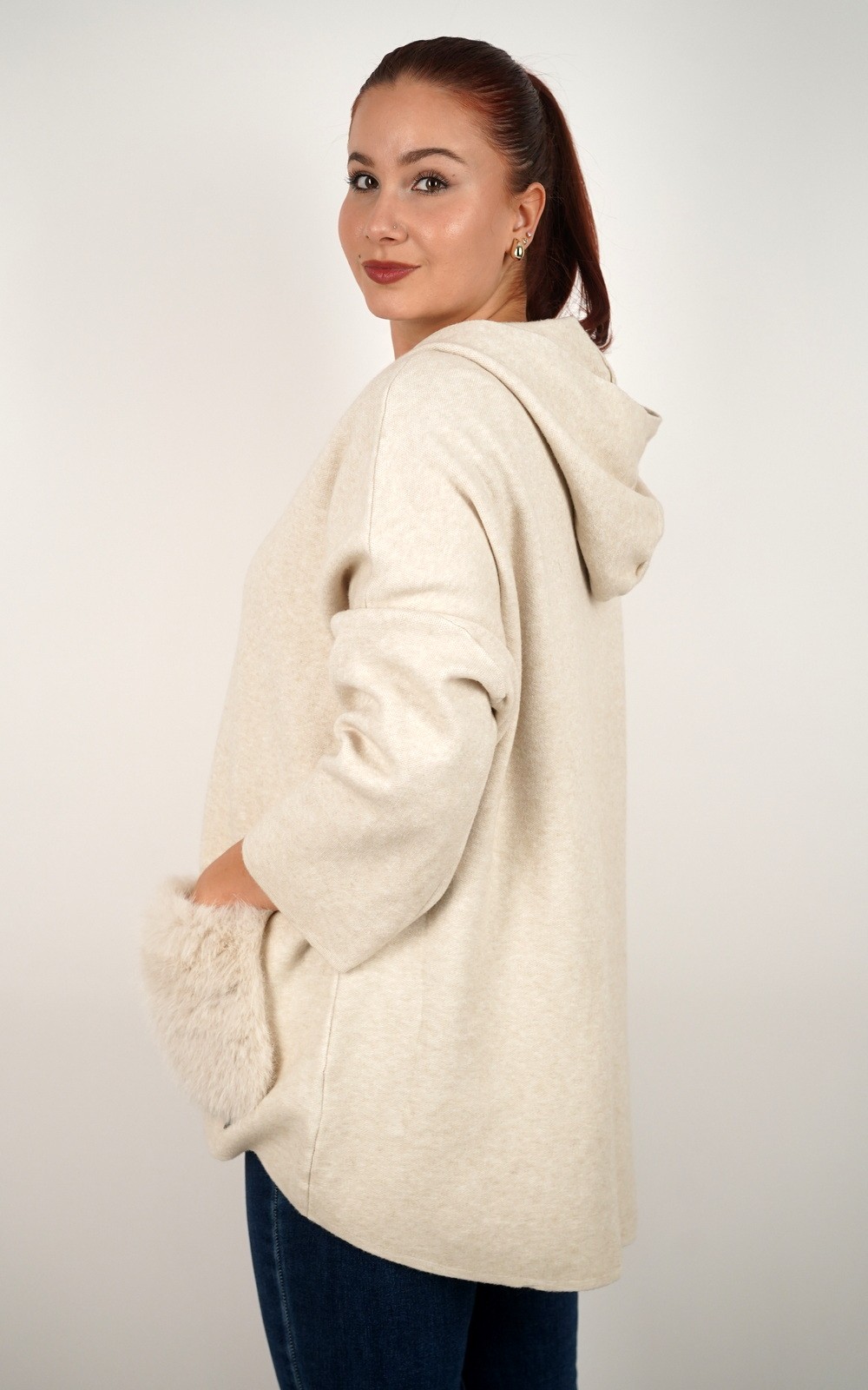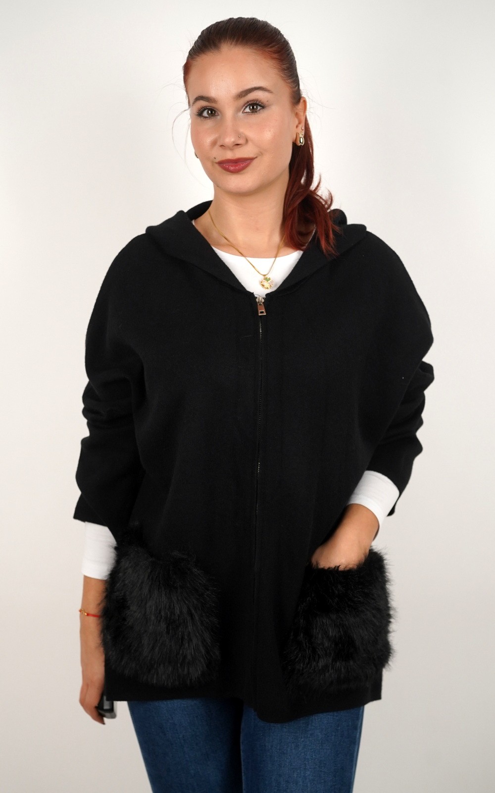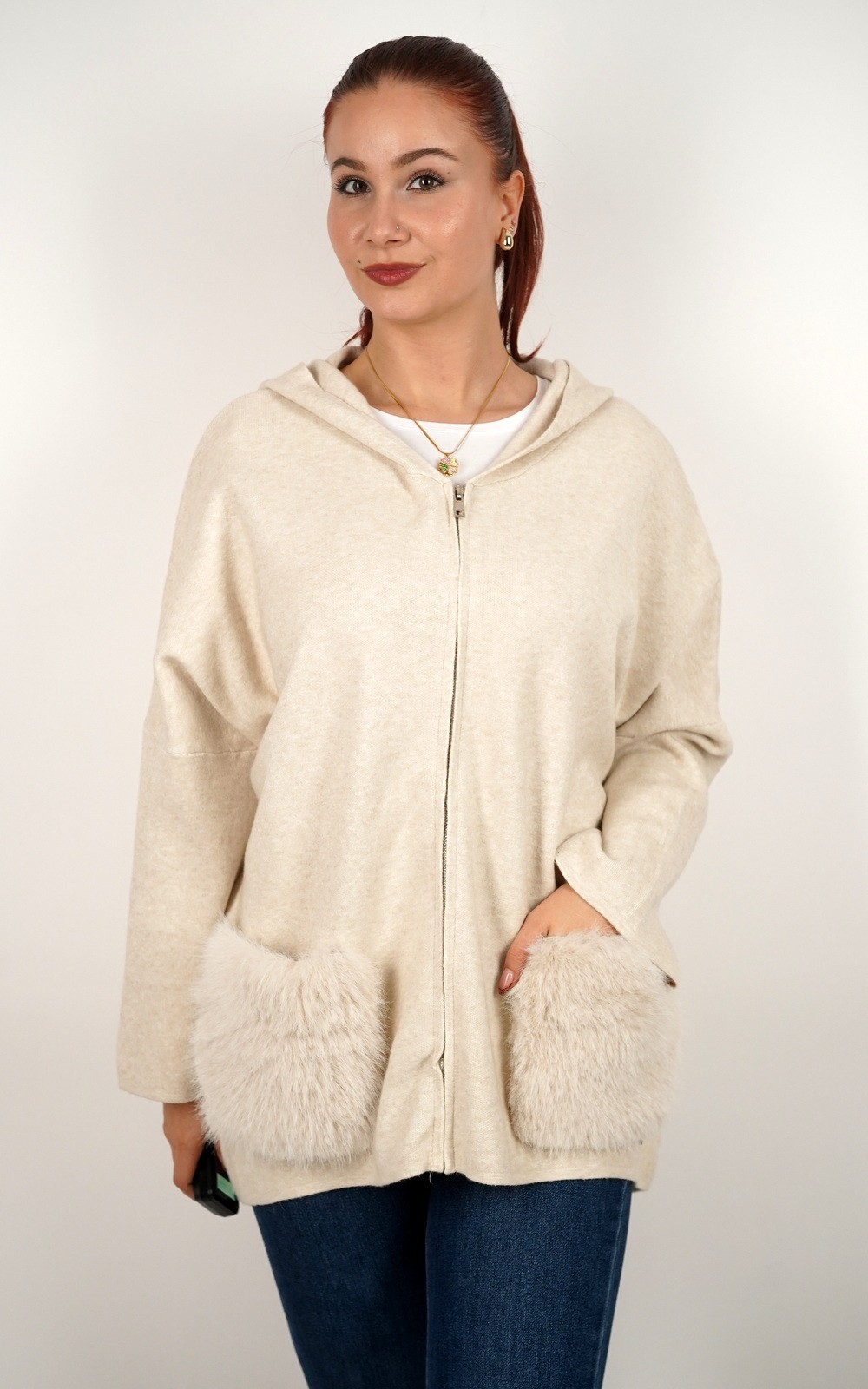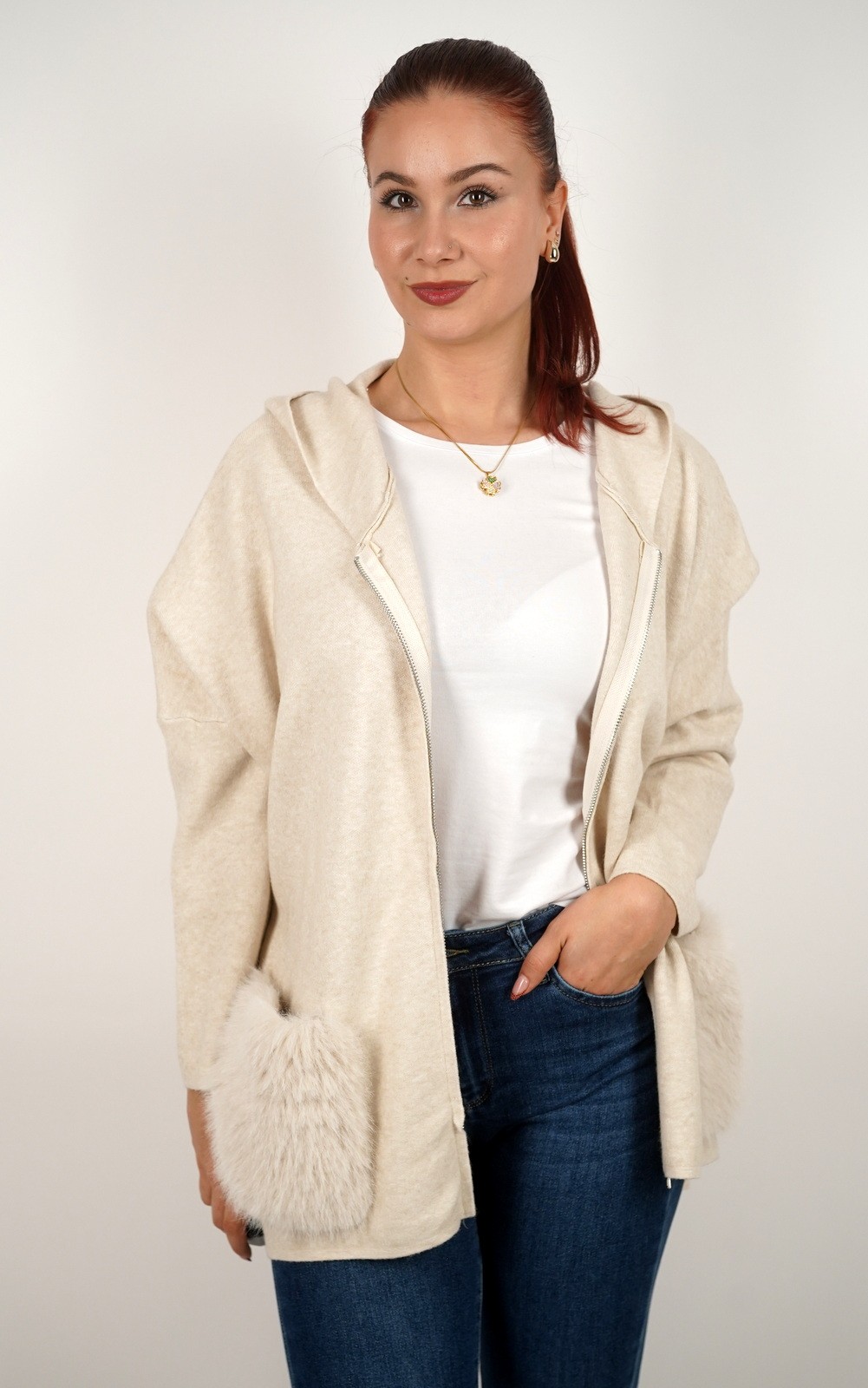 Ženska mekana jakna s kapuljačom i krznenim džepovima – ART:12061