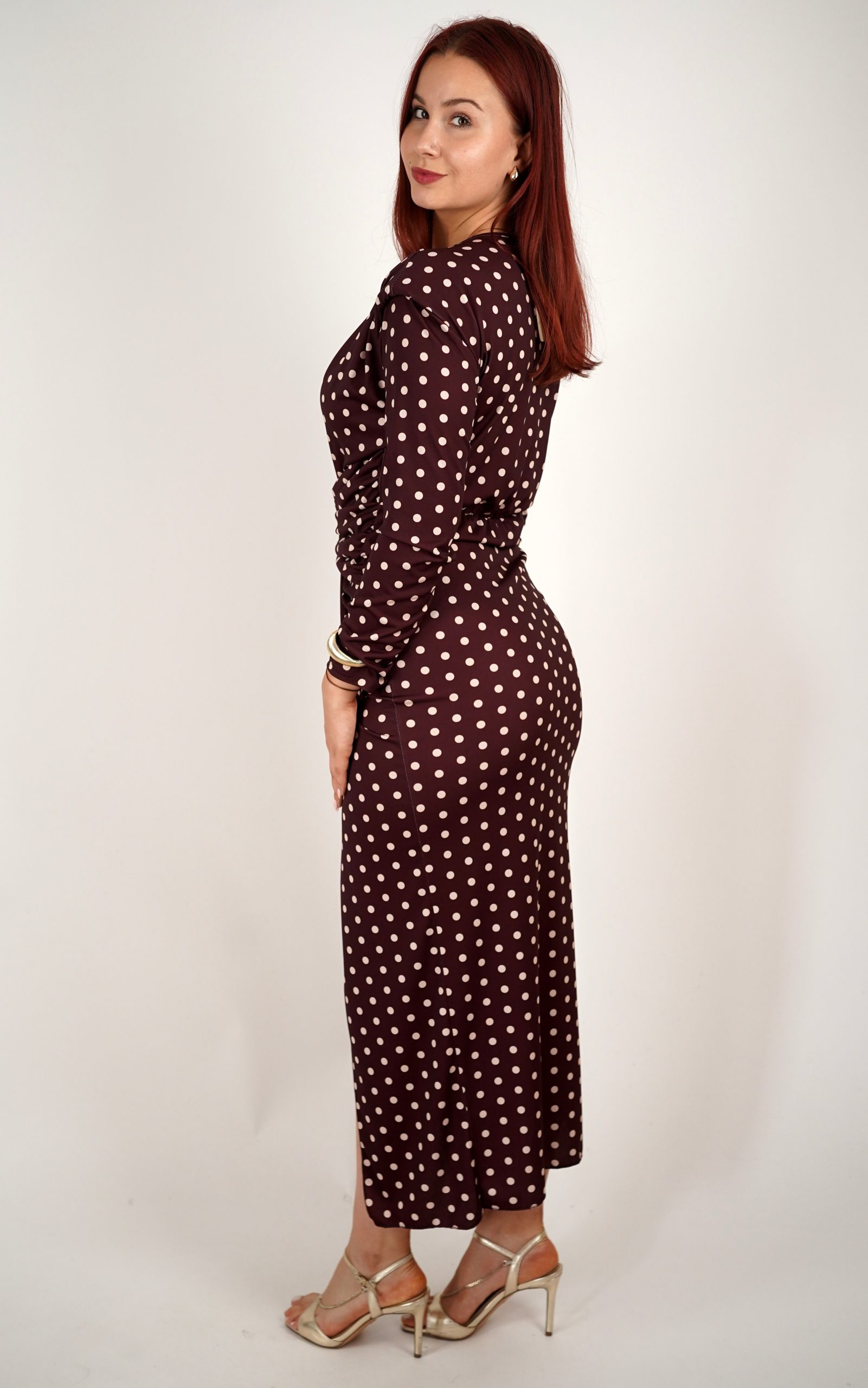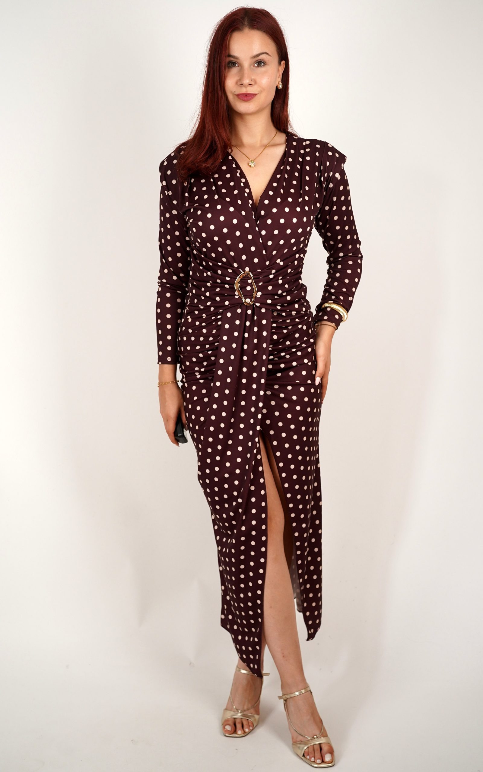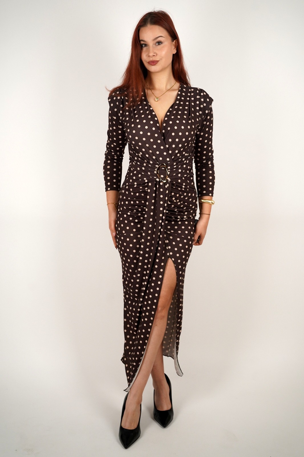 Ženska midi haljina s točkicama, remenom i prorezom sprijeda – 21625