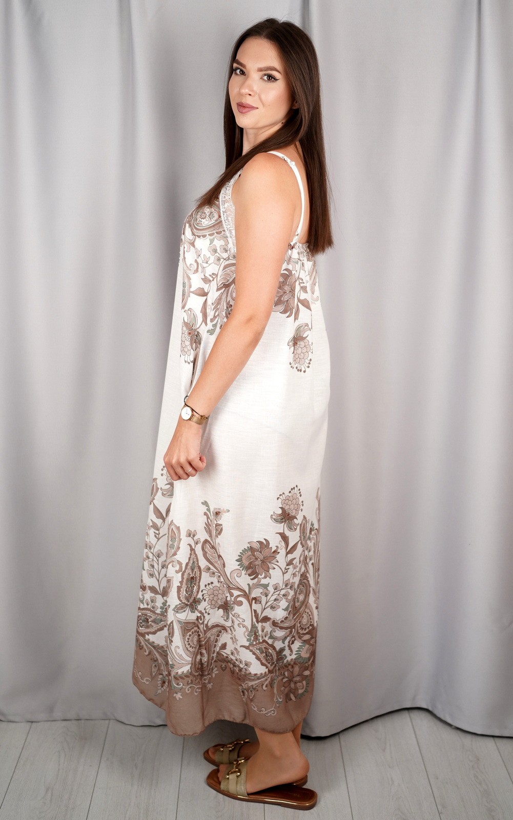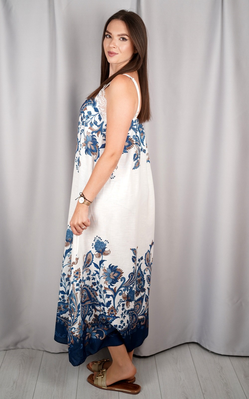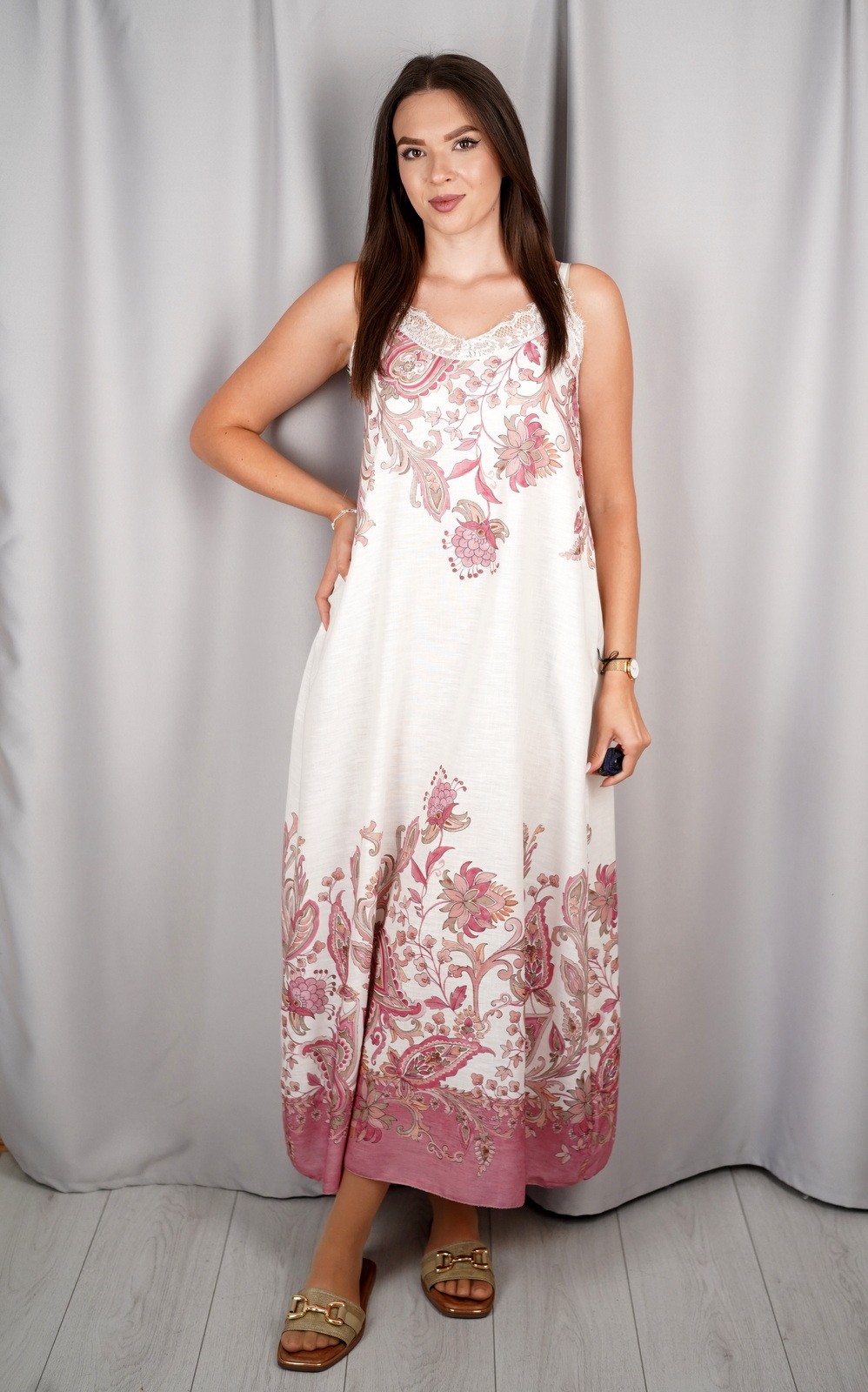 Ova prekrasna maxi haljina donosi savršen spoj udobnosti i boemskog šarma. Lepršavi kroj i lagan materijal pružaju osjećaj slobode i prozračnosti, dok čipkasti detalj na dekolteu unosi nježnost i ženstvenost. Orijentalni uzorak smješten uz rub i gornji dio haljine stvara dojam elegancije i unikatnosti. Zahvaljujući bretelama i opuštenoj silueti, idealna je za ljetne dane, šetnje uz obalu, putovanja ili opuštene večernje izlaske. Savršen izbor za žene koje vole spoj udobnog i sofisticiranog izgleda.