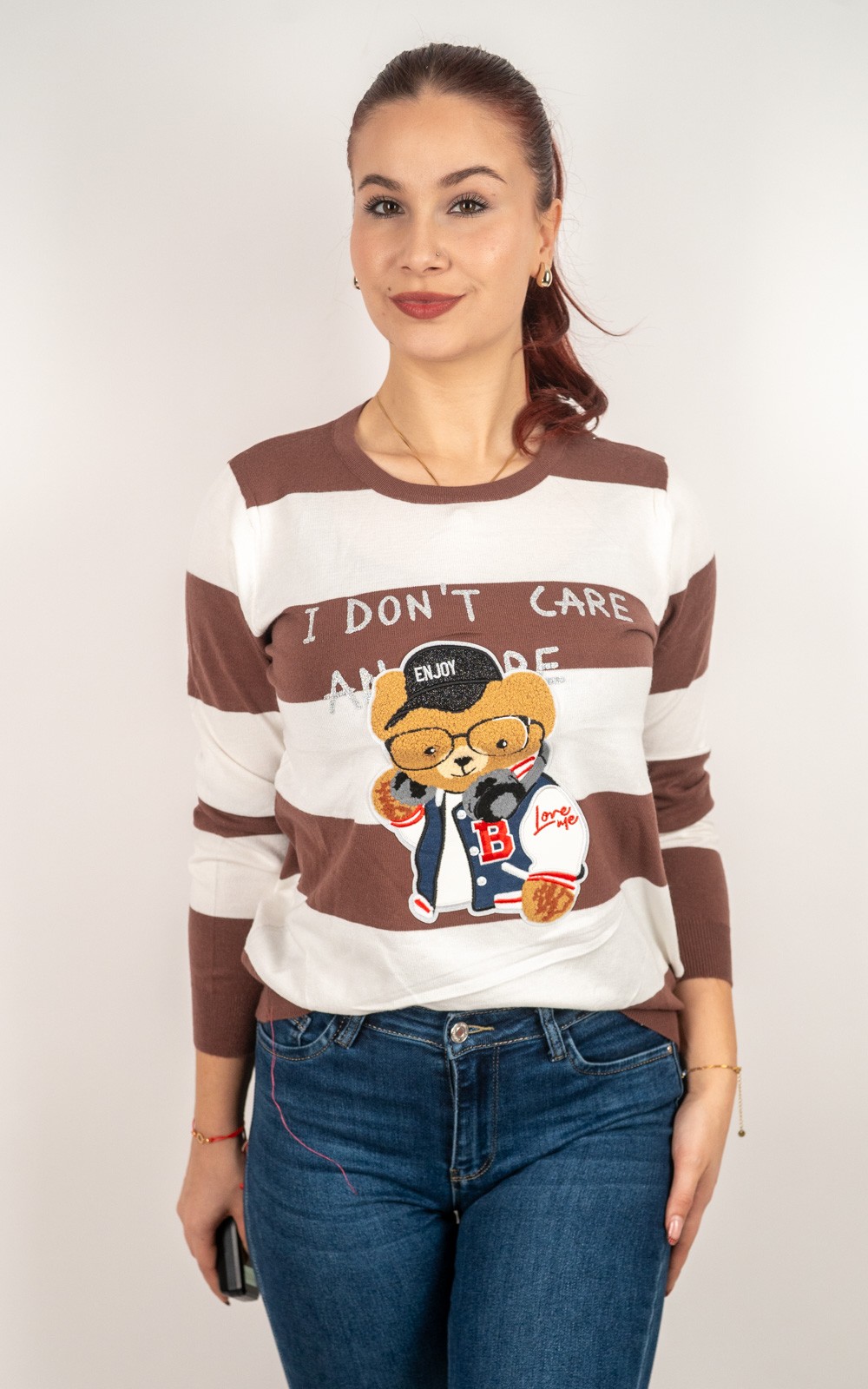 Ženska oversized prugasta majica s 3D medvjedić aplikacijom i natpisom – 25542
