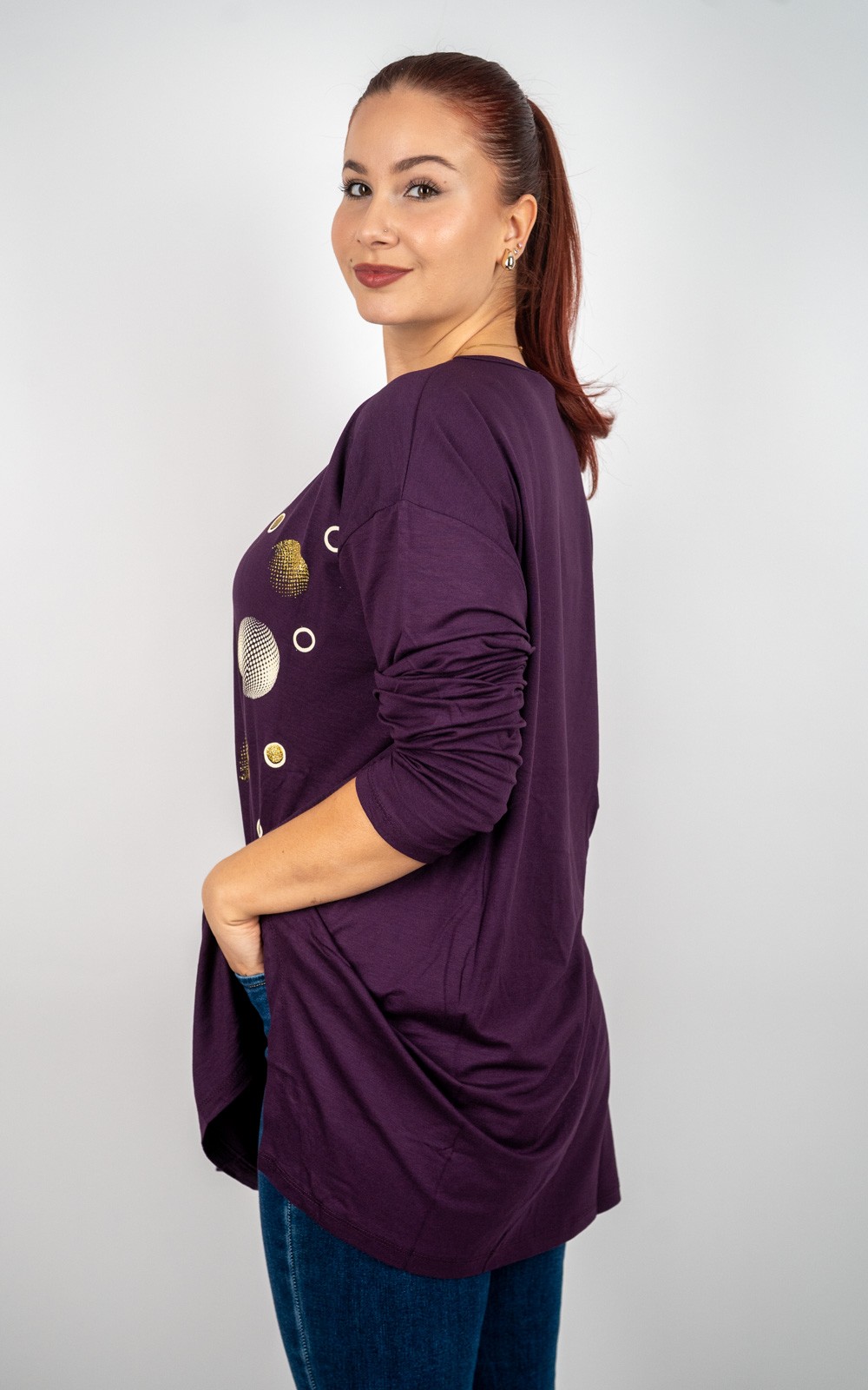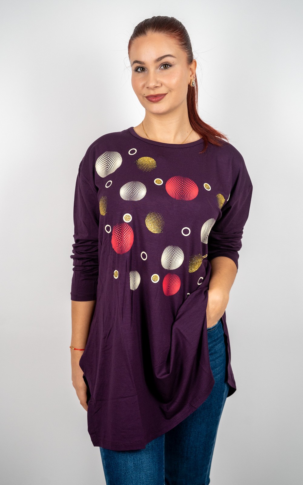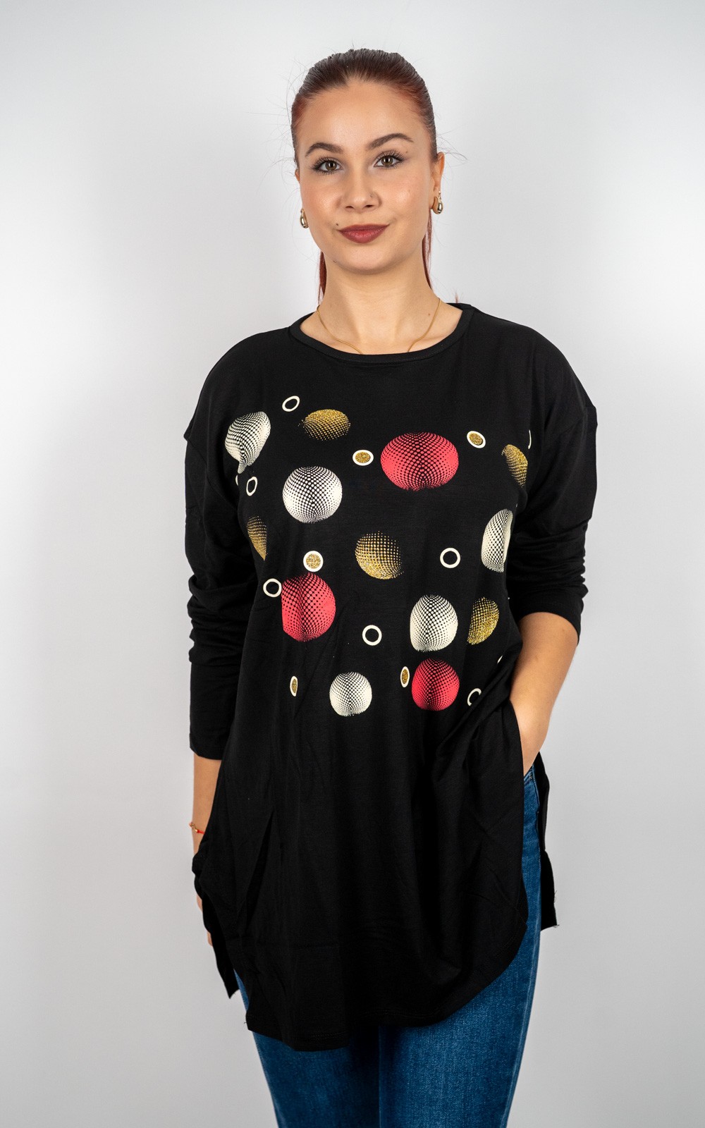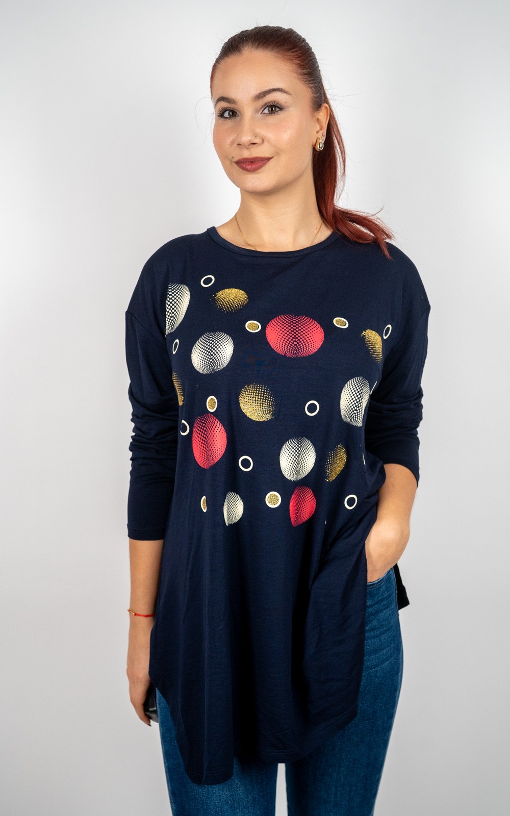 bozic10 očekuje te snižena cijena od 13.50 € za ovaj artikl u košarici.Ova ženska tunika s ukrasnim krugovima savršen je spoj udobnosti i profinjenog stila.